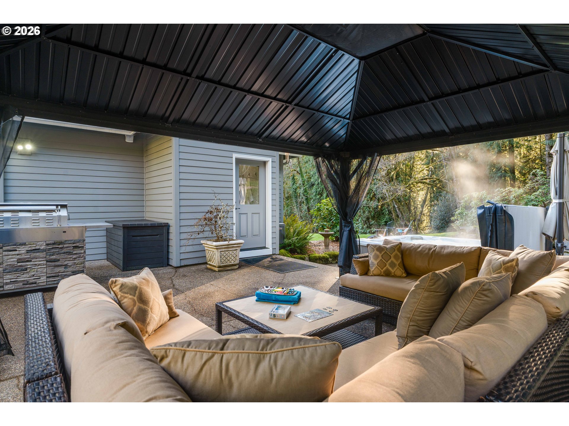 - A private bridge sets the tone as you arrive at this custom-designed Craftsman, tucked into 3 wooded acres with a year-round creek. This tranquil retreat offers the rare blend of peaceful country living and everyday convenience, just 15 minutes from Hwy 26. Supremely private and serene, it’s an ideal refuge for those seeking space, nature, and restorative calm. Inside, the home is meticulously maintained and thoughtfully designed for elevated main-level living. The expansive great room is anchored by a dramatic floor-to-ceiling stone fireplace and framed by walls of windows that flood the home with natural light while capturing tranquil woodland views. At the heart of the home, the entertainer’s kitchen features a massive island, extensive slab granite surfaces, high-end appliances, multiple pantries, and abundant storage. Seamlessly connected to a large dining area, it transitions effortlessly to the outdoor patio retreat with BBQ station, all-season aluminum gazebo, and hot tub — perfect for gatherings or quiet stargazing. Designed for flexibility and comfort, the home offers exceptional multigenerational living potential with two main-level suites on opposite wings. The luxurious primary retreat includes heated tile floors, a spa-inspired shower, indoor sauna, and expansive walk-in closet. A second ensuite with heated floors and private entry provides cozy independence for guests or extended living. Upstairs, a spacious bonus room, craft or fitness space, and additional bedroom or office create endless possibilities. Outside, enjoy the private creek, greenhouse, outbuilding, and fenced garden area. For added peace of mind, the residence features a whole-home fire-suppression sprinkler system with a 500-gallon storage tank. Every detail reflects quality craftsmanship and intentional design — a private sanctuary where nature, luxury, and lifestyle converge.