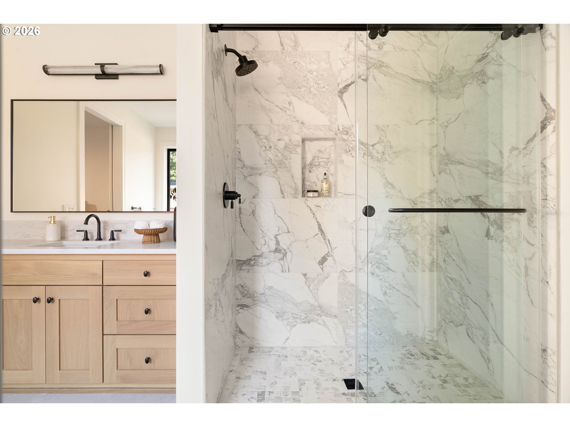 - Set in Portland’s desirable Montclair neighborhood, this newly constructed residence pairs timeless architecture with modern comfort & everyday convenience. Montclair is known for its strong sense of community & is ideally located in Washington County, just a short stroll to Portland Golf Club, Oregon Episcopal School (OES), and New Seasons Market, with Jesuit High School & the new Raleigh Hills Elementary nearby. Downtown Portland, Nike, Intel, and the Sunset Corridor are all within easy reach. The main living areas unfold in a light-filled open layout designed for both everyday comfort & elevated entertaining. The living room features built-in cabinetry, beamed ceilings, and expansive sliding doors that open to the outdoor living spaces. At the heart of the home, the kitchen pairs quartz surfaces with premium appliances, including a BlueStar 6-burner range, a Fulgor Milano oven, a Sub-Zero built-in refrigerator, and a Miele dishwasher. The dining area features a built-in hutch with a Sub-Zero wine refrigerator, while a butler’s pantry provides storage & prep space. Two dedicated offices provide exceptional flexibility for work-from-home living. One office includes built-in bookshelves, while the second features a built-in desk. The main-level primary offers a private retreat with a spacious walk-in closet featuring a custom organization system & a spa bath with heated tile floors, a soaking tub, and a walk-in shower with dual heads. A separate guest suite on the main level includes its own walk-in closet & full bathroom. Upstairs, 3 additional bedrooms provide flexible living space, including one large room that can function as a bonus or playroom. Outdoor living is designed for year-round enjoyment, with a partially covered patio featuring a built-in fireplace, outdoor ceiling fan, built-in heaters, and gas plumbing for a future BBQ. Additional features include dual-zone HVAC systems, a central vacuum, and designer landscaping in progress (see attached plan).