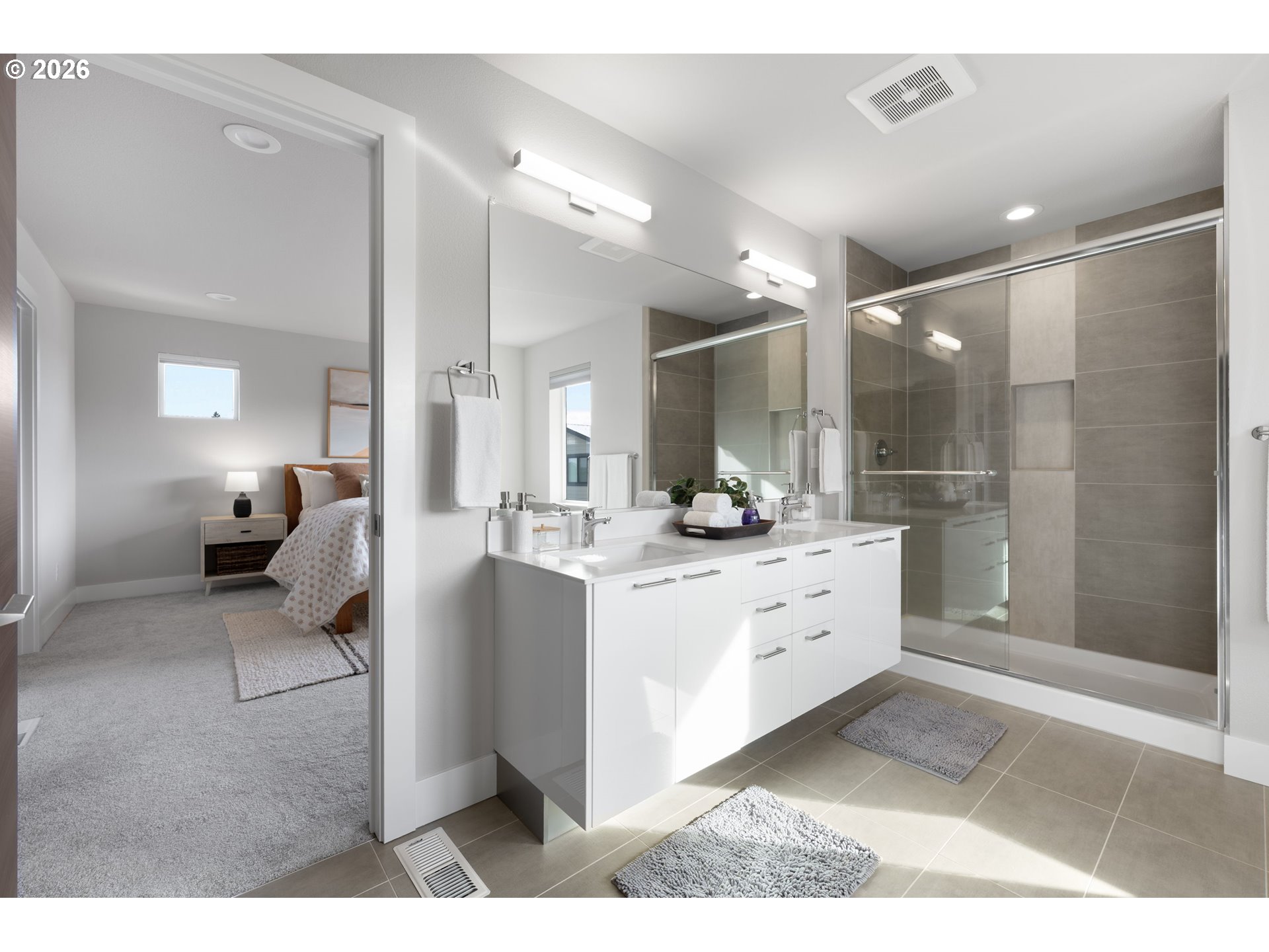 - This home presents as virtually new and showcases the refined Laurelwood floor plan by Ichijo, a builder celebrated for precision craftsmanship and elevated, energy-forward design. Light pours into the open-concept living spaces through expansive windows, creating a bright, airy feel throughout the 4-bedroom, 2.5-bath layout.The home has been lightly used as a second residence and remains in exceptional condition. Design-driven features—rare to find as standard—include self-closing piano-finish cabinetry with integrated organizers and pull-down shelving, sleek interior doors with magnetic door stops, dual sliding windows, and dual sliding closet doors that balance function with clean, modern aesthetics.High-performance, pre-assembled panel construction with integrated wall framing delivers outstanding comfort and efficiency, reducing energy costs by up to one-third. This Earth Advantage Platinum–certified home includes a heat pump with A/C, heat pump water heater, Mitusubishi thermostat, EV charger, and a contemporary electric fireplace anchoring the main living area.An oversized two-car garage offers generous storage. Custom window blinds are installed throughout. Residents enjoy access to the community clubhouse and pool.