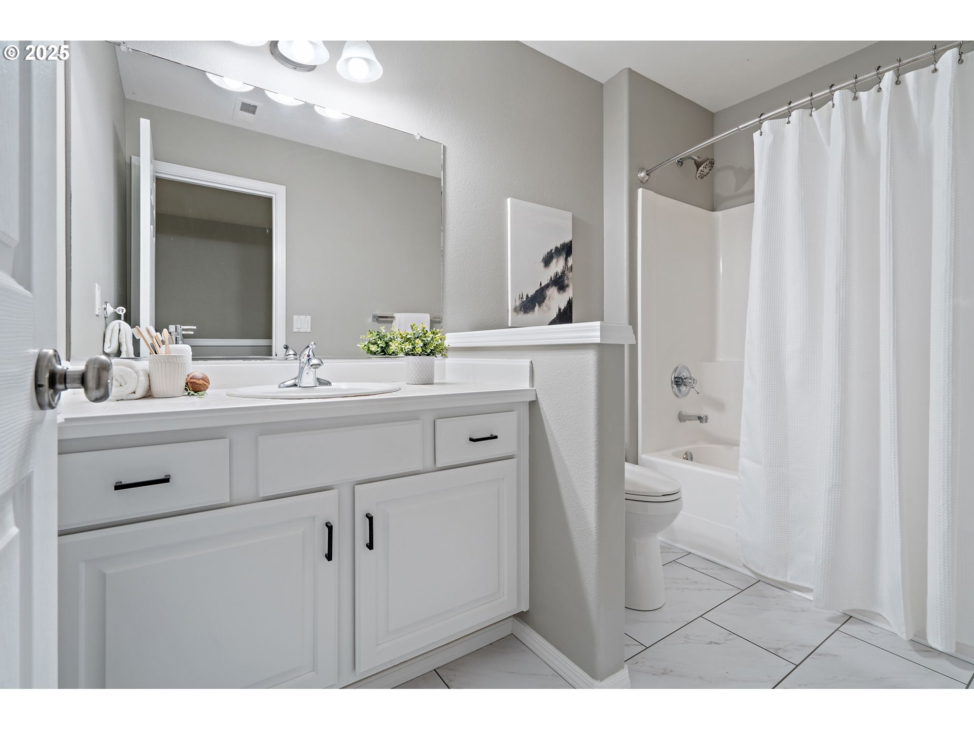 - Nestled in Eagles View on Bull Mountain, this spacious 5-bedroom, 2.5-bath home is truly move-in ready. Updates include new exterior & interior paint, new roof, new carpet, automatic blinds, beautiful kitchen remodel and fresh fixtures throughout. The two-story entry welcomes you with pristine chestnut hardwood flooring. With large windows, the living room feels bright and open, anchored by a gas fireplace with marble surround. The kitchen features quartz countertops, tile backsplash, smoky black stainless steel appliances, 5-burner gas range and a walk-in pantry. The adjacent nook opens to the deck with a view. A main level office, off of the entry, with built-ins and walk-in closet could be used as a 5th bedroom. And there’s a swanky laundry room with built-ins and barn-door pass-through between the kitchen and garage. Upstairs, you’ll find the spacious primary suite with a cozy sitting area, dual sinks, soaking tub, walk-in shower, and a walk-in closet. Three additional bedrooms plus a large open bonus room offer flexible lifestyle space upstairs. Central air, refurbished gas furnace, 2024 gas water heater, Hardie Plank siding, and new composition roof & gutters in 2025. Located on a corner view lot just one block from the active neighborhood park in a sought-after school district.