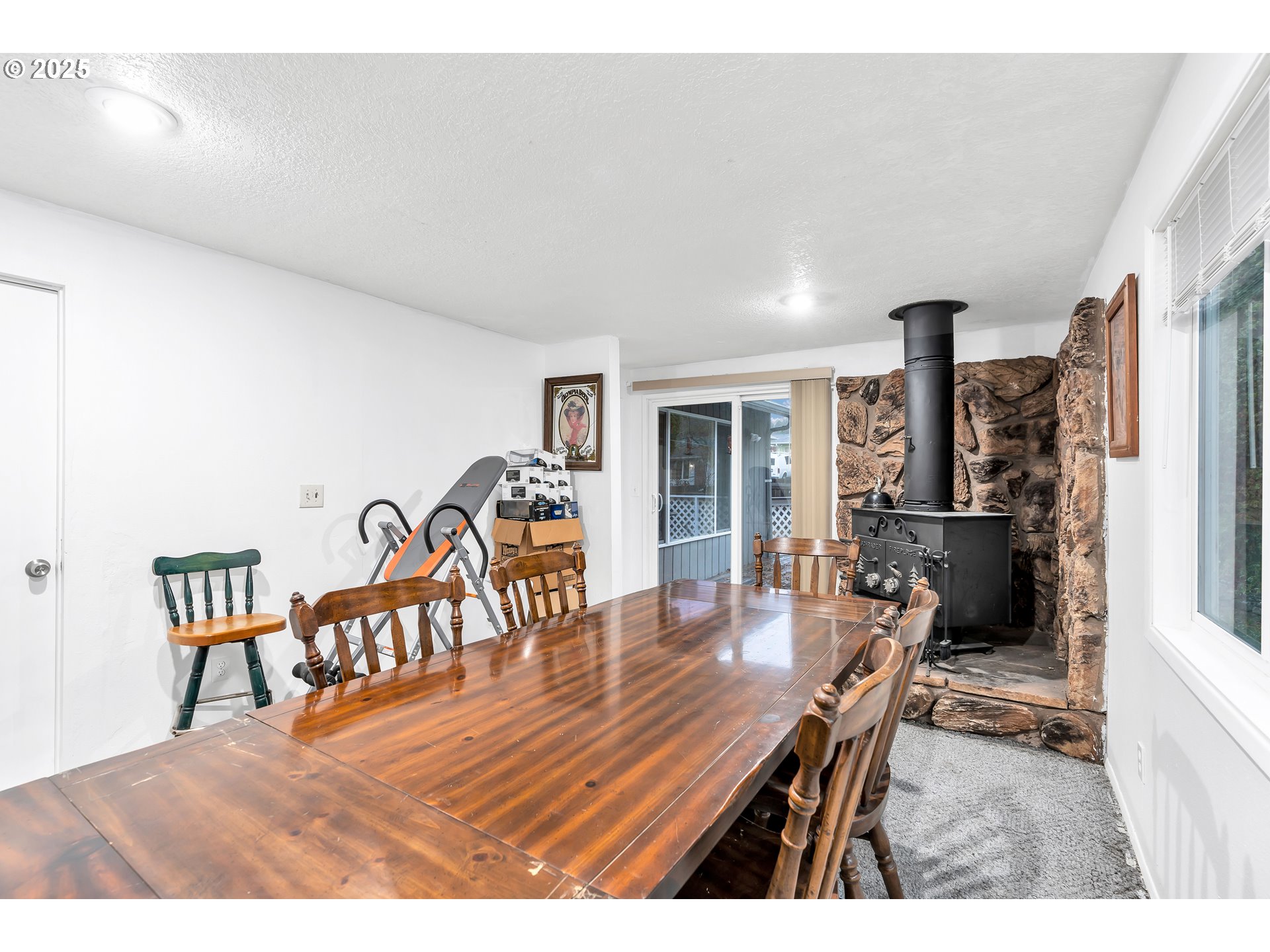 - Charming single-level home with 3 spacious bedrooms and multiple living areas. The living room features wall-to-wall carpet, a fireplace, and oversized windows that fill the space with natural light. The L-shaped kitchen and dining area boast laminate flooring and an open-concept layout, perfect for cooking and entertaining. A cozy family room with wall-to-wall carpet, wood-burning stove, oversized window, and sliding doors opens to a back deck. All bedrooms are generously sized, with the primary suite offering a ceiling fan, oversized window, and ensuite bath with walk-in shower. Additional features include washer and dryer hookups in the garage and a large fenced backyard—ideal for relaxing or entertaining.
