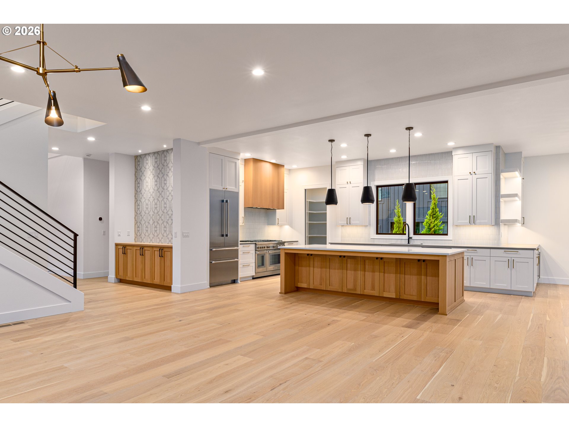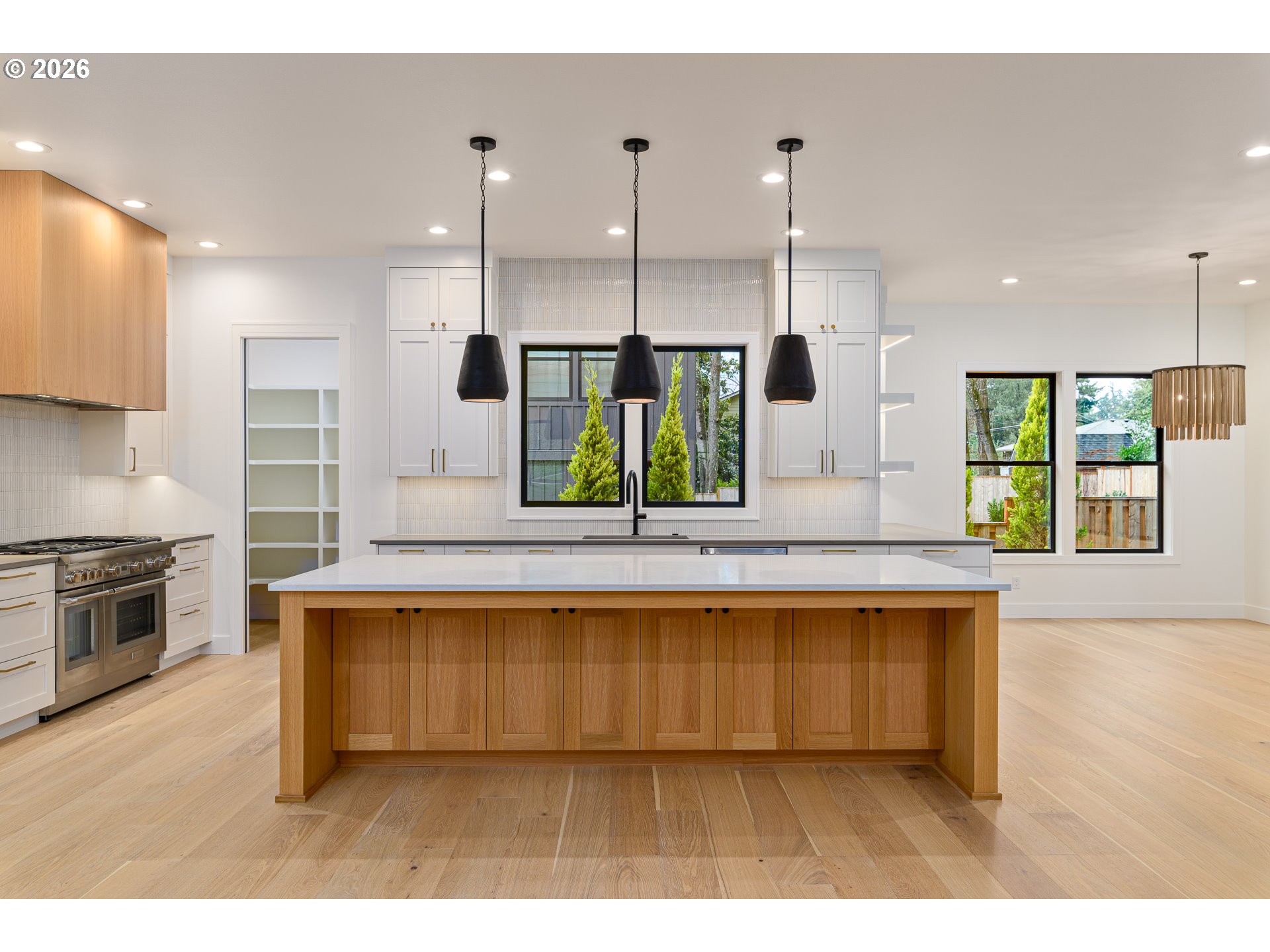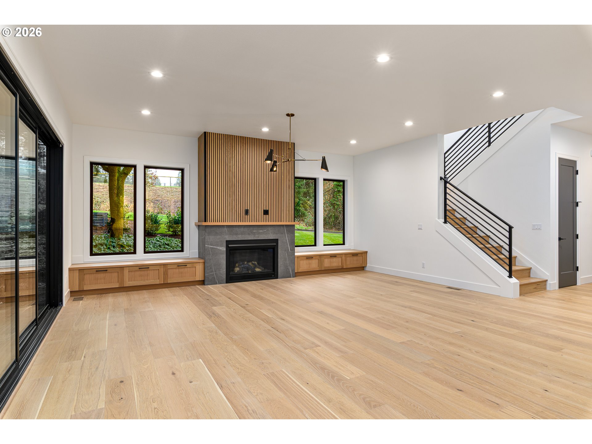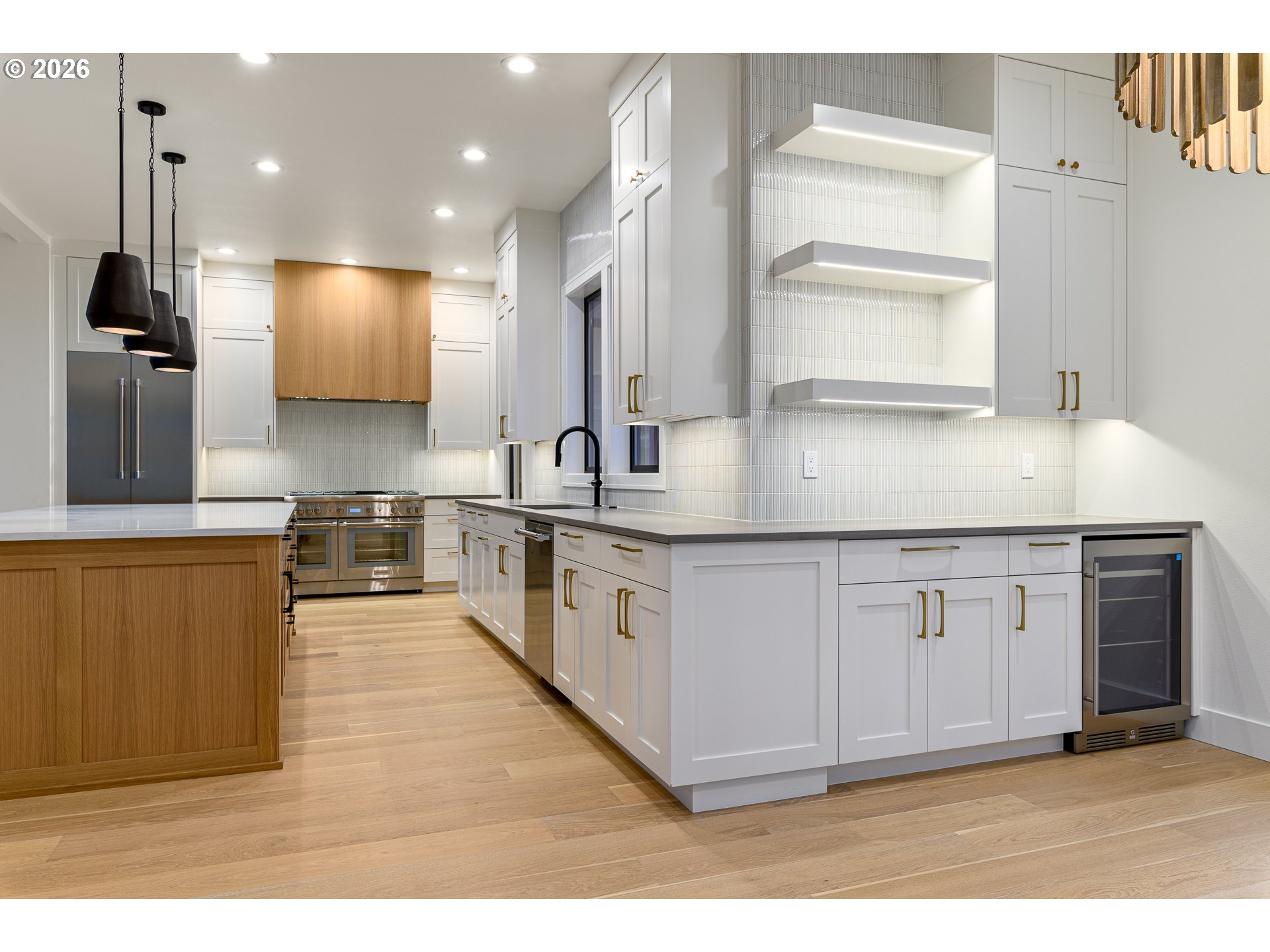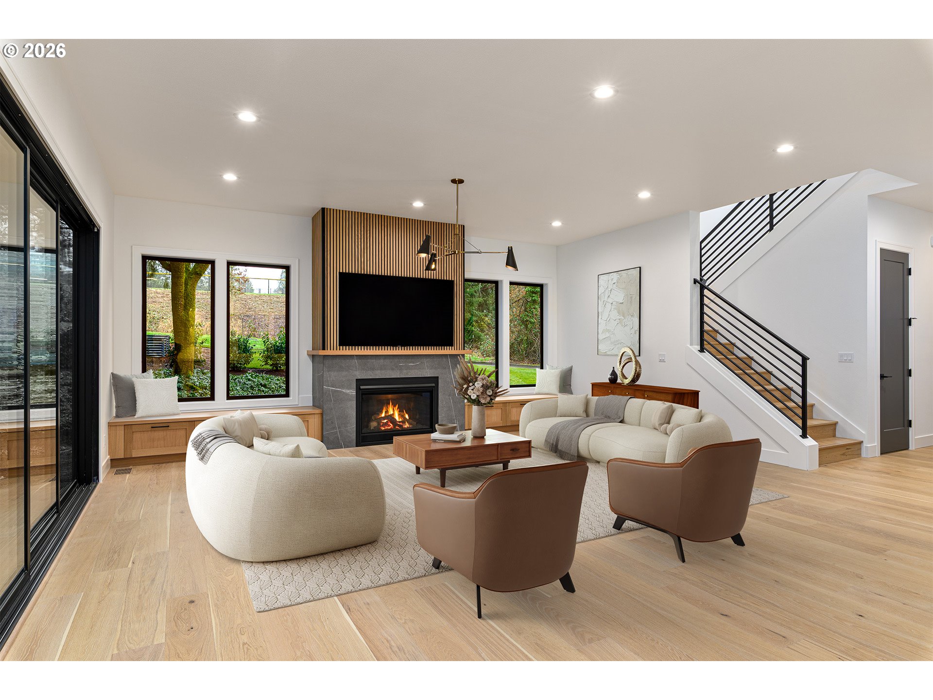 - Another Architectural Masterpiece in Lake Oswego by Renowned Builder BP Properties. This stunning NW Contemporary home in the desirable Palisades neighborhood blends modern design with natural elegance. Featuring 5 bedrooms, 4 baths—including two ensuite bedrooms in addition to the luxurious primary suite—this home offers exceptional space and comfort. Crafted with a mix of cedar and metal-accented composition roofing, the exterior makes a bold, timeless statement. Inside, the gourmet kitchen showcases white cabinetry, a white oak island, quartz countertops, and seamless flow into the open living areas. Engineered hardwood floors run throughout, complemented by dramatic slat wall accents in the foyer and great room. The sun-drenched interior features oversized windows and a multi-panel slider leading to a covered outdoor patio with an open-flame fireplace—perfect for year-round entertaining. The primary suite boasts heated floors, a soaking tub, and custom tile with quartz finishes. Bonus features include an oversized vaulted laundry room with chandelier, glass-panel garage door, and beautifully landscaped yard with hardscaping and in-ground sprinklers. Just minutes to the new Lake Oswego Recreation & Aquatic Center, top-rated schools, and parks.