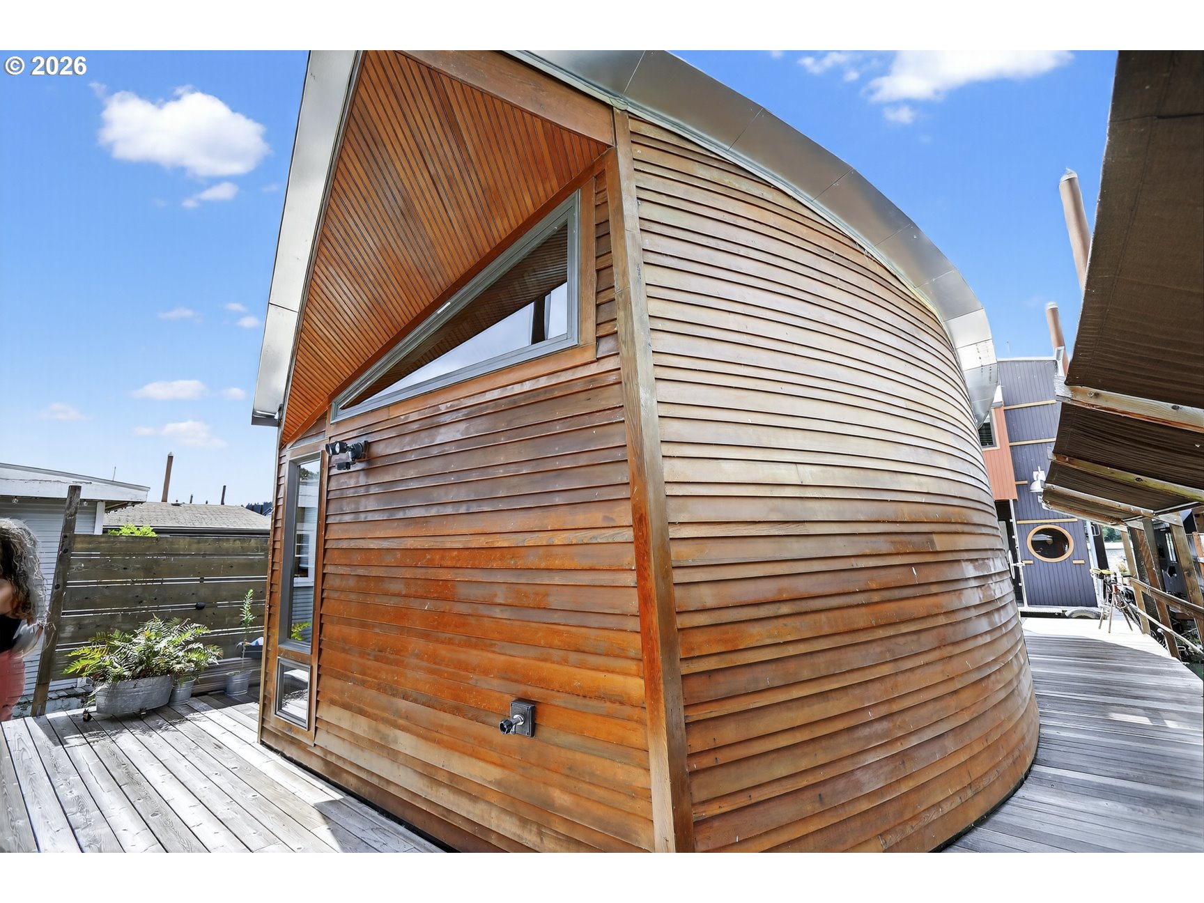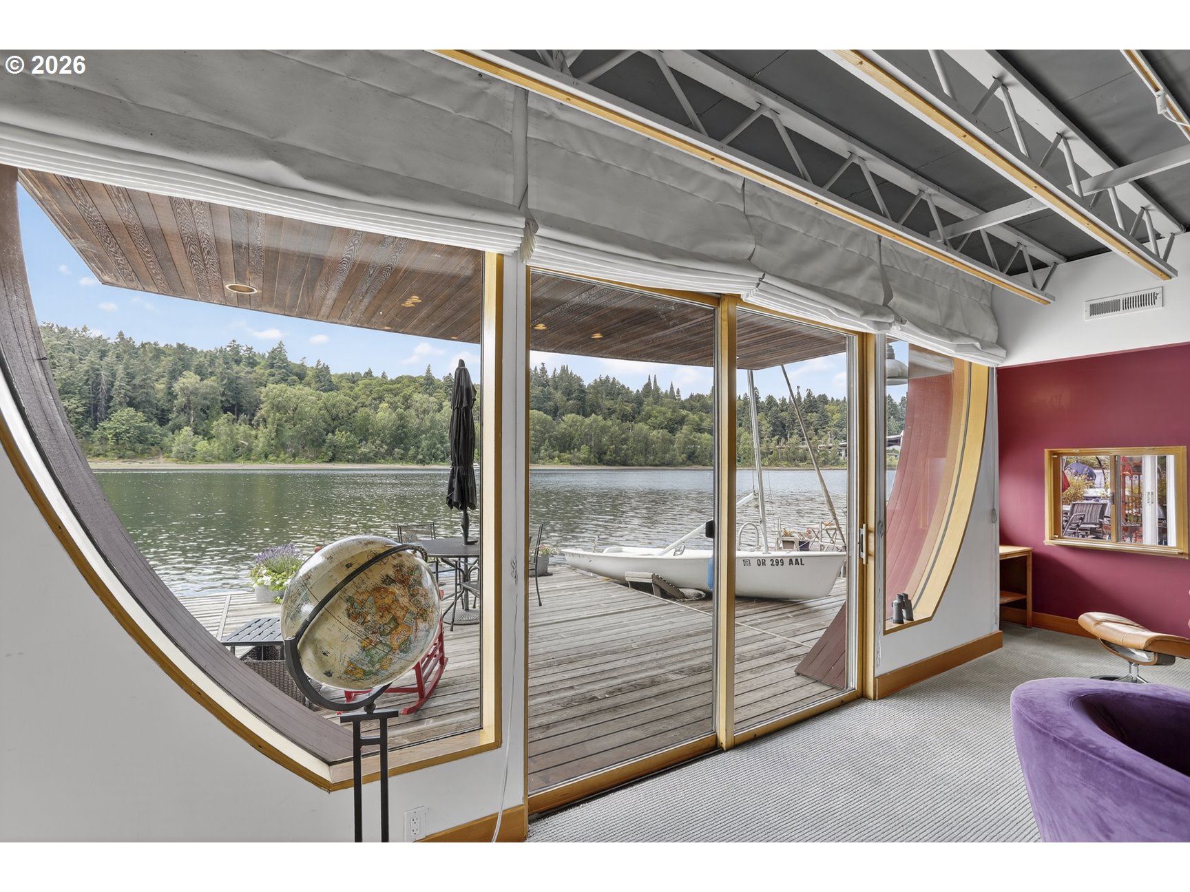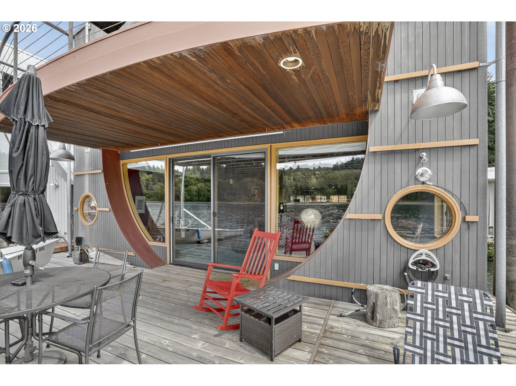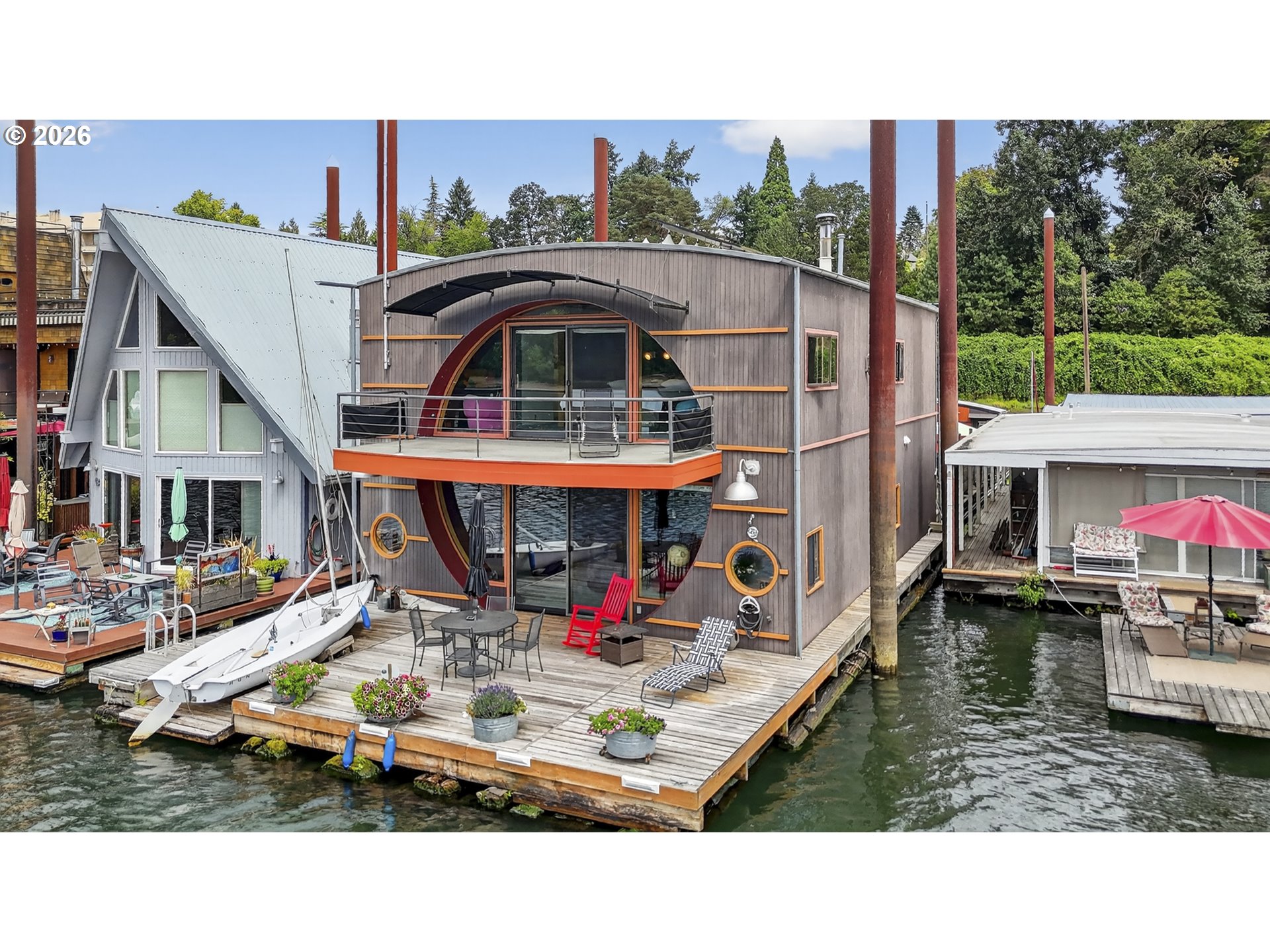 - A once in a lifetime opportunity to own a custom 1-off Architect designed & occupied floating home; never before to splash down on the open market! Secure your space in the lowest turnover moorage in the PNW. The history rich Portland Rowing club is THE most walkable moorage, a few short blocks from the bustling Sellwood neighborhood, or find steps and pedaling just atop the gated/secured parking lot on the Springwater Trail. The concept pays homage to the epitome of floating home living, with nautical salutes & attention to detail around every corner & curve. Design elements, materials, surfaces, fixtures, & the flow of the home all blend seamlessly, portraying the concept from the mind of the renown, award winning, local designer & architect, Richard Lakeman. The primary residence showcases grand scale shared spaces in a free flowing modernist plan with 2260sf of living space on 2 levels, and a main level great room concept that is near entirely open with river views from nearly every angle. At times referred to as "The Great Circle", the western facing wall showcases a glass circle 19' in diameter, bisected by the upper level for a commanding view & a focal point of Richard's design. Back lit acrylic steps to the sunken living room, an open industrial 10' high ceiling, clever nooks, a wood stove, & built in features are but a few highlights. Don't miss the glass panel floor above the kitchen; this watched pot shall never boil over with eyes on from office above! The upper level showcases a sweeping view & private balcony from the primary bedroom, huge walk in closet with massive skylight, & a soaking tub with river views if desired! Office built ins for when the work must be done and ample clever storage spaces. The round top styled ceiling was crafted with a CrissCraft-esque tucked vinyl & teak framework; another nod to the nautical. Your guests will enjoy one of the most unique & custom tender homes ever created, positioned behind an angled entry for privacy!