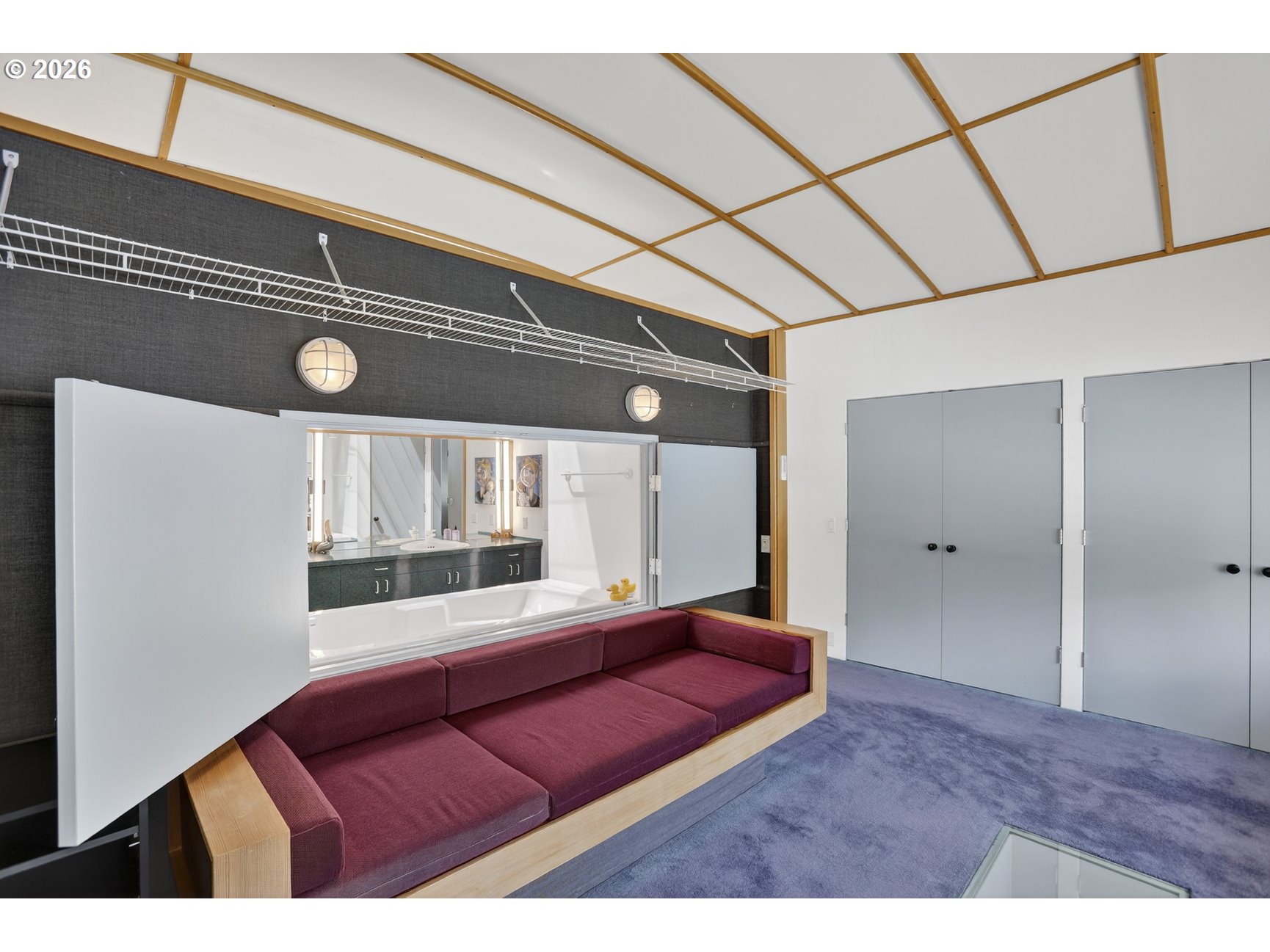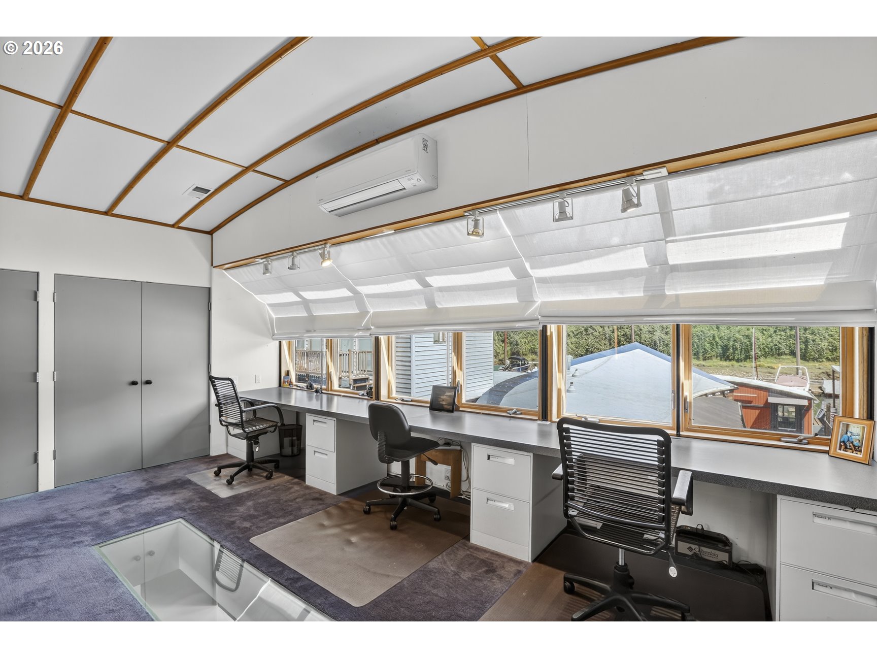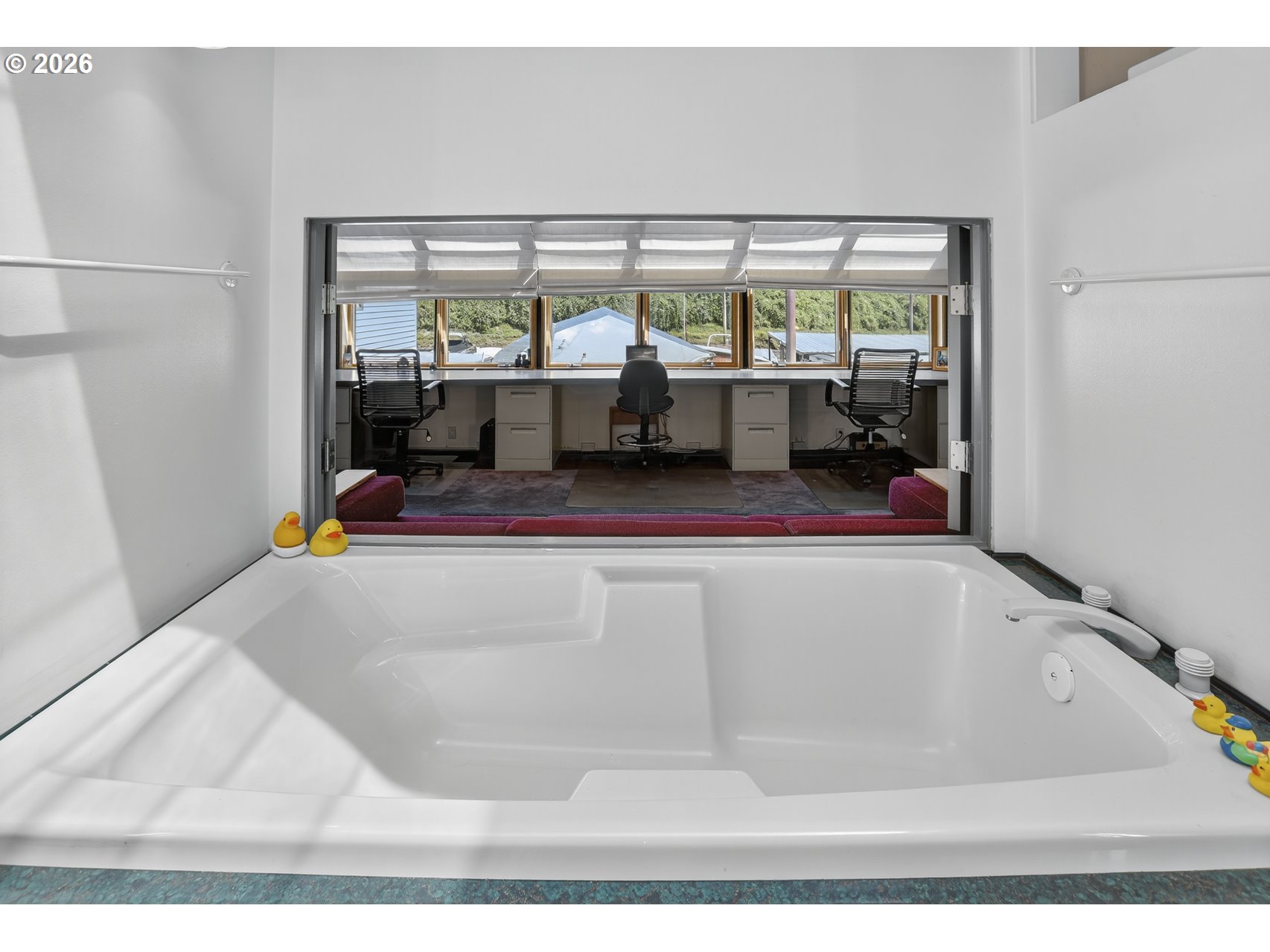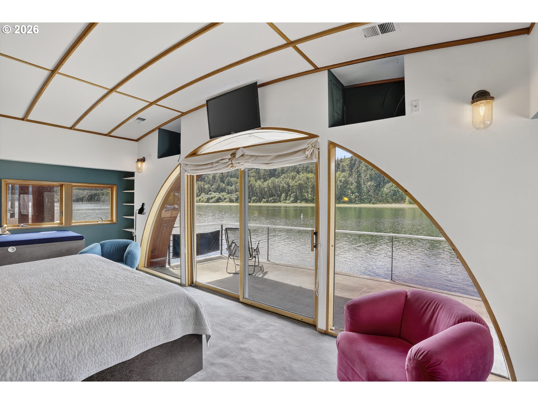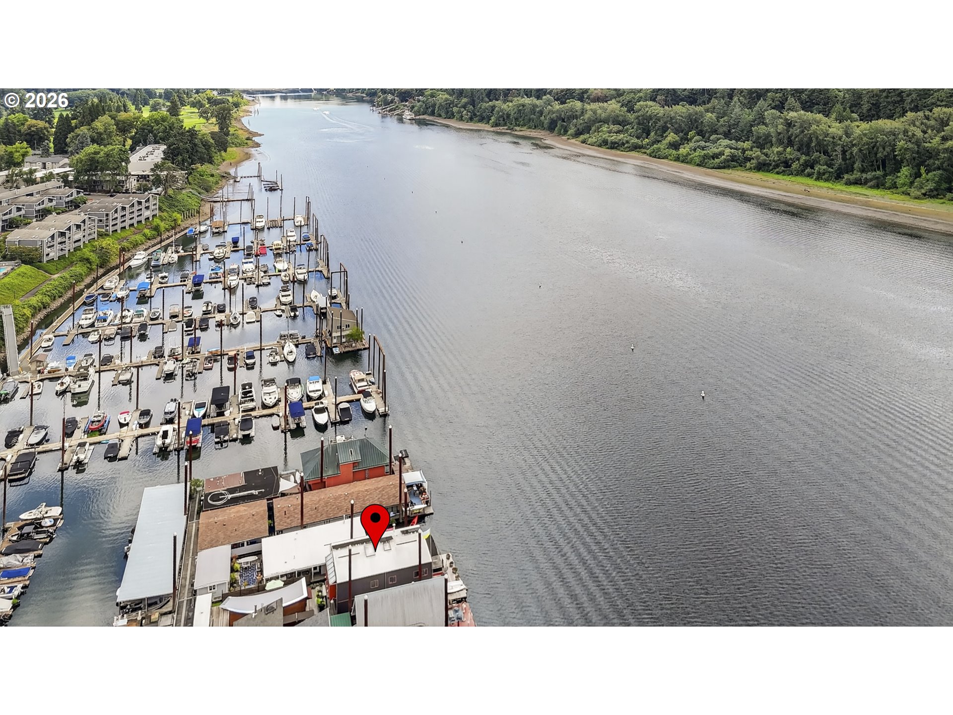 - A once in a lifetime opportunity to own a custom 1-off Architect designed & occupied floating home; never before to splash down on the open market! Secure your space in the lowest turnover moorage in the PNW. The history rich Portland Rowing club is THE most walkable moorage, a few short blocks from the bustling Sellwood neighborhood, or find steps and pedaling just atop the gated/secured parking lot on the Springwater Trail. The concept pays homage to the epitome of floating home living, with nautical salutes & attention to detail around every corner & curve. Design elements, materials, surfaces, fixtures, & the flow of the home all blend seamlessly, portraying the concept from the mind of the renown, award winning, local designer & architect, Richard Lakeman. The primary residence showcases grand scale shared spaces in a free flowing modernist plan with 2260sf of living space on 2 levels, and a main level great room concept that is near entirely open with river views from nearly every angle. At times referred to as "The Great Circle", the western facing wall showcases a glass circle 19' in diameter, bisected by the upper level for a commanding view & a focal point of Richard's design. Back lit acrylic steps to the sunken living room, an open industrial 10' high ceiling, clever nooks, a wood stove, & built in features are but a few highlights. Don't miss the glass panel floor above the kitchen; this watched pot shall never boil over with eyes on from office above! The upper level showcases a sweeping view & private balcony from the primary bedroom, huge walk in closet with massive skylight, & a soaking tub with river views if desired! Office built ins for when the work must be done and ample clever storage spaces. The round top styled ceiling was crafted with a CrissCraft-esque tucked vinyl & teak framework; another nod to the nautical. Your guests will enjoy one of the most unique & custom tender homes ever created, positioned behind an angled entry for privacy!
