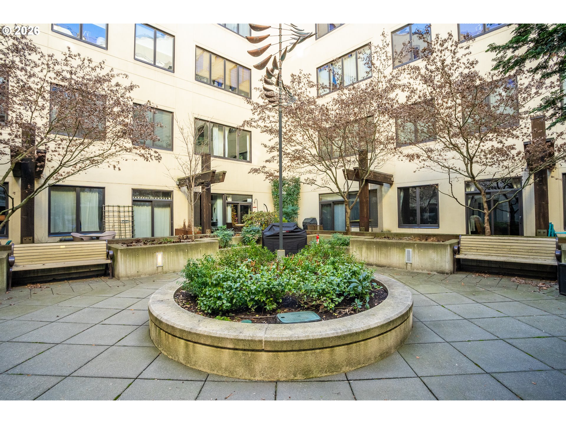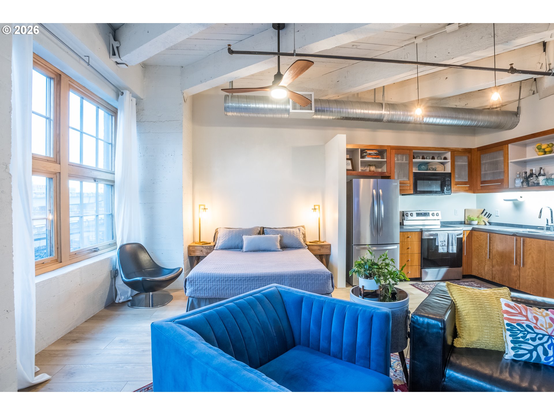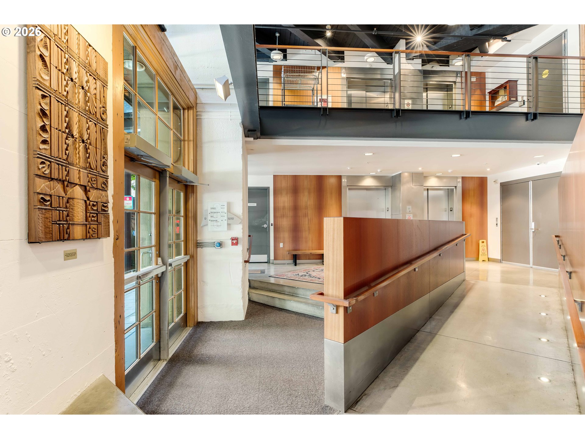 - Perched in the iconic Marshall Wells building, this light-filled studio lives large in the heart of the Pearl. Built in 1910 by the Marshall Wells Hardware Company and designed by noted architect Daniel Burnham, this National Register-listed warehouse was thoughtfully converted in the early 2000s into residential lofts that honor its unique heavy-timber structure and light-filled industrial design. High ceilings, exposed beams, columns and dramatic almost floor-to-ceiling windows define the space and flood the unit with natural light. #417 offers a smart, open layout with meaningful updates throughout. Recent improvements include new LVP flooring with sound-deadening underlayment (2022), a dedicated water branch shutoff (2023), new refrigerator (2023), new barely-used range and dishwasher (2024), new double-sink bathroom vanity (2024), and new ceiling fan (2025). West-facing windows capture glowing sunset views over the West Hills, while mature trees provide a welcome visual buffer from I-405 during the spring, summer, and fall. At the heart of the building is a 5,000 s.f. open-air courtyard, offering a welcoming place to gather with neighbors or enjoy a quiet moment outdoors. Plus, with a Walk Score of 98, Bike Score of 97, and Transit Score of 83, you're moments from some of Portland's best restaurants, cafés, shops, and grocery stores. Includes a full-size secure indoor deeded parking space. With an incredibly well-managed HOA and one of the Pearl's most storied buildings, this is a rare opportunity to own a true Portland classic that blends history, light, and livability.