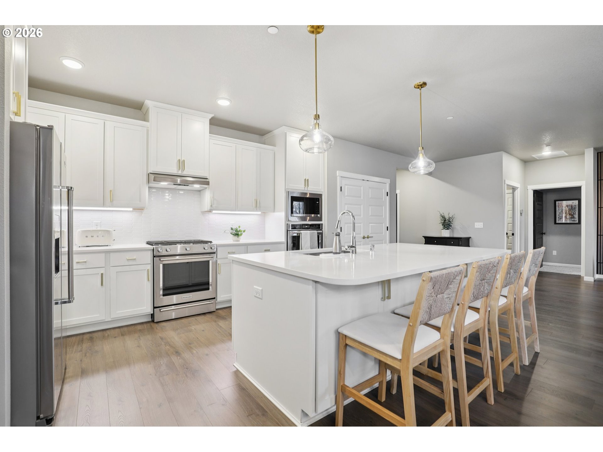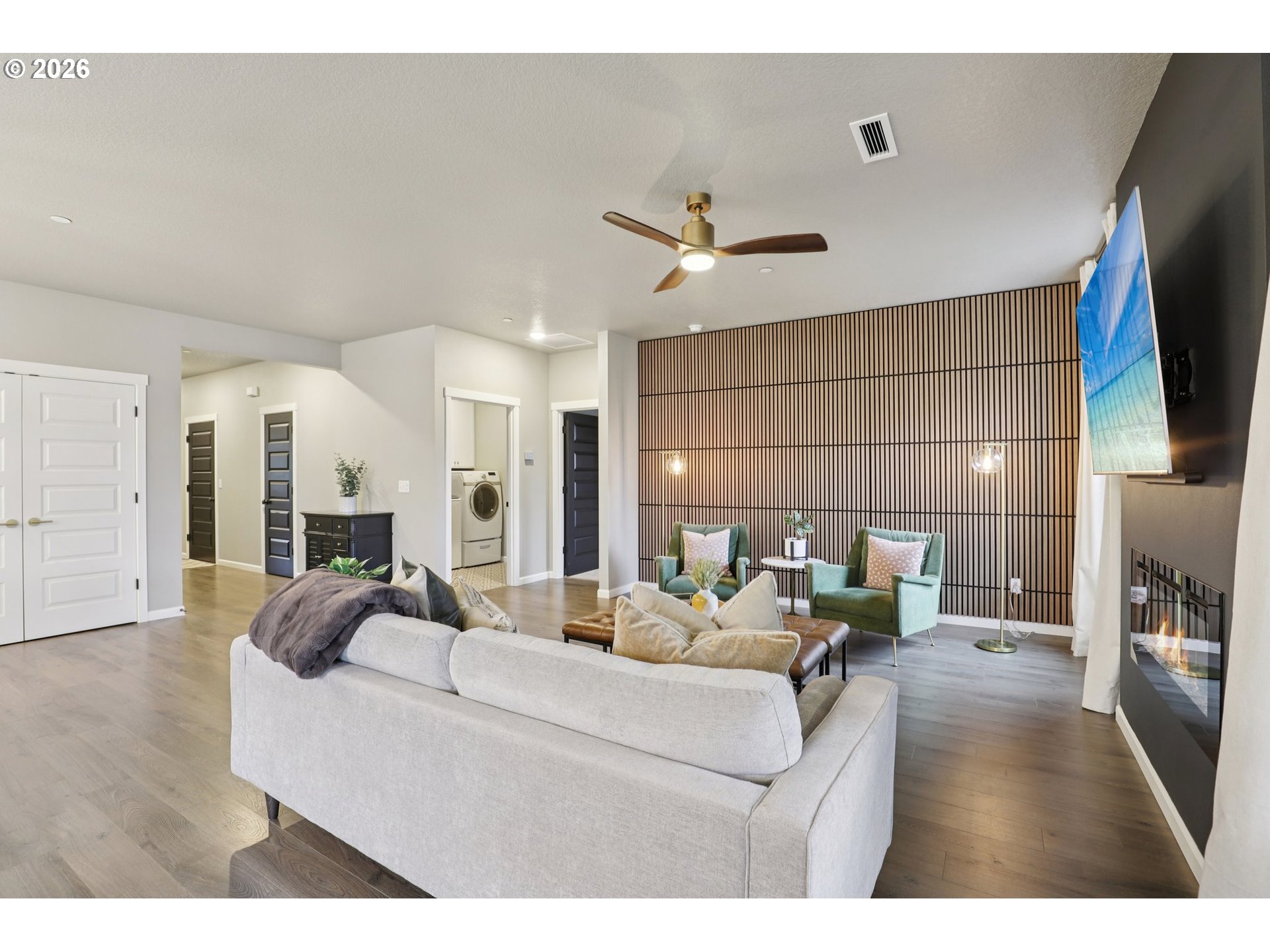 - Beautifully designed like-new home in the River Bend comm of Battle Ground. Spacious living area flows seamlessly into the kitchen & dining space, creating the perfect setting for both everyday living & entertaining.The kitchen features an abundance of cabinetry, sleek countertops, built in oven & ample workspace, while large windows bring in abundant natural light. The prim ste is privately situated w/ private fireplace & includes a well-appointed en-suite bath & generous closet space. 3 other bdrms offer flexibility for guests, a office, or hobbies. A rare 3-car garage w/ shelving provides excellent storage & parking options. Enjoy the ease of single-level living in a well-maintained neighborhood close to parks, trails, & local amenities.
