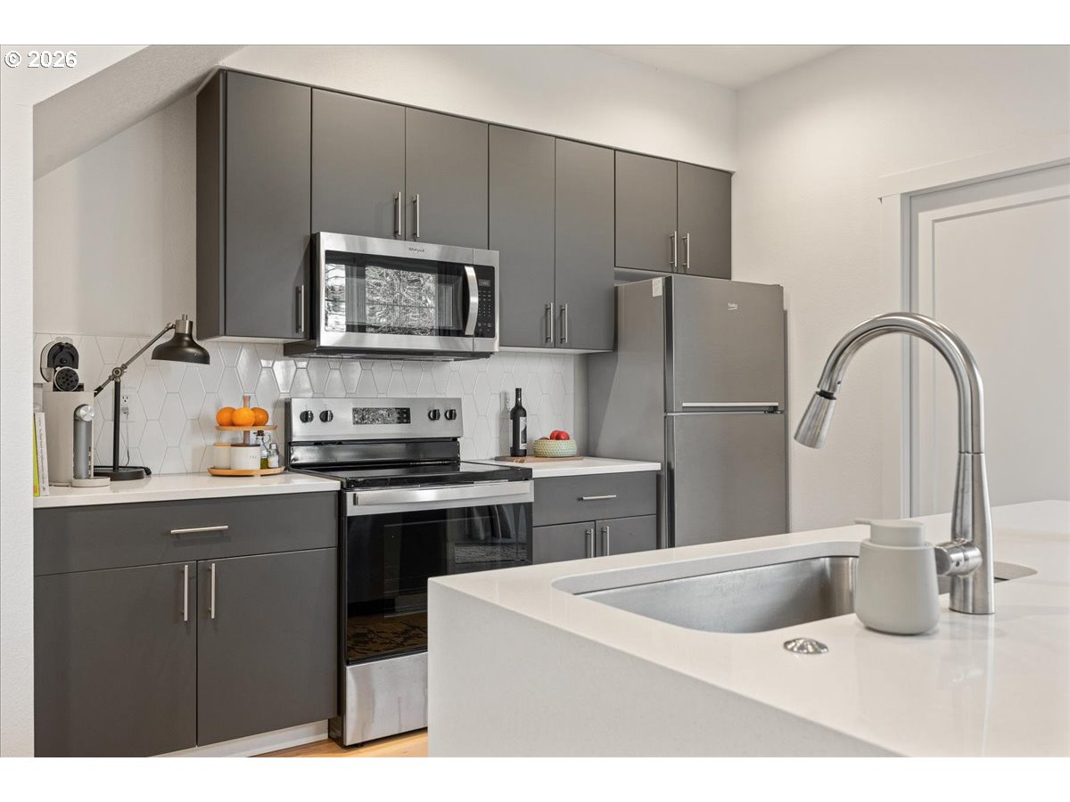 - Incredible nearly-new townhome in the highly sought-after Cully neighborhood of Northeast Portland! This peaceful 12-unit community was thoughtfully built with energy efficiency as a cornerstone. This bright end-unit townhome features 2 vaulted bedrooms and 1.5 bathrooms, with additional windows that bring in abundant natural light. Enjoy high-end finishes throughout, including quartz countertops, custom cabinetry, and stainless Whirlpool appliances in the kitchen, along with designer door hardware and modern upgraded lighting. The home also offers upgraded LVP flooring throughout and A/C for year-round comfort. Step outside to spacious outdoor living with a large, private fenced backyard—perfect for entertaining, gardening, or simply relaxing in your own private oasis. Built to Earth Advantage Platinum specifications, this home delivers maximum energy efficiency and sustainable design—comfort, quality, and savings all in one.