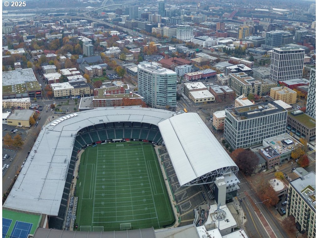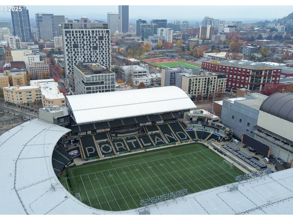 - Experience elevated urban living in this exceptional 16th-floor penthouse at The Civic, where a rare 42-foot private balcony offers sweeping views of Portland’s skyline and Providence Park. From this vantage point, enjoy front-row access to Portland Timbers and Thorns matches, concerts, and city lights. Recently remodeled, the residence features a chef-inspired kitchen with high-end appliances, quartz countertops, and custom cabinetry. The open-concept great room is enhanced by floor-to-ceiling windows, premium flooring, and an upgraded wet bar—perfect for entertaining. The primary suite is a luxurious retreat with a spa-like en-suite bath, soaking tub, walk-in shower, and a spacious walk-in closet. A versatile second bedroom provides space for guests, a home office, or additional living. With soaring 12-foot ceilings and an oversized storage area, this penthouse combines comfort and sophistication. The Civic is a LEED Gold-certified building offering 24-hour concierge service, secured entry, and a pet-friendly environment. Two deeded parking spaces are included. Located in the heart of Goose Hollow, this residence provides easy access to NW 23rd Avenue, the Pearl District, MAX light rail, and Portland’s finest restaurants, cafés, and shops. This is a rare opportunity to own a premier penthouse with unmatched views, luxury finishes, and unbeatable urban access.Bike Score: 91. Walk Score: 98.