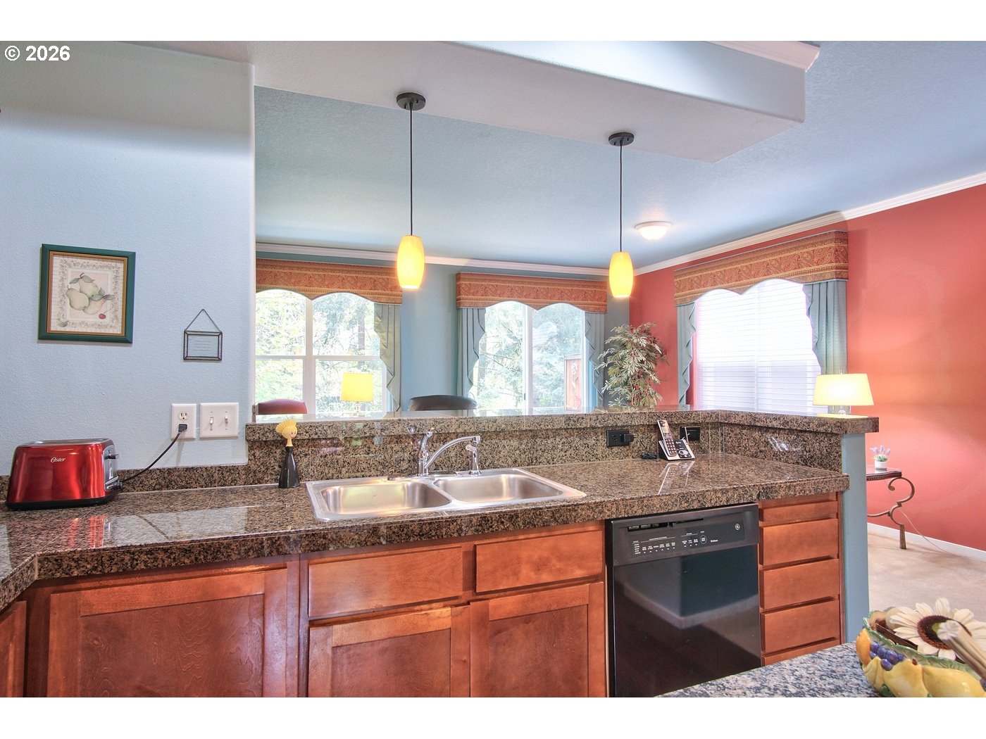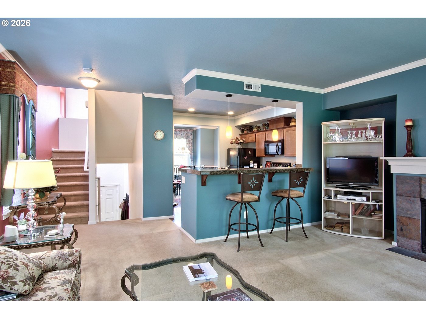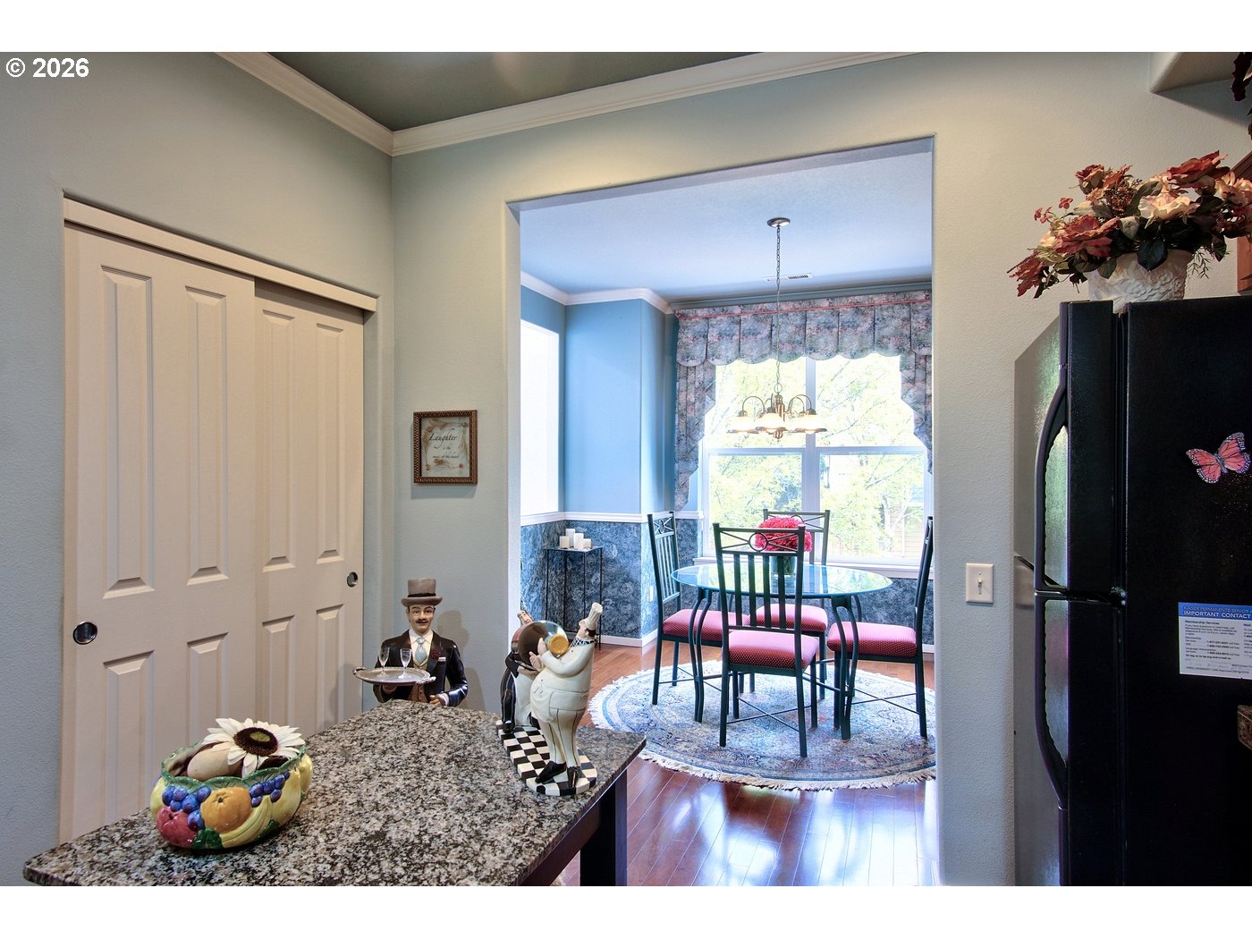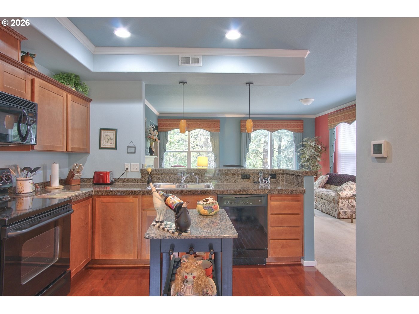 - Original owner showcases a near perfect condition end unit townhome offering extra windows for more natural light. Tile entry, 2 bed, possibly 3, and 3 full baths. Gleaming hardwood floors in the kitchen and dining. 2 view decks overlooking a wooded greenbelt for privacy and nature viewing. Backyard & deck maintenance is owner responsibility. HOA takes care of front landscaping. Enjoy new roof/gutters in 2025 & new HVAC/heat pump w/programmable theromstat & water heater in 2024, offering a home energy score of 6! Beautiful crown molding in the living, kitchen and dining areas, plus dining room has wainscoting. Gas fireplace, granite counters, eat bar w/pendant lighting, custom drapes t/o & silhouette blinds in the living room. Vaulted primary bedroom w/large walk-in closet. Lower level office could be converted to a bedroom which has a full bath. Generous storage in the garage. Great value & a reasonable HOA. [Home Energy Score = 6. HES Report at https://rpt.greenbuildingregistry.com/hes/OR10201293]