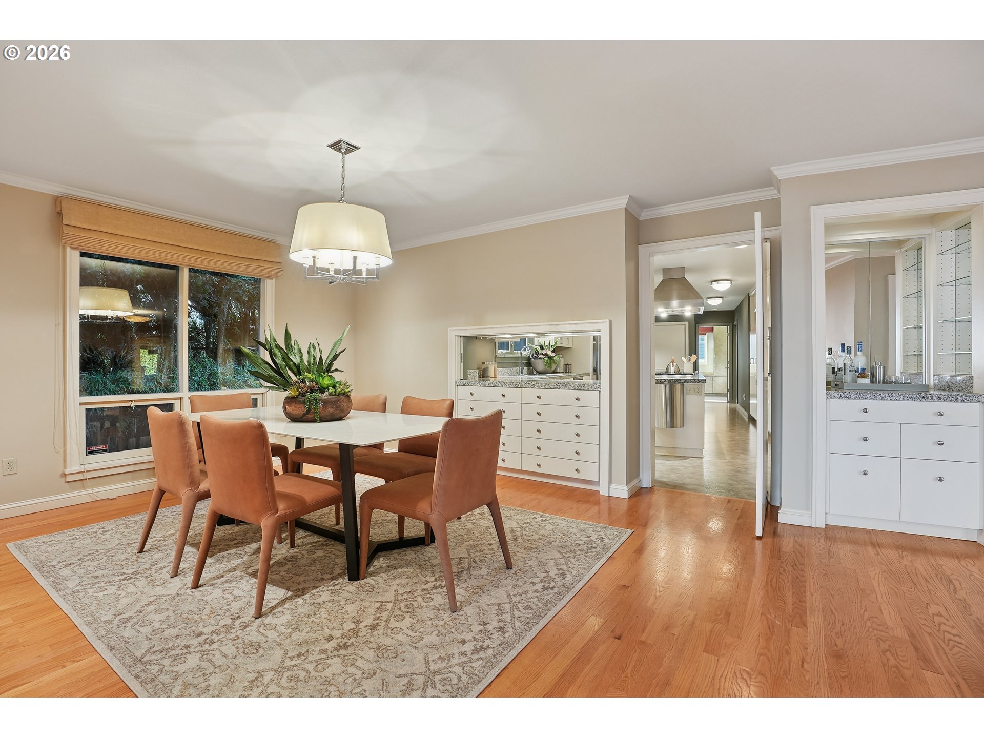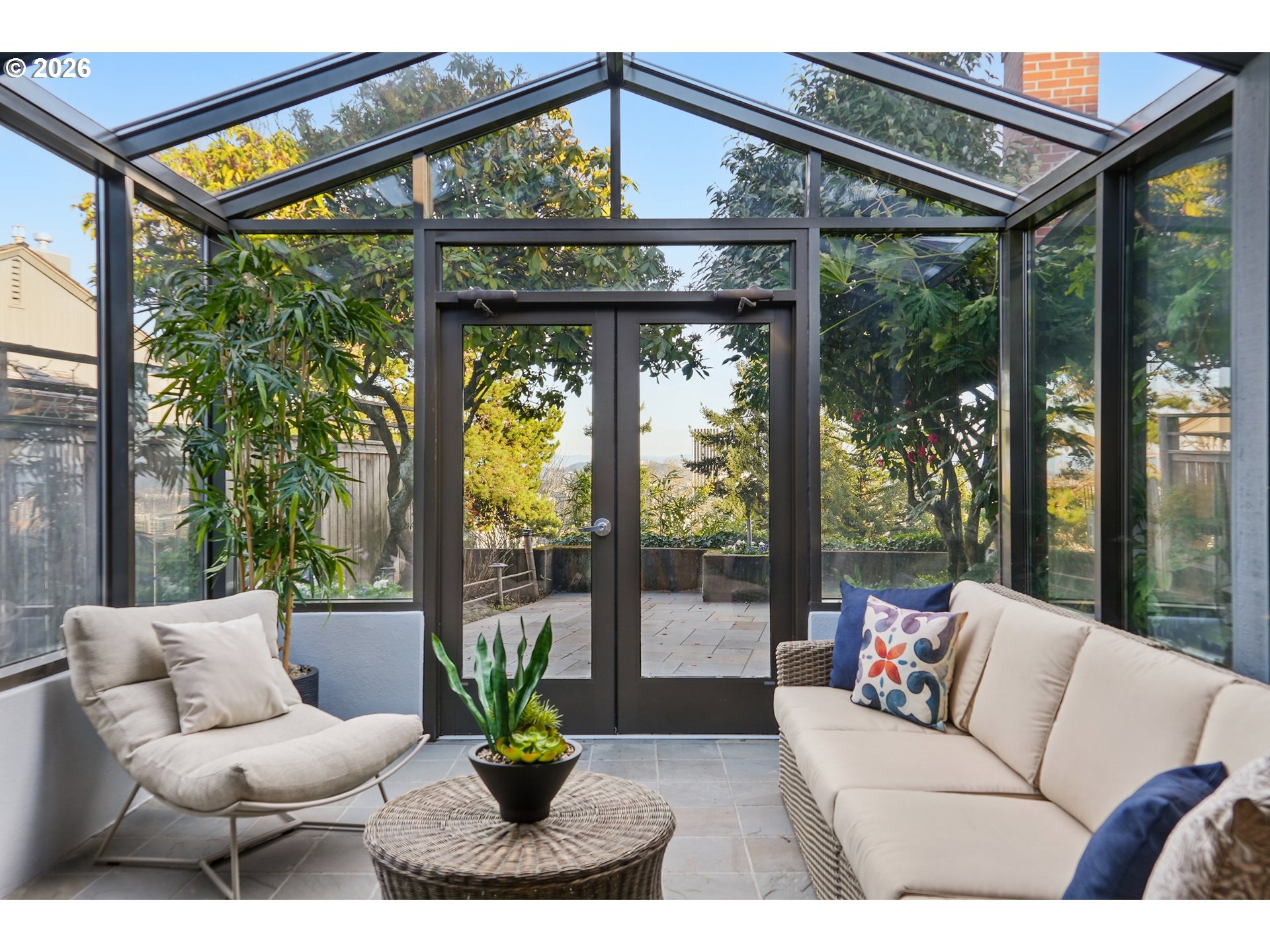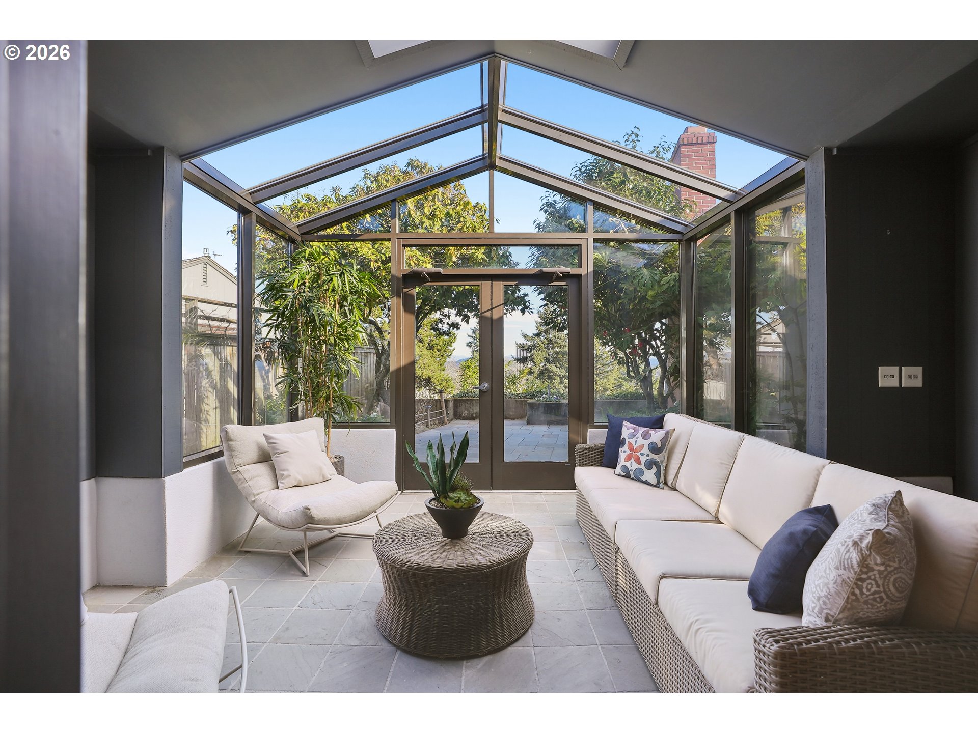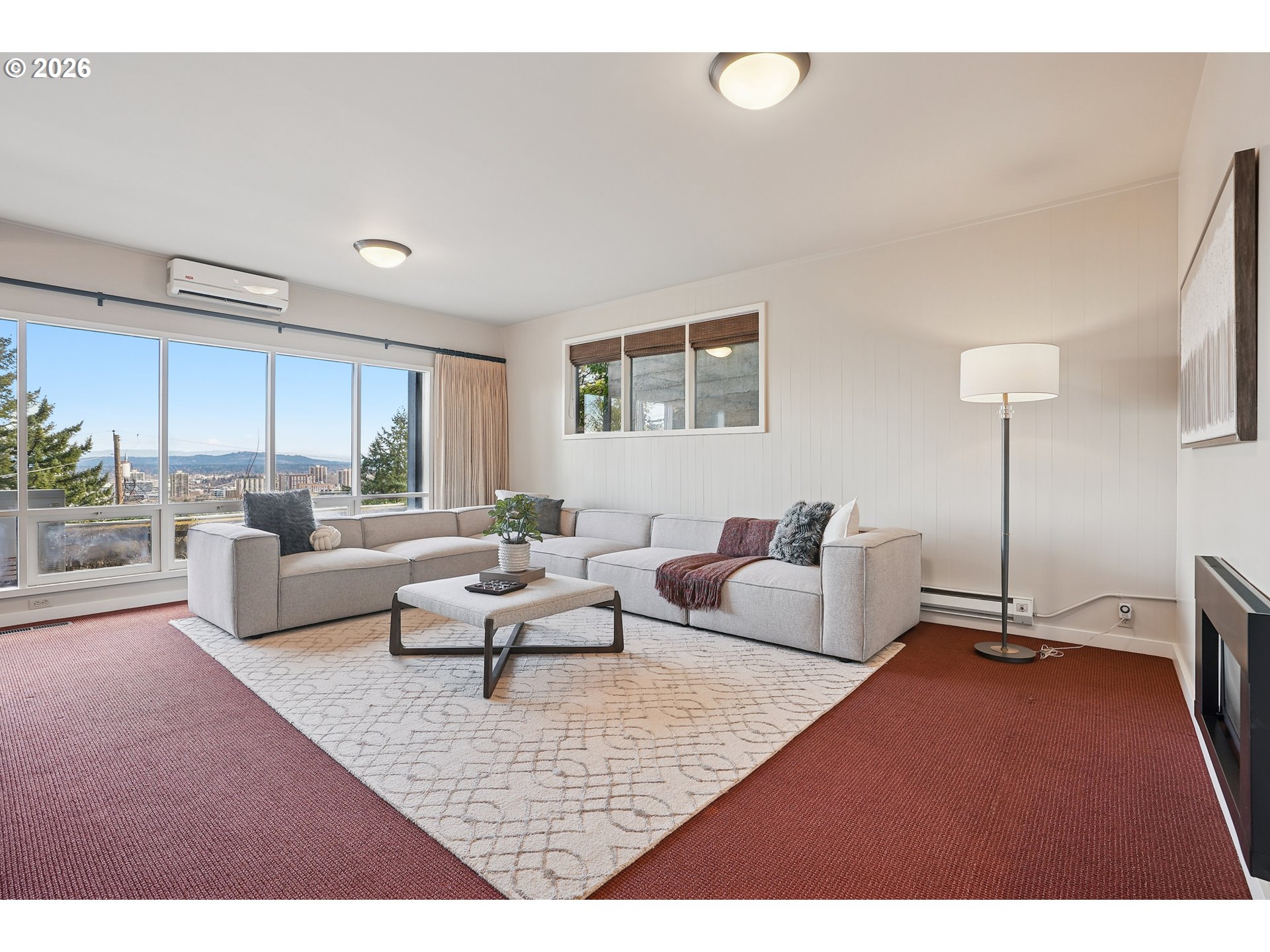 - OPEN SUN 2/22 FROM 11AM TO 1PM. Rare opportunity to own a mid-century modern classic with stunning city views and ideally situated in Portland Heights. Thoughtfully designed for privacy, enter through the gated front-entry atrium and experience the unmistakable feeling of home from the moment you step into the 5,000+ sq ft residence. The main level welcomes you with a spacious open floor plan, high ceilings, an abundance of windows and expansive hardwood flooring. The light-filled space flows from formal entry to living room to dining room and a very special sunroom, ideal for effortless entertaining year-round. The living room showcases built-ins, a wood-burning fireplace and captivating views of the City of Roses. A large chef’s eat-in kitchen with newly painted cabinetry throughout boasts ample storage. Completing the ease of one level living is a coveted and sought-after home office, laundry room, cozy den and two primary en-suite bedrooms; one complemented by an updated bathroom, and a large walk-in closet with custom vanity that’s both functional and elegant. The second primary bedroom with bath opens to a reading room, creating a comfortable and discrete retreat for overnight guests.Descend to the expansive lower level via elevator or staircase for more versatile living options including a third bedroom with adjoining bathroom, a fitness room equipped with sauna and shower, storage galore plus a sprawling en-suite guest quarters (or media/game room!) with its own city view and unique private entrance. Exterior features: An attached oversized two-car garage and a private driveway with plenty of additional parking. A greenhouse beckons for an urban garden, an artist studio or hobby haven.