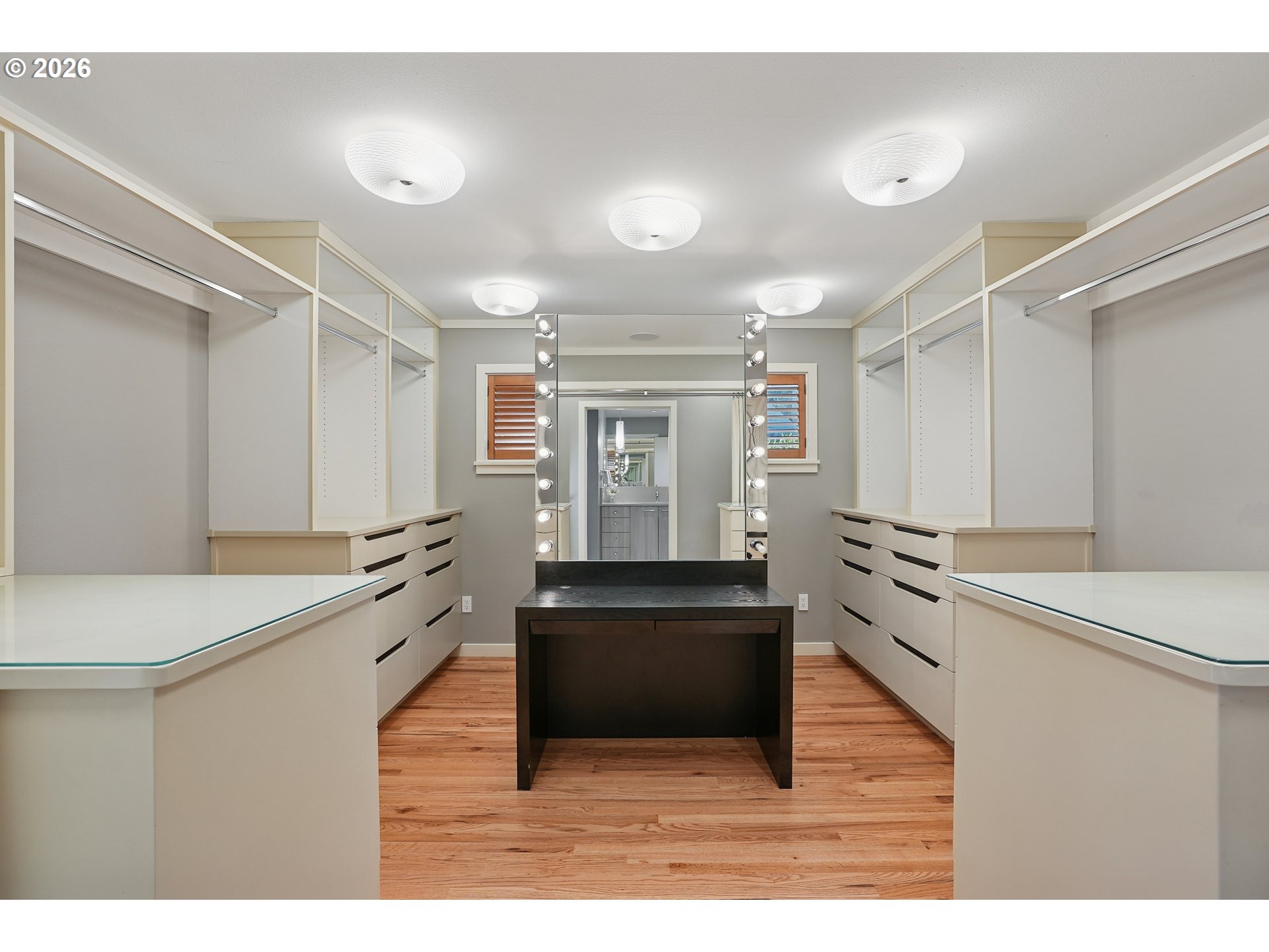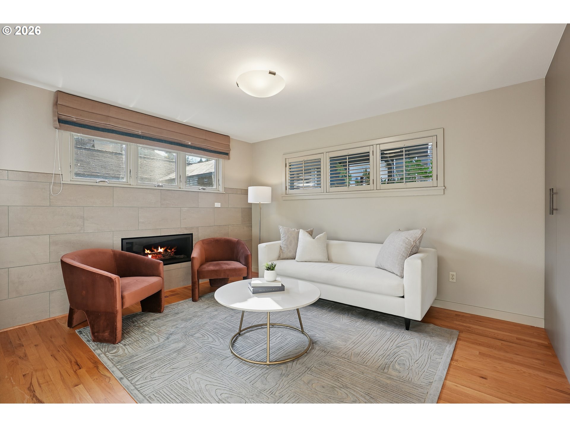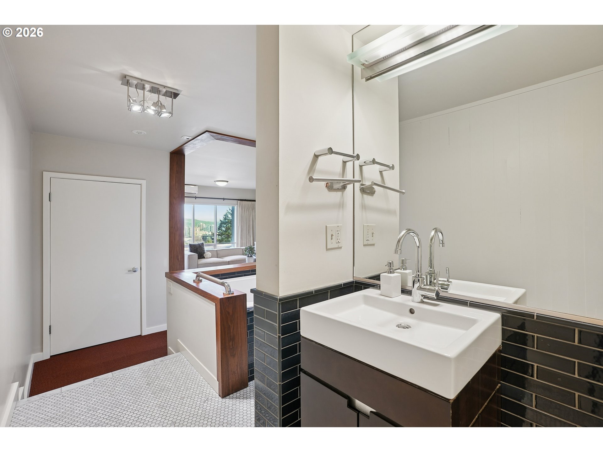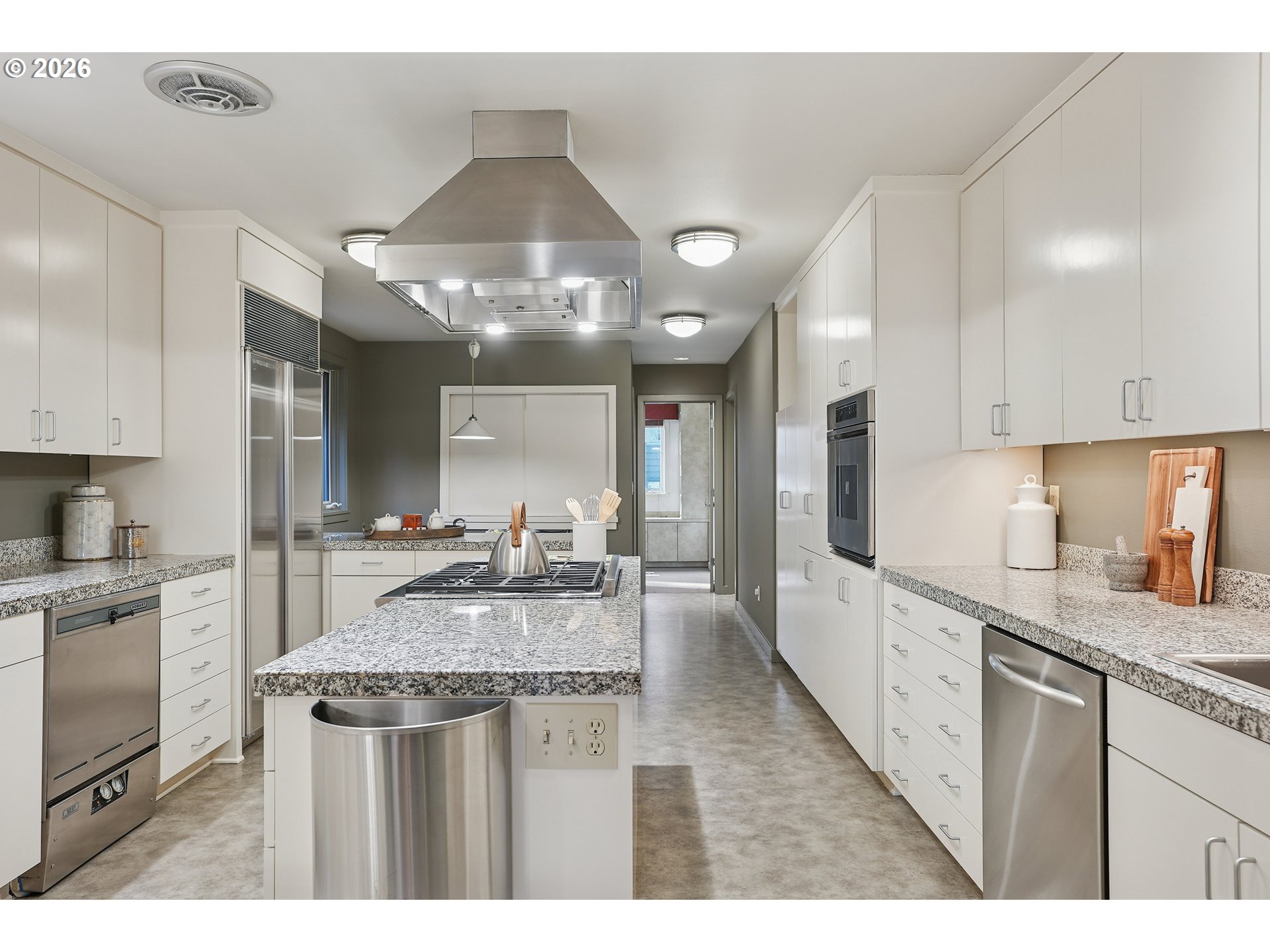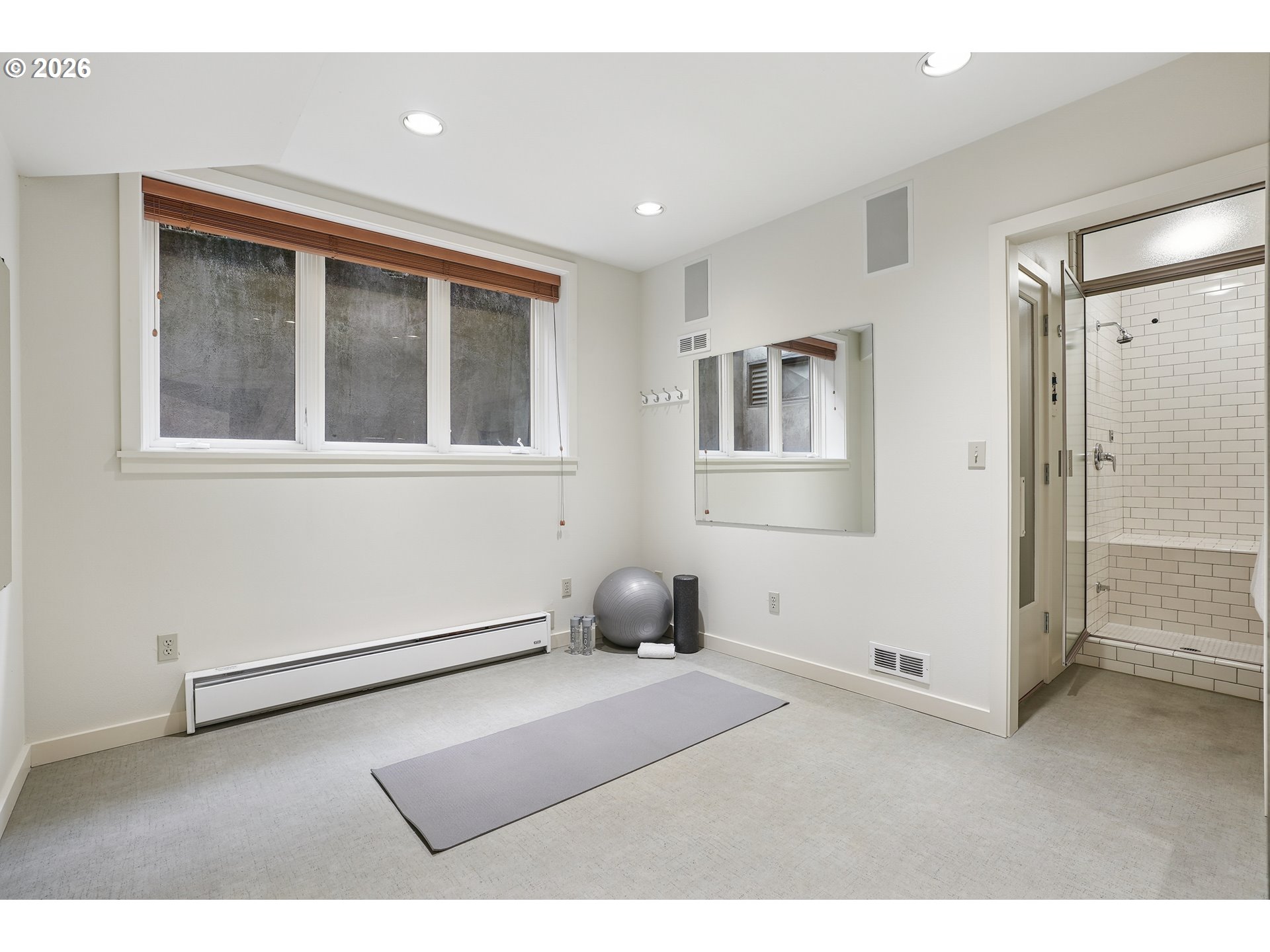 - OPEN SUN 2/22 FROM 11AM TO 1PM. Rare opportunity to own a mid-century modern classic with stunning city views and ideally situated in Portland Heights. Thoughtfully designed for privacy, enter through the gated front-entry atrium and experience the unmistakable feeling of home from the moment you step into the 5,000+ sq ft residence. The main level welcomes you with a spacious open floor plan, high ceilings, an abundance of windows and expansive hardwood flooring. The light-filled space flows from formal entry to living room to dining room and a very special sunroom, ideal for effortless entertaining year-round. The living room showcases built-ins, a wood-burning fireplace and captivating views of the City of Roses. A large chef’s eat-in kitchen with newly painted cabinetry throughout boasts ample storage. Completing the ease of one level living is a coveted and sought-after home office, laundry room, cozy den and two primary en-suite bedrooms; one complemented by an updated bathroom, and a large walk-in closet with custom vanity that’s both functional and elegant. The second primary bedroom with bath opens to a reading room, creating a comfortable and discrete retreat for overnight guests.Descend to the expansive lower level via elevator or staircase for more versatile living options including a third bedroom with adjoining bathroom, a fitness room equipped with sauna and shower, storage galore plus a sprawling en-suite guest quarters (or media/game room!) with its own city view and unique private entrance. Exterior features: An attached oversized two-car garage and a private driveway with plenty of additional parking. A greenhouse beckons for an urban garden, an artist studio or hobby haven.