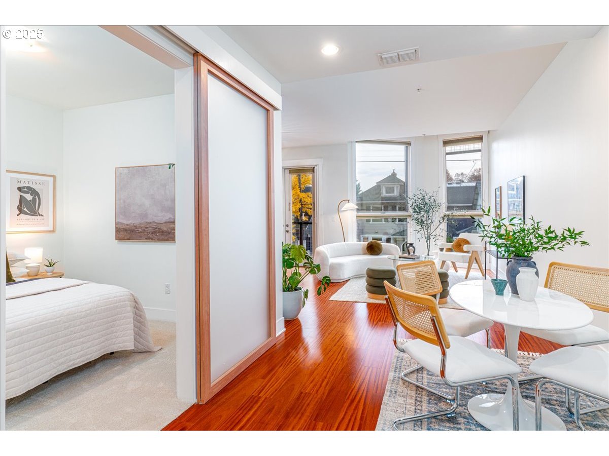 - This condo is seriously cool — bright, modern, and right in the heart of Belmont/Hawthorne! Floor-to-ceiling, south-facing windows flood the high-ceilinged space with natural light year-round. The smart floor plan features 1 bedroom, 2 full baths, a balcony, a primary ensuite, and a separate den/office. Fresh paint, new carpet, and beautiful engineered wood floors make it completely move-in ready. Radiant floor heat is quiet, warm, and effortless — just set it and forget it. Enjoy central AC, deeded gated parking, bike storage, and an additional storage unit. Elevator access, wide hallways, minimal steps, and in-unit laundry add to the convenience.Located just blocks from H Mart, Fred Meyer, Laurelhurst Park, Belmont Library (gorgeous renovation, reopening next summer), and endless great restaurants, shops, and transit — it’s all right outside your door. The well-run HOA covers almost everything (gas, water, heat, sewer, trash, exterior maintenance, and management), plus it’s pet-friendly with no rental cap. True city living — stylish, easy, and fun!