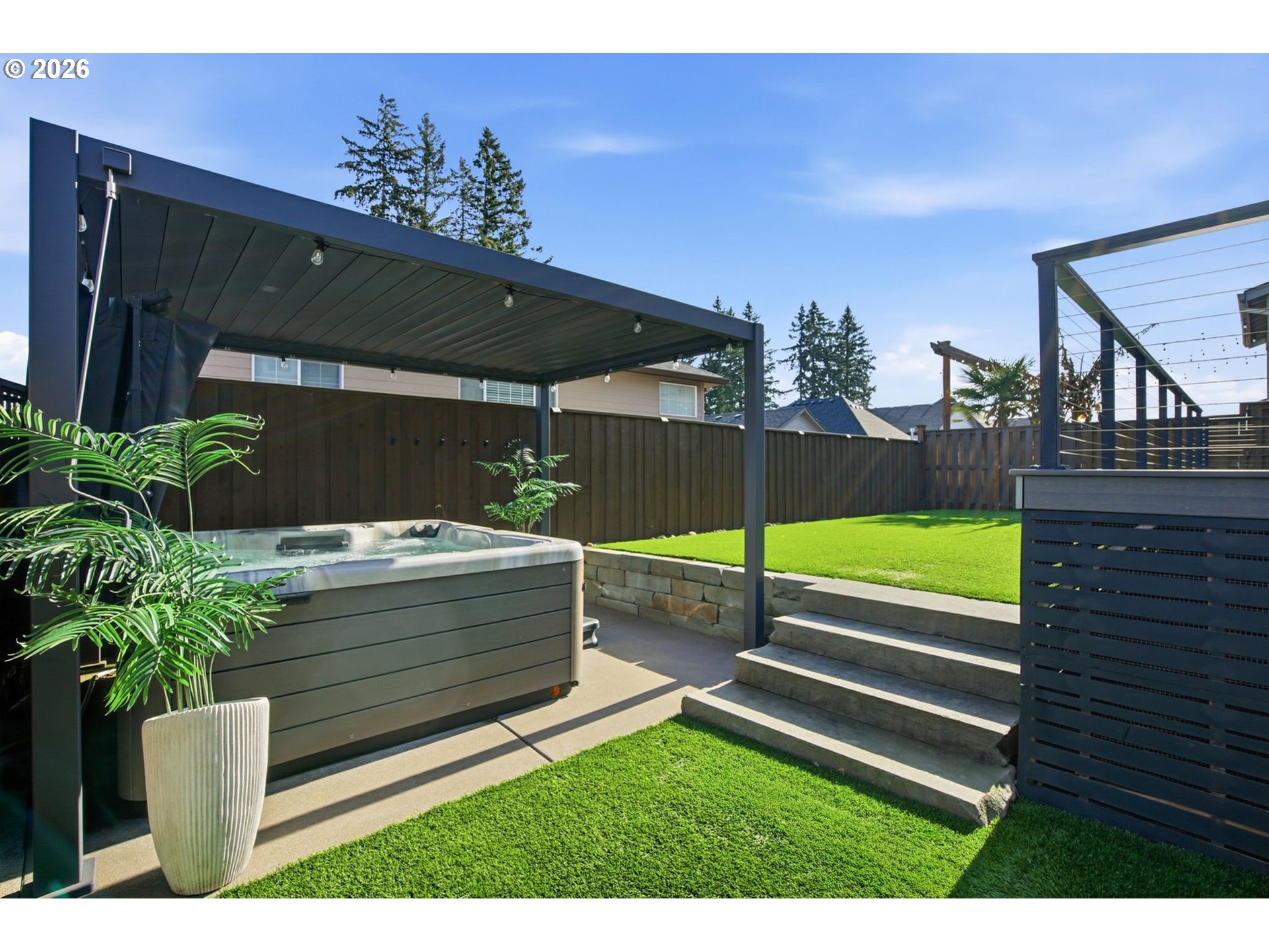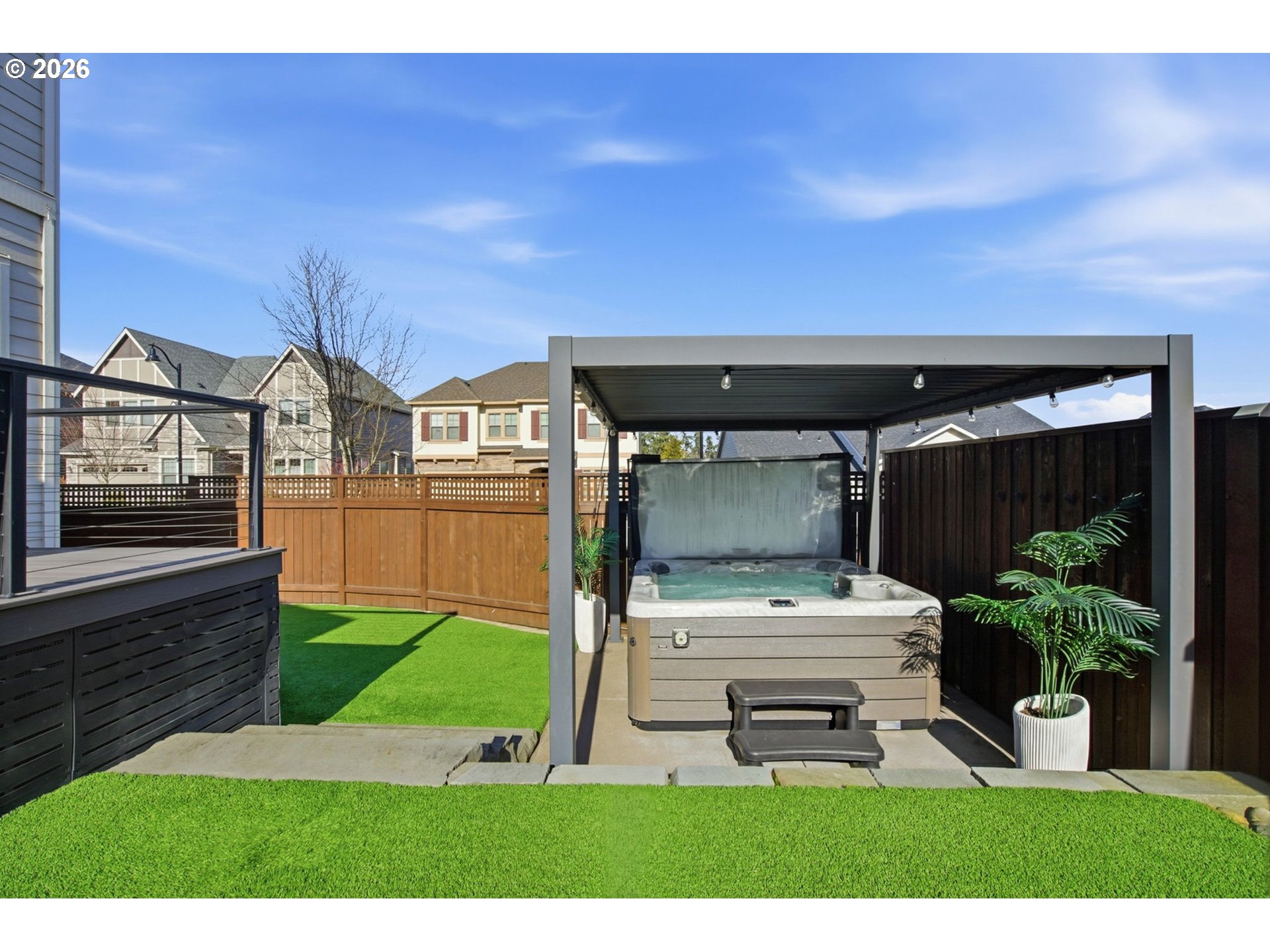 - Covered Arena, Covered Deck, Deck, Fenced, Free-Standing Hot Tub, Sprinkler, Yard