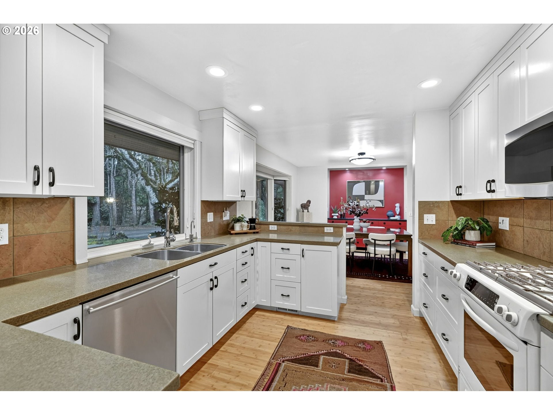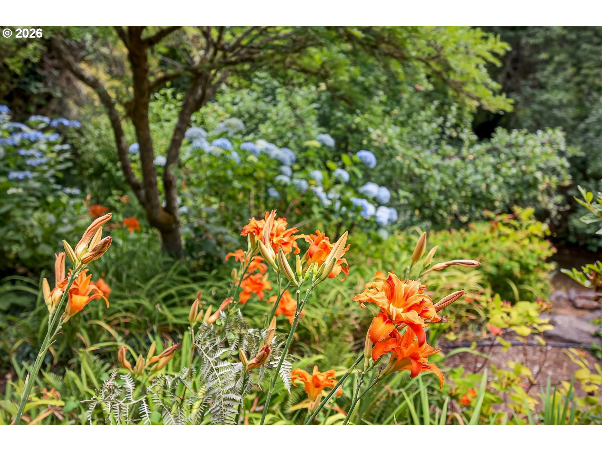 - Set on over half an acre in one of Dunthorpe’s most cherished, tree-lined enclaves, this gracious mid-century home offers space, serenity, and the kind of setting that’s increasingly hard to find. Surrounded by mature trees and lush, English-style gardens, the property feels private and peaceful, with a timeless presence that immediately draws you in. Inside, the home features a generous and flexible floor plan with five bedrooms and three baths, ideal for both everyday living and entertaining. Warm oak floors, three fireplaces, a finished basement, and laundry on both levels provide comfort and functionality, while large windows frame garden views that change beautifully with the seasons. Lovingly maintained and ready to be enjoyed as-is, the home also presents a wonderful opportunity to elevate the kitchen and bathrooms over time. The lower level provides a separate yet connected living space with its own entrance, two bedrooms, a living room, a full bathroom, and a dedicated laundry room—an ideal situation for multi-generational living, an au pair, guests, aging children, or potential income generation. The grounds are truly special, with apple and fig trees, blueberries, grapes, and a vibrant mix of flowering plants creating a park-like atmosphere that feels more like a private retreat than a residential lot. Located in the highly rated Riverdale School District and unincorporated Multnomah County, this home enjoys a rare blend of privacy and convenience just minutes from downtown Portland, Lake Oswego, and the trails of Tryon Creek. A classic Dunthorpe property with enduring charm and exciting potential to make it exceptional.