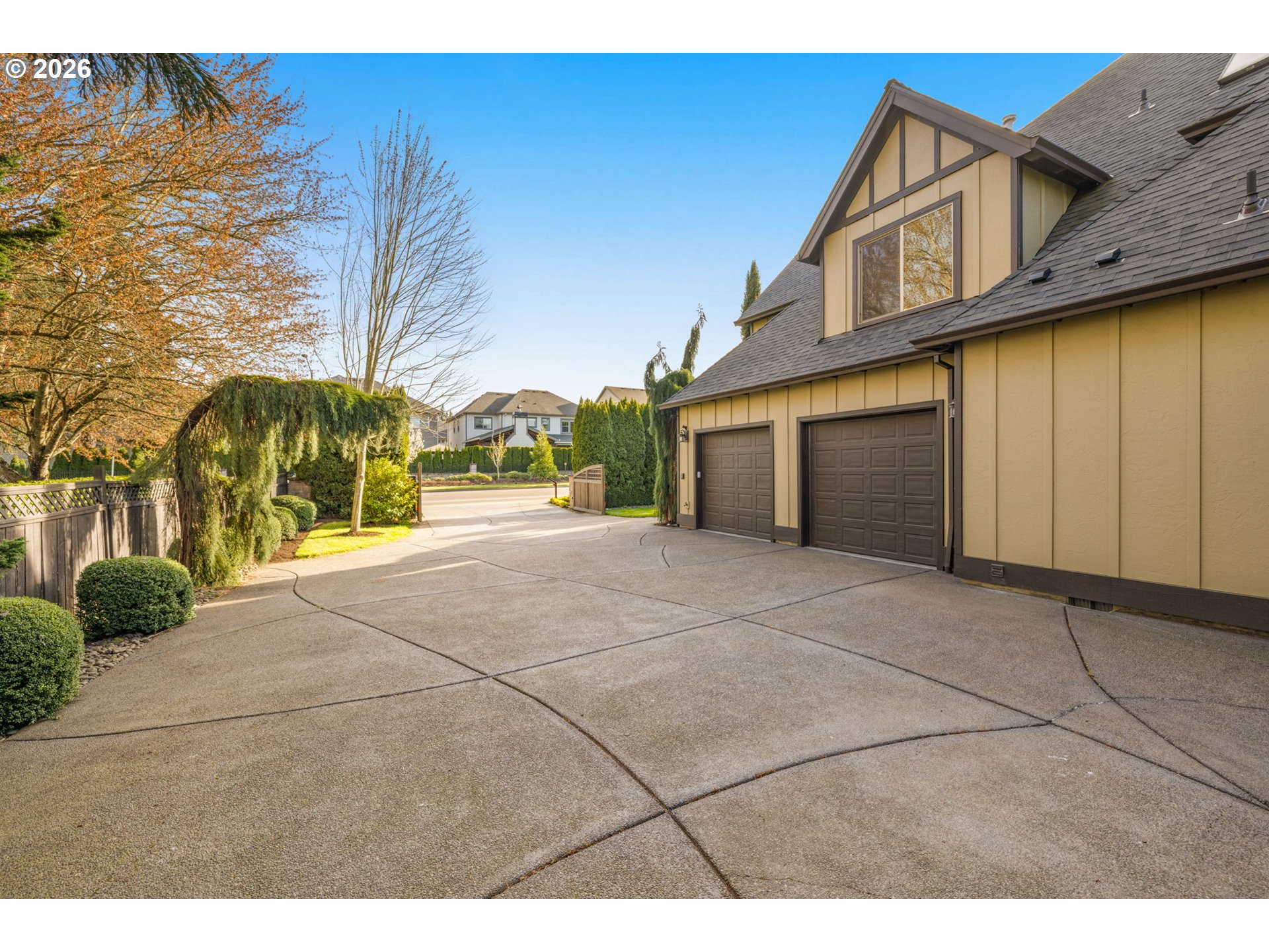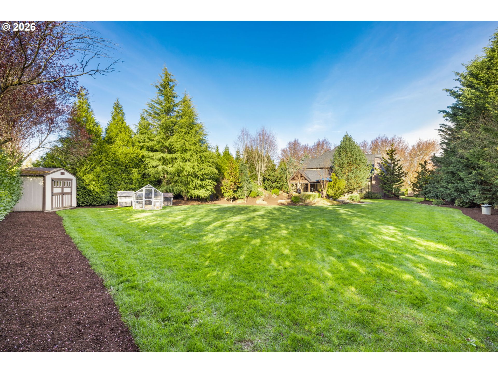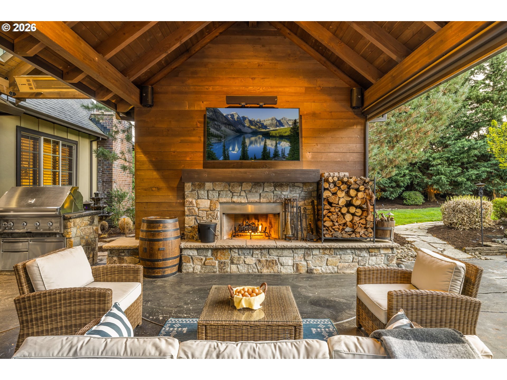 - Custom Tudor home on a spacious parcel at the edge of Wilsonville offering the perfect balance of secluded and convenience. A gated entry, classic brick architecture, and mature landscaping create a private estate feel just minutes from town and the amenities of nearby Villebois including parks, trails, and community gathering spaces. Inside, vaulted ceilings and large windows bring natural light into the main living areas. The formal living room features a stone fireplace and sits beside a dedicated dining room. The kitchen includes raw-edge granite counters, a large island, tile backsplash, and a sink overlooking the backyard. Cooking is centered around a 36-inch six-burner gas cooktop with JennAir double ovens, warming drawer, and built-in Wolf microwave, along with a new refrigerator, wine refrigerator, and pantry. The kitchen connects to the casual dining area and family room with built-in cabinetry and gas fireplace. Main-level primary suite with French door entry, patio access just steps from the hot tub, and a double-sided fireplace shared with the renovated bathroom featuring a freestanding tub, tiled shower, and custom walk-in closet. Upstairs includes three additional bedrooms, a hall bath with skylight, and a bonus room set up as a home theater with projector, screen, surround sound, popcorn machine, and theater seating with seat shakers. Two insulated attic areas provide additional storage. Outdoor living truly sets this property apart. A covered patio with vaulted tongue-and-groove ceilings and stamped concrete creates a striking gathering space and connects to a fully equipped outdoor kitchen with granite counters, EVO flattop grill, Hestan gas range, double burners, ice chest storage, and a Fontana pizza oven imported from Italy. West-facing electric sun shades and an outdoor sound system enhance the space. The backyard is anchored by an expansive water feature with cascading waterfalls and a koi pond that creates a fantastic ambiance, surrounded
