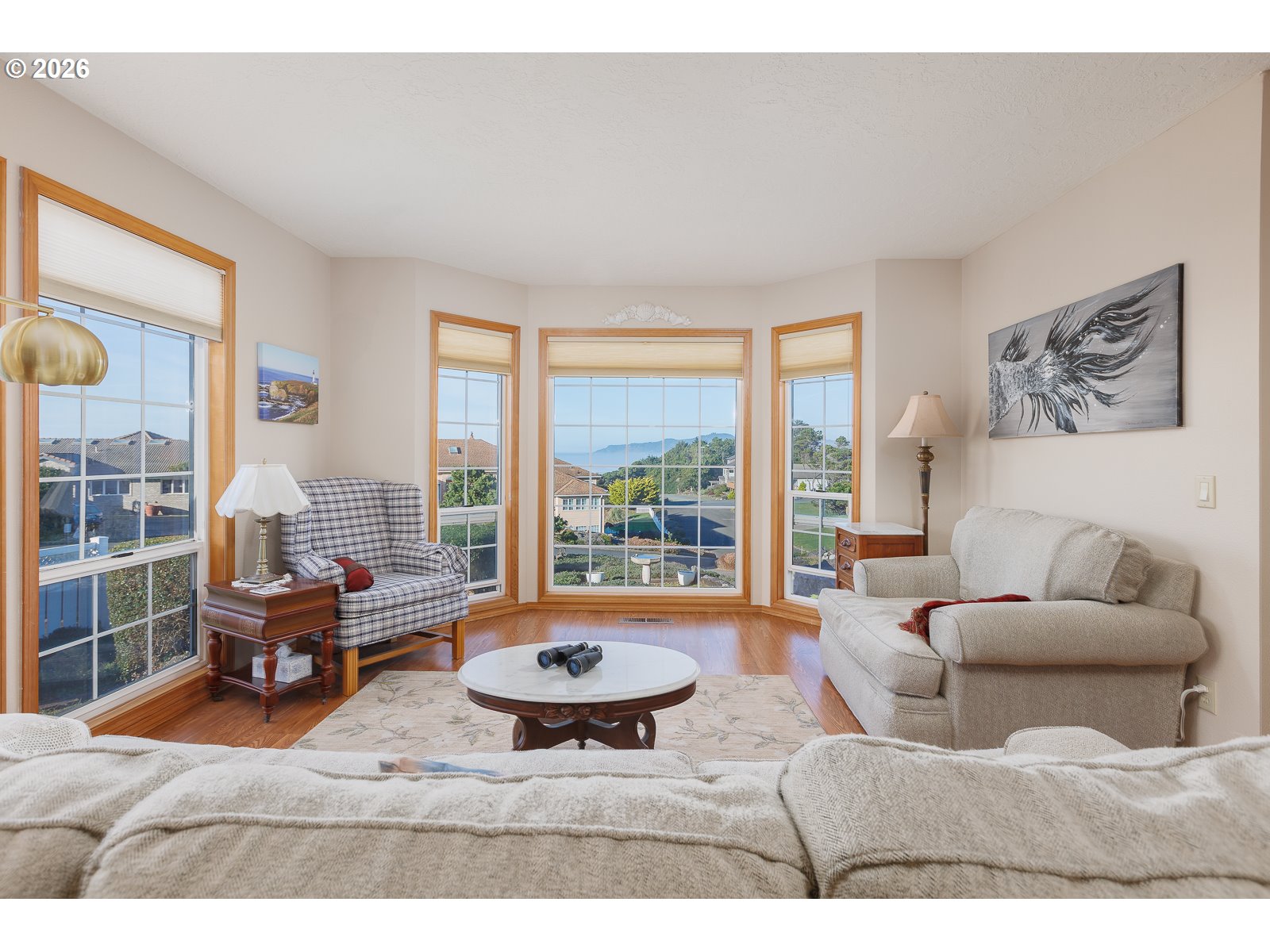 - Located on a quiet, upscale cul-de-sac, this large 3-bedroom, 3-bath home captures stunning ocean views in a private and serene setting. The 0.25-acre lot backs directly to 50+ acres of protected federal land, the iconic Yaquina Head Lighthouse and Natural Area. Custom-designed for comfortable coastal living, the home offers generous living spaces, abundant natural light, and multiple vantage points to enjoy the views, watch wildlife and hang gliders that launch from the headland. Step outside to a spacious fenced yard with room to garden, entertain, or simply relax in the ocean air. A nearby beach trail is an easy stroll from the home. The large kitchen with breakfast bar is equipped with stainless steel appliances including double ovens, a downdraft gas range, and deep pantry. You'll spend countless hours in the sunroom, with 3 skylights and walls of windows. Don't miss this opportunity to enjoy the best of the Oregon Coast lifestyle.