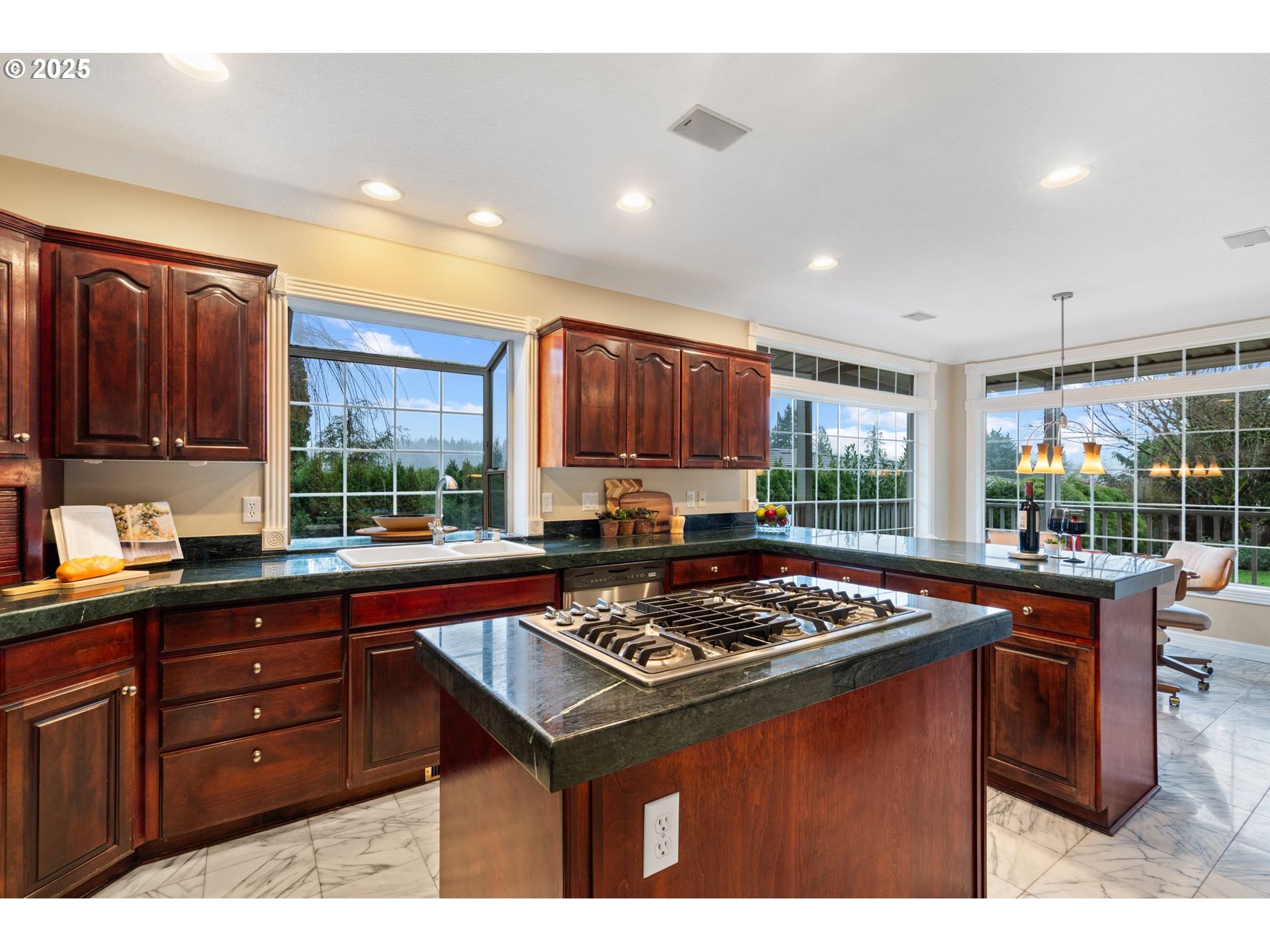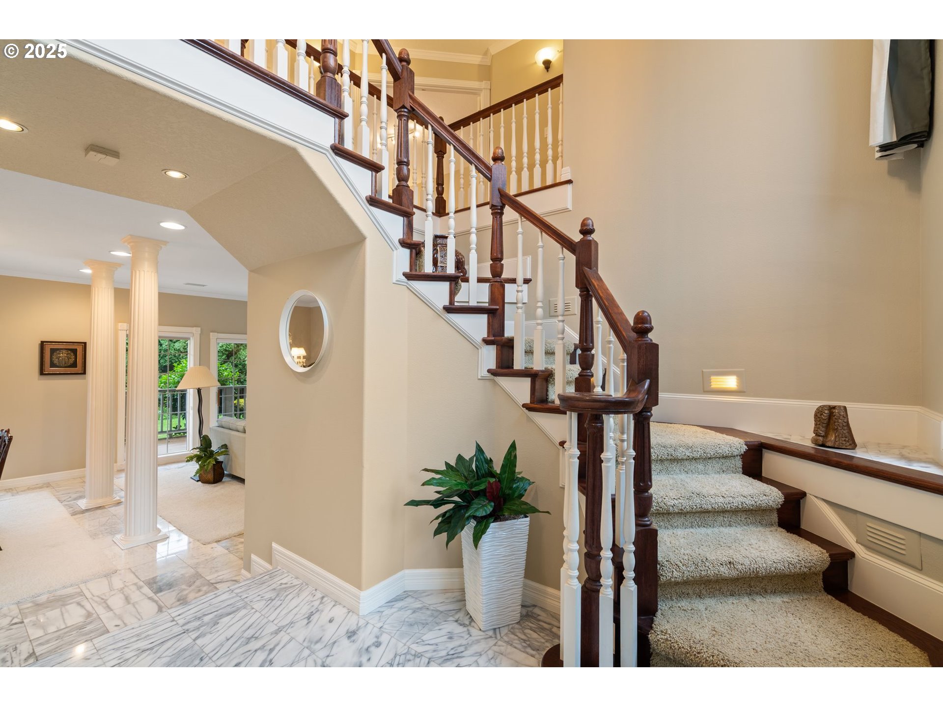 - Step into timeless beauty in this spacious 3,561 sq ft home, perfectly situated on a level 0.37-acre lot with sweeping views of Lacamas Lake, the surrounding mountains, and lush evergreens. This residence offers both grandeur and comfort, starting with a dramatic double staircase in the entryway and a wraparound deck on two levels—ideal for morning coffee or evening stargazing.The gourmet kitchen is a chef’s dream: granite countertops, cherry wood cabinetry, stainless steel appliances, and tons of cupboard space. Whether it's a weekday breakfast or a weekend gathering, this kitchen was designed for connection and convenience.The main level boasts a spacious "junior" primary suite with its own en-suite bath, perfect for guests or multigenerational living. Upstairs, the true primary suite is a serene retreat featuring a cozy fireplace, expansive en-suite bath, and access to the upper deck. A massive bonus room with a cathedral window offers the perfect place for movie nights, homework hangouts, or a future game room.You’ll love the elegant mix of marble, hardwood, and designer finishes throughout. The bright and inviting sunroom is fully enclosed, offering year-round enjoyment regardless of the weather.Located in the coveted Lacamas Shores neighborhood, residents enjoy exclusive access to a private park, recreational amenities, boat launch, and the Heritage Trail. With its welcoming sense of community, peaceful surroundings, and access to some of the region’s most respected schools, this home offers something truly special for every stage of life.Lovingly maintained but lightly lived in over the years, this home offers exciting opportunities to add your own updates—and it’s priced accordingly. Come experience the charm, space, and potential that awaits.