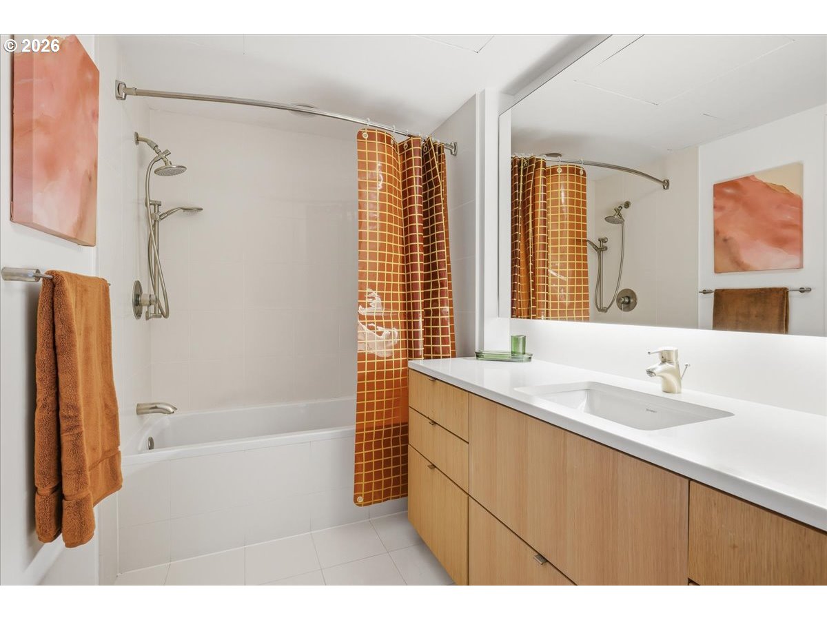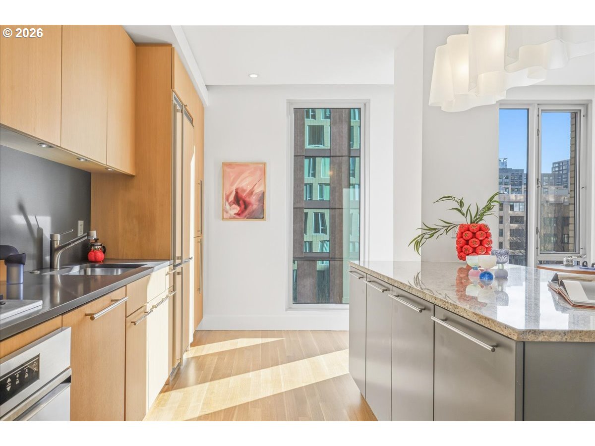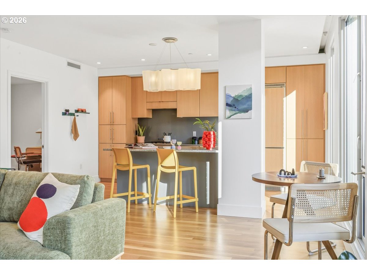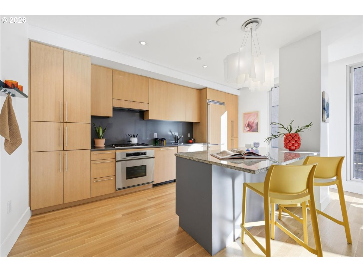 - Right in the heart of the Pearl, this south-facing condo in a LEED Platinum, architecturally striking building is filled with natural light thanks to a dramatic wall of windows, white oak floors, custom lighting, and an open, airy layout. The sleek gourmet kitchen features white oak cabinetry, quartz counters, a granite island, and high-end appliances—perfect for cooking or entertaining. The spacious primary suite offers a walk-in closet, soaking tub, and in-unit laundry. A large second bedroom provides excellent storage and flexibility for guests, an office, or both. Concierge service, basement storage, and one secured garage parking space add convenience and ease. Stylish, sustainable, and perfectly located—this is Pearl District living at its best.