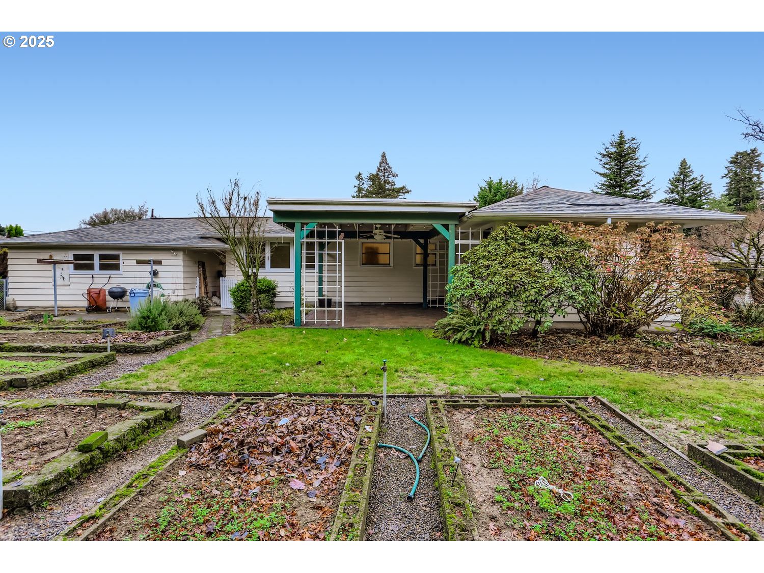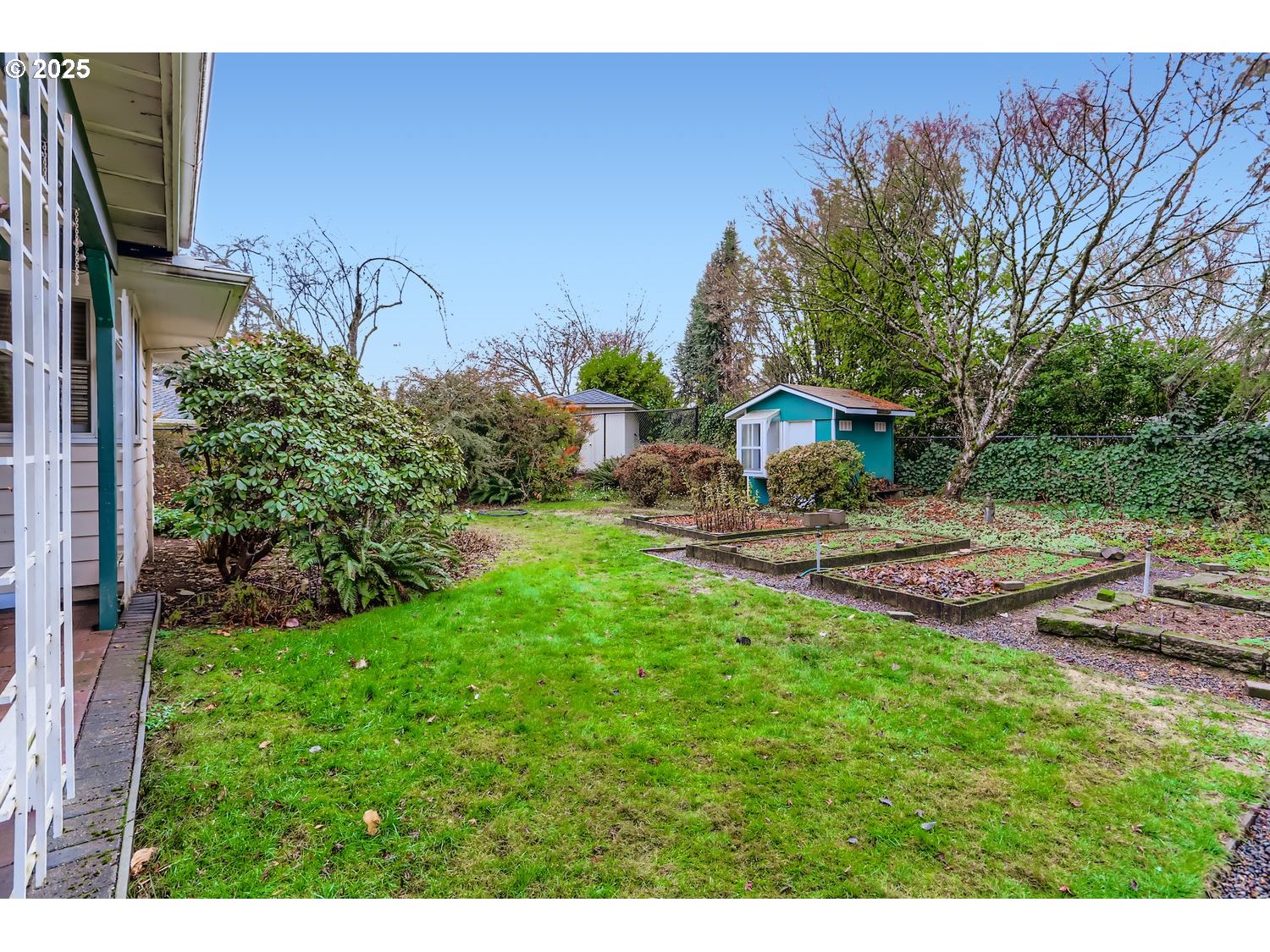- Covered Patio, Fenced, Garden, Porch, Raised Beds, Security Lights, Storm Door(s), Tool Shed, Water Feature, Yard