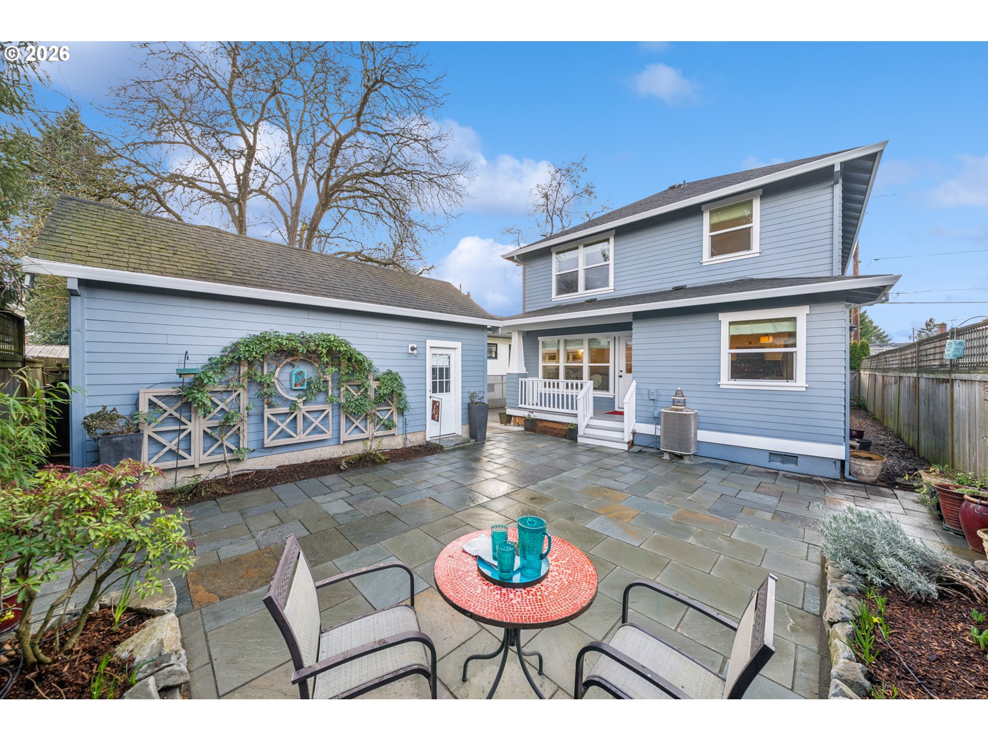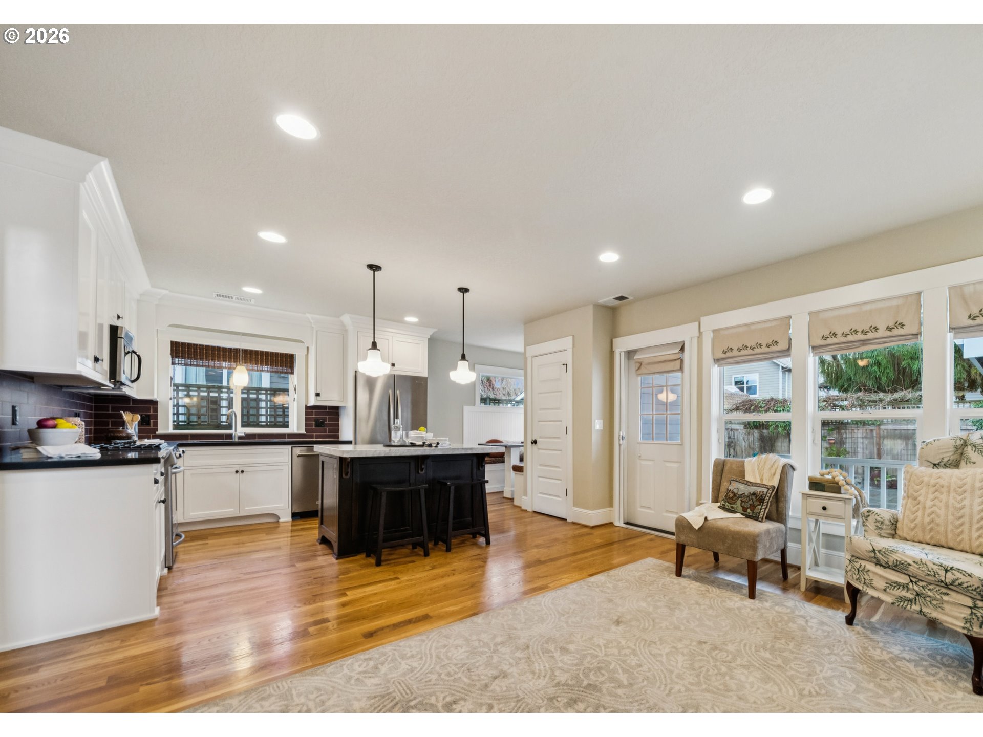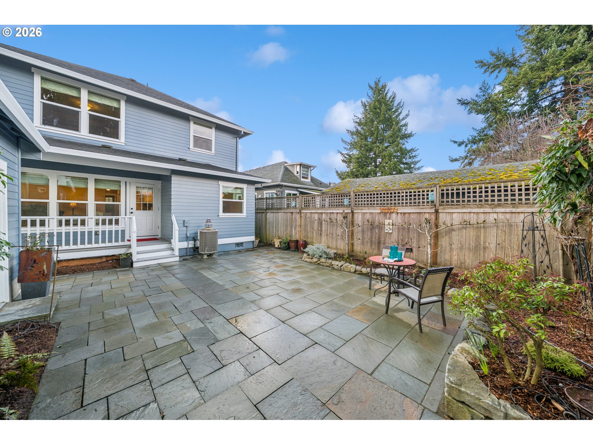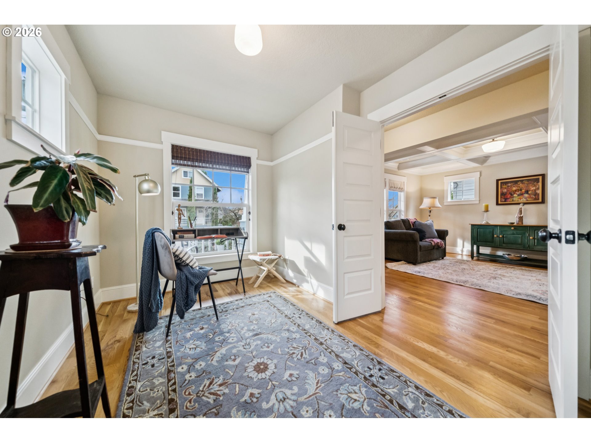 - Located in the vibrant Alberta Arts District, this 2013 Craftsman home with 3-bedrooms, main floor office, and 2.5-baths, blends classic charm with modern comfort and fantastic location. Step up to the large, covered front porch and into the spacious living room with hardwood floors and coffered ceilings. Pocket doors open to the formal dining room with bay window while French doors frame the main floor office providing flexible work-from-home or dedicated creative space. At the back of the home, the open kitchen and family room flood with natural light. Centered around a beautiful marble island, the kitchen features a built-in eating nook, generous kitchen pantry, and cozy family room anchored by a gas fireplace with blower. The main floor guest bath includes a utility room while under-the-stairs closet space offers additional room for storage. Upstairs, the spacious primary suite features recessed ceiling lighting, a generous walk-in closet and an ensuite bath with marble counters, tile surrounds, a soaking tub, and walk-in shower. Daily life is a breeze with two additional upper-level bedrooms, upper-level laundry, an additional full bath, plus a central vacuum system and AC throughout the home. Back downstairs, step easily from the family room onto the back porch and out to the low-maintenance and beautifully hardscaped Pennsylvania Bluestone patio. Outdoor living shines with this courtyard style space perfect for entertaining. Espalier pear trees, vines, and shrubs line the private yard and are just beginning to wake up from their winter sleep. With a long driveway and detached garage, the home offers plenty of parking and additional storage. Ideally situated in one of the most pedestrian and bicycle-friendly neighborhoods in Portland with easy access to Alberta shops & restaurants, the North Williams Avenue bike corridor, convenient access to I-5 and downtown Portland, this home offers excellent connectivity for commuting, recreation, and everyday amenities. [Home Energy Score = 6. HES Report at https://rpt.greenbuildingregistry.com/hes/OR10243760]