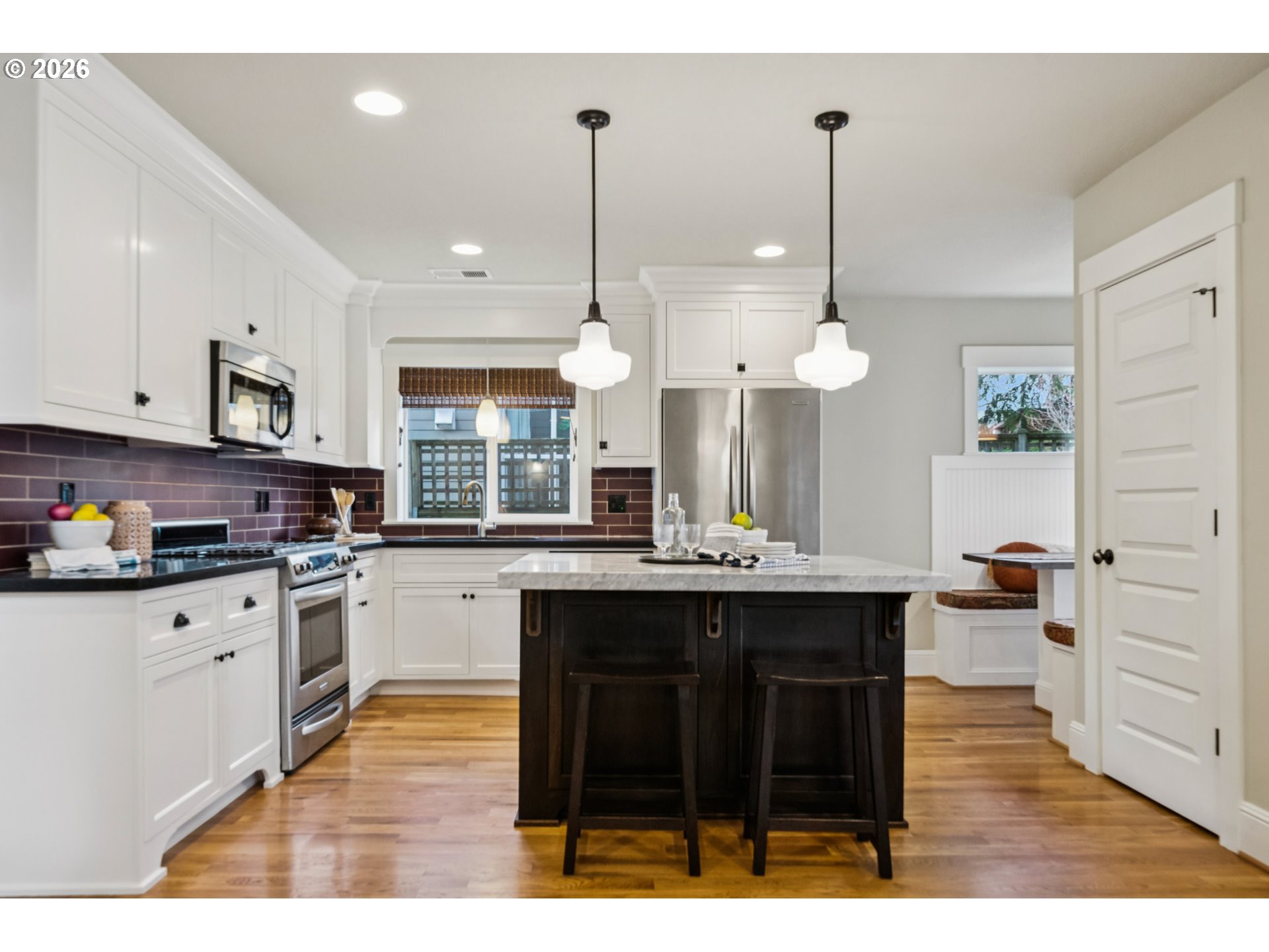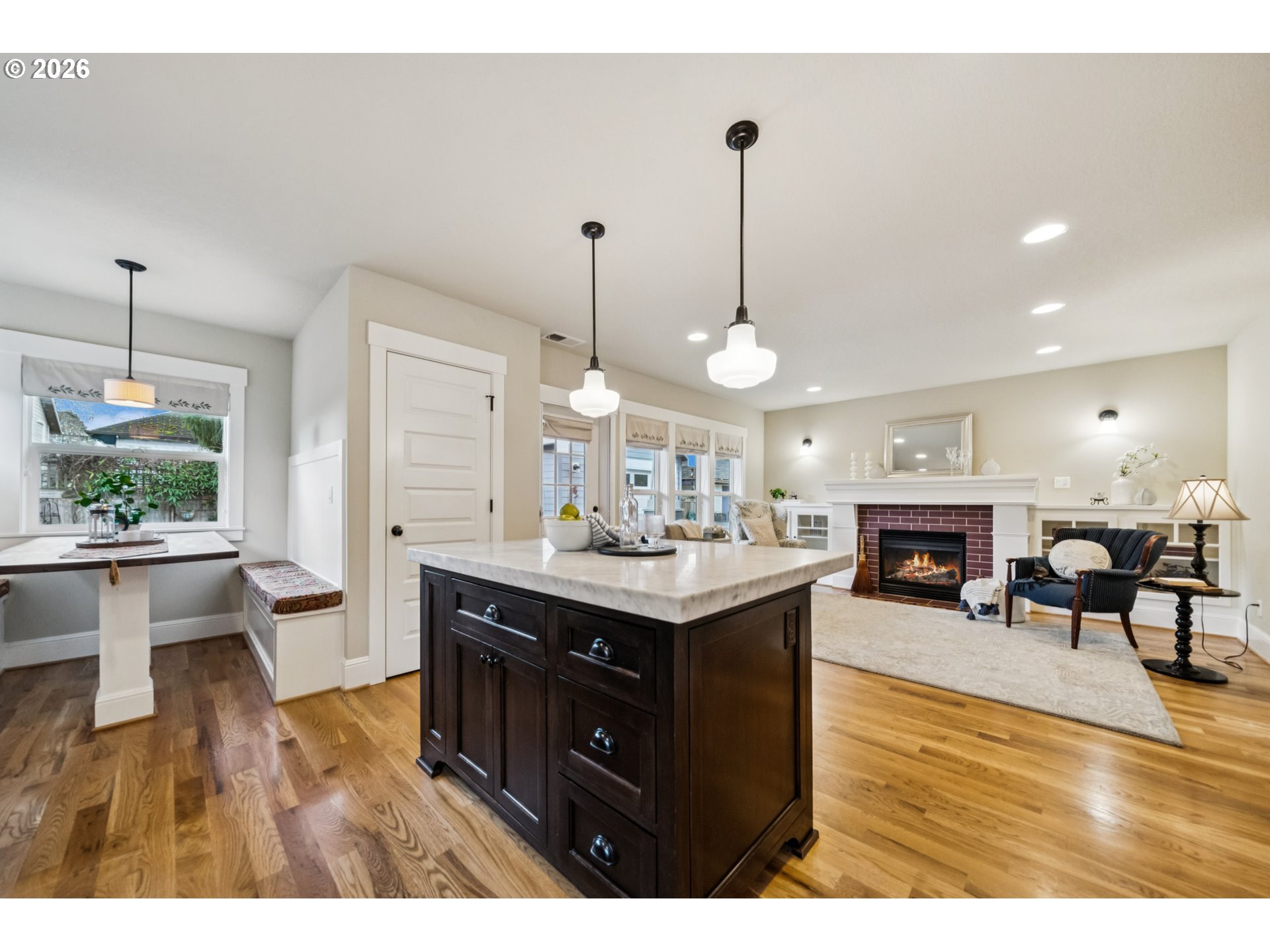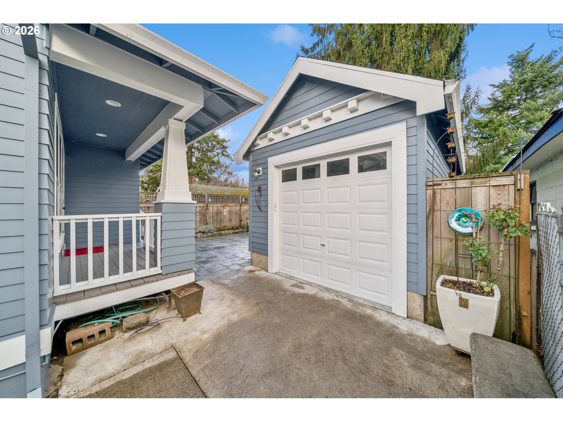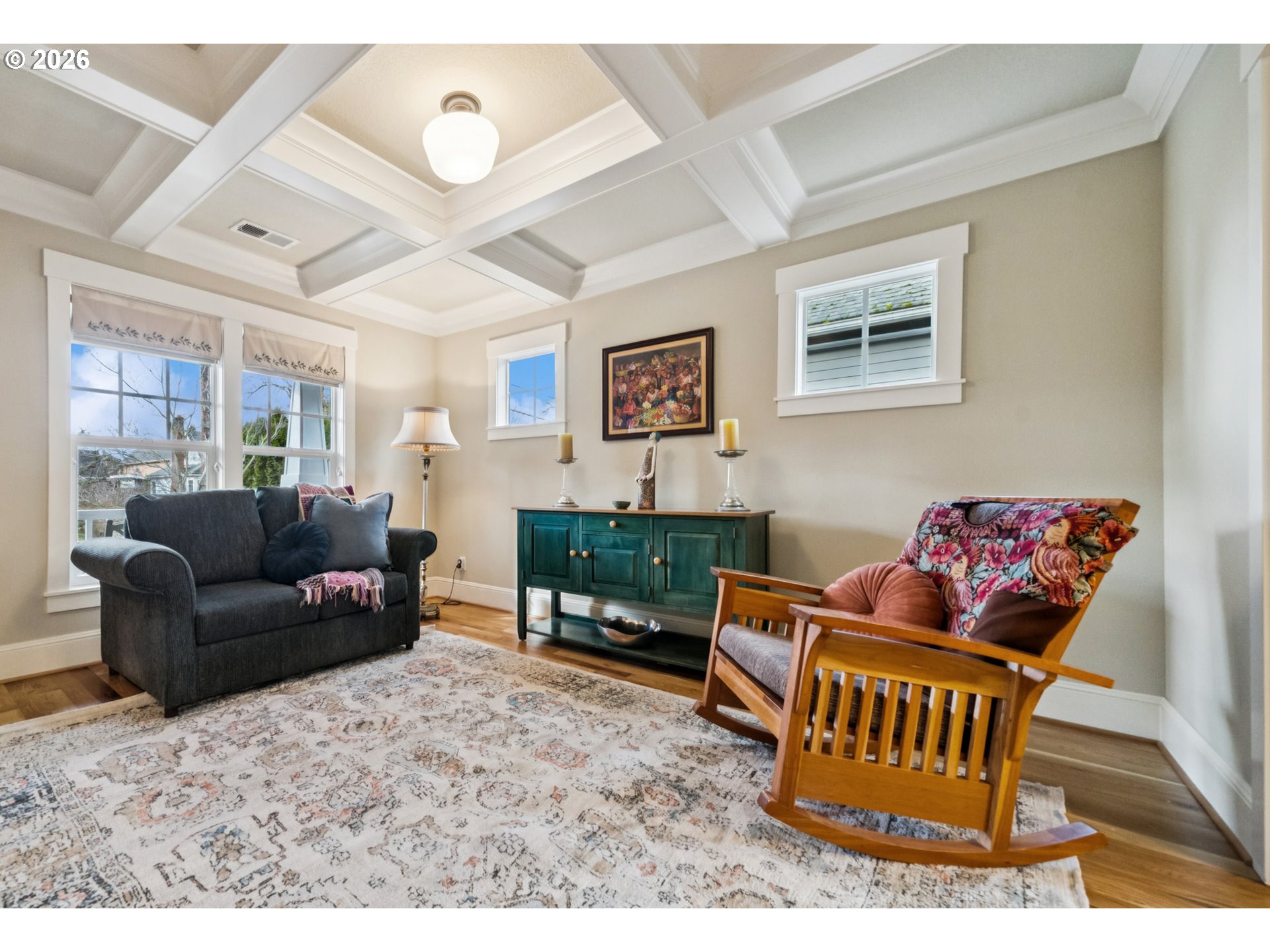 - Located in the vibrant Alberta Arts District, this 2013 Craftsman home with 3-bedrooms, main floor office, and 2.5-baths, blends classic charm with modern comfort and fantastic location. Step up to the large, covered front porch and into the spacious living room with hardwood floors and coffered ceilings. Pocket doors open to the formal dining room with bay window while French doors frame the main floor office providing flexible work-from-home or dedicated creative space. At the back of the home, the open kitchen and family room flood with natural light. Centered around a beautiful marble island, the kitchen features a built-in eating nook, generous kitchen pantry, and cozy family room anchored by a gas fireplace with blower. The main floor guest bath includes a utility room while under-the-stairs closet space offers additional room for storage. Upstairs, the spacious primary suite features recessed ceiling lighting, a generous walk-in closet and an ensuite bath with marble counters, tile surrounds, a soaking tub, and walk-in shower. Daily life is a breeze with two additional upper-level bedrooms, upper-level laundry, an additional full bath, plus a central vacuum system and AC throughout the home. Back downstairs, step easily from the family room onto the back porch and out to the low-maintenance and beautifully hardscaped Pennsylvania Bluestone patio. Outdoor living shines with this courtyard style space perfect for entertaining. Espalier pear trees, vines, and shrubs line the private yard and are just beginning to wake up from their winter sleep. With a long driveway and detached garage, the home offers plenty of parking and additional storage. Ideally situated in one of the most pedestrian and bicycle-friendly neighborhoods in Portland with easy access to Alberta shops & restaurants, the North Williams Avenue bike corridor, convenient access to I-5 and downtown Portland, this home offers excellent connectivity for commuting, recreation, and everyday amenities. [Home Energy Score = 6. HES Report at https://rpt.greenbuildingregistry.com/hes/OR10243760]