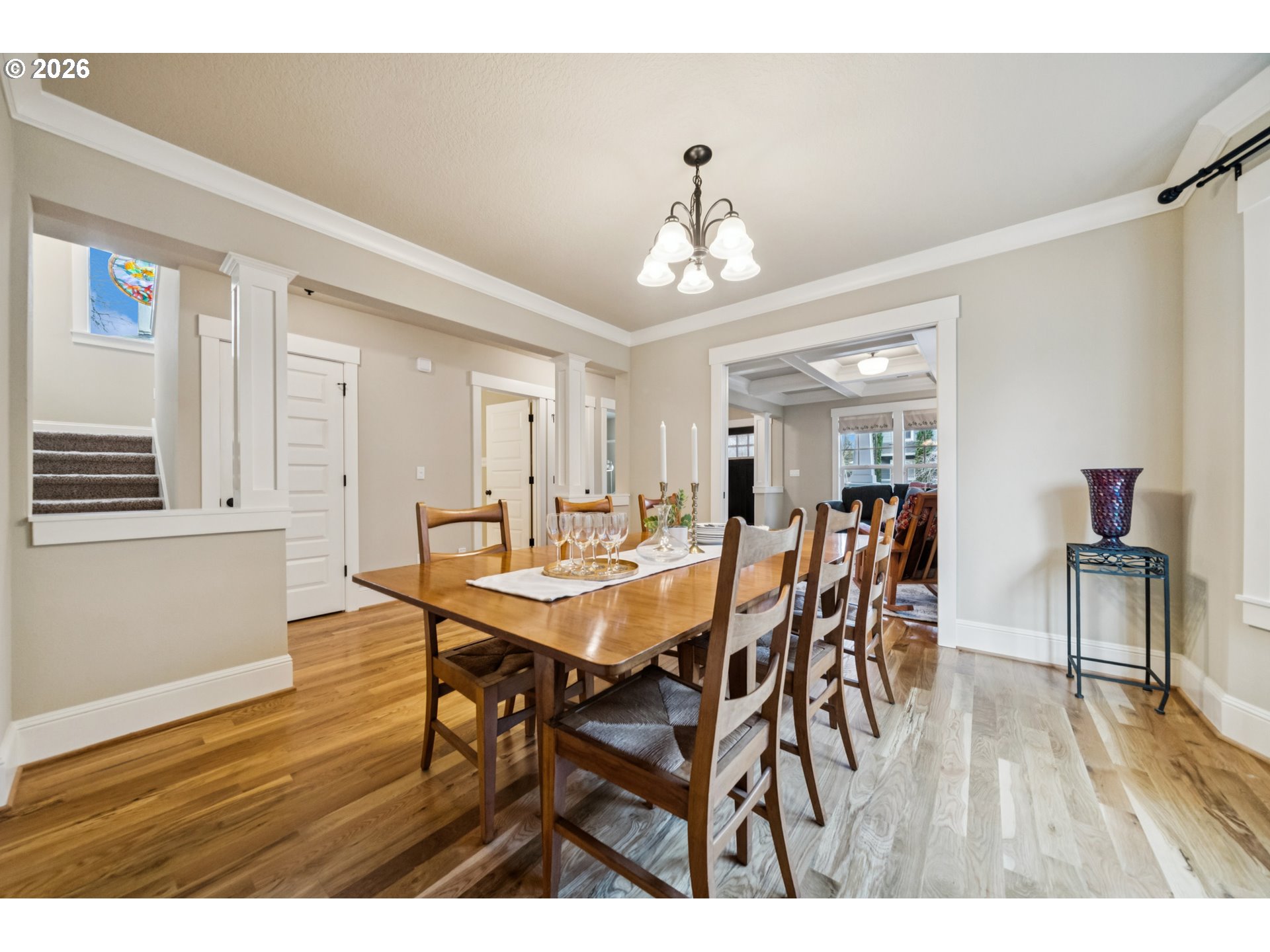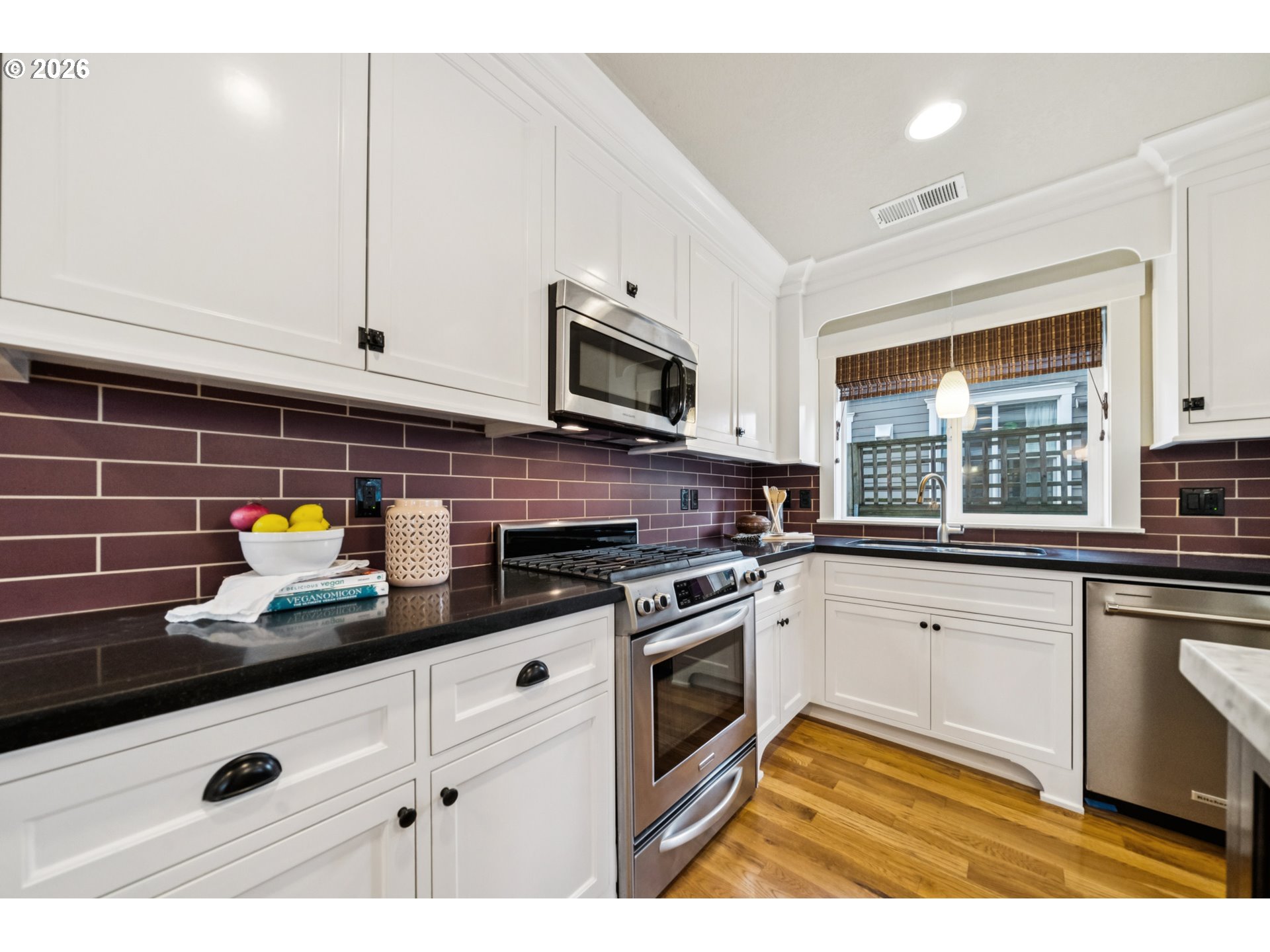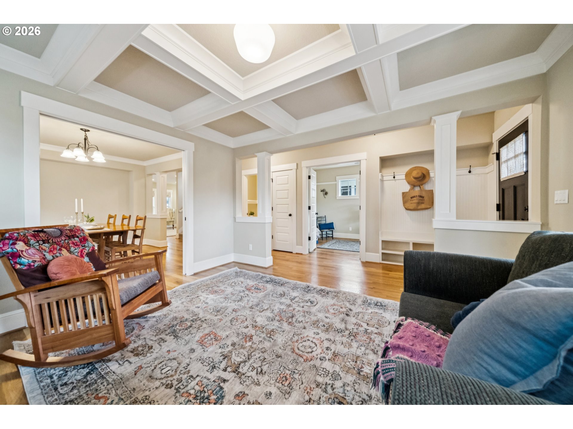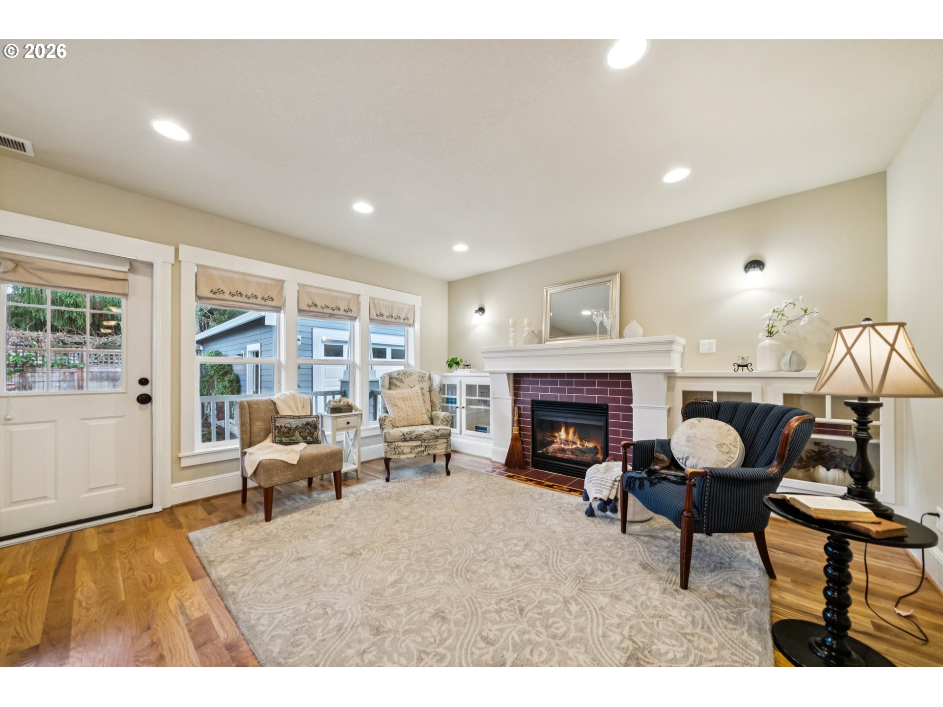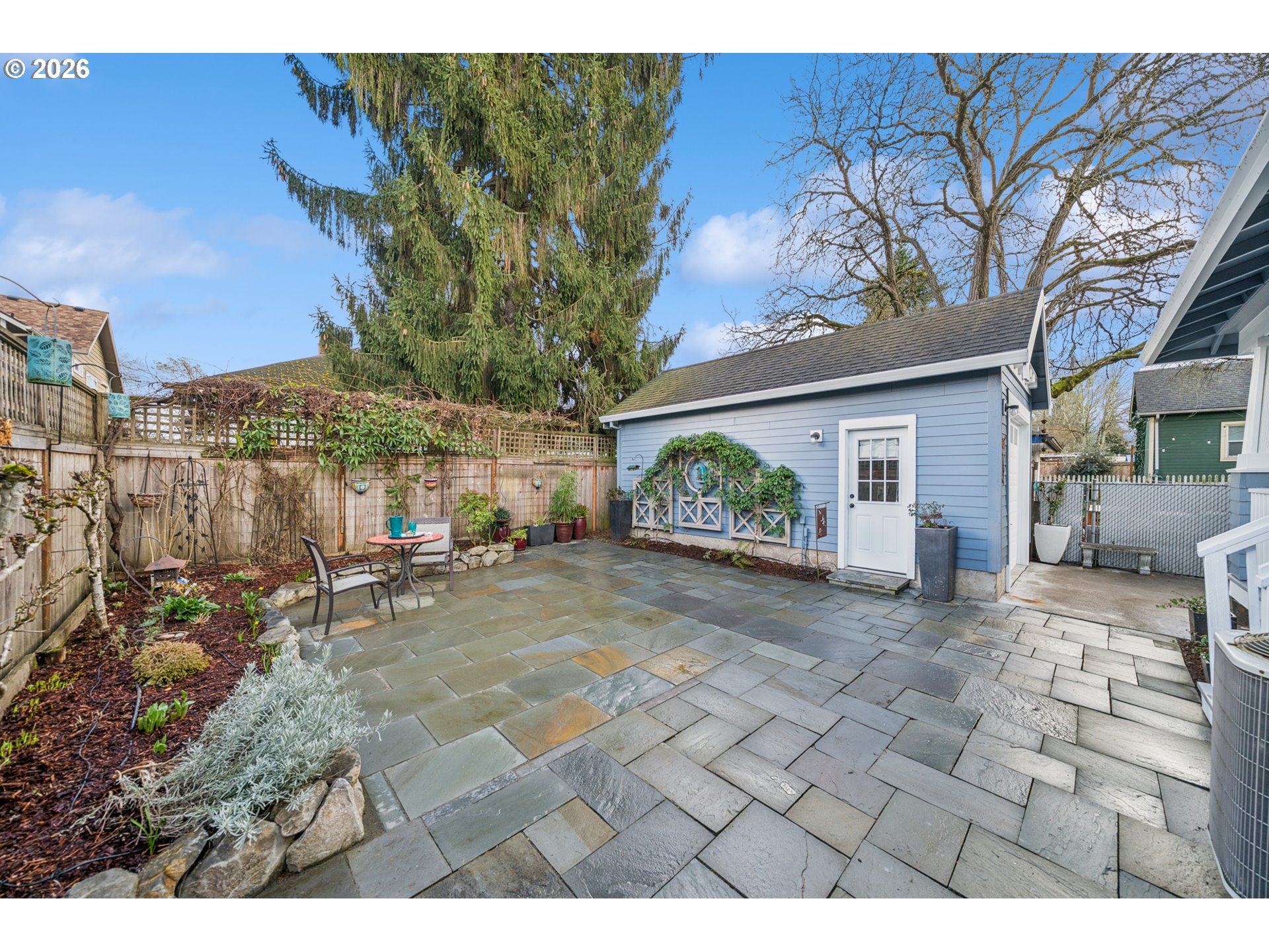- Located in the vibrant Alberta Arts District, this 2013 Craftsman home with 3-bedrooms, main floor office, and 2.5-baths, blends classic charm with modern comfort and fantastic location. Step up to the large, covered front porch and into the spacious living room with hardwood floors and coffered ceilings. Pocket doors open to the formal dining room with bay window while French doors frame the main floor office providing flexible work-from-home or dedicated creative space. At the back of the home, the open kitchen and family room flood with natural light. Centered around a beautiful marble island, the kitchen features a built-in eating nook, generous kitchen pantry, and cozy family room anchored by a gas fireplace with blower. The main floor guest bath includes a utility room while under-the-stairs closet space offers additional room for storage. Upstairs, the spacious primary suite features recessed ceiling lighting, a generous walk-in closet and an ensuite bath with marble counters, tile surrounds, a soaking tub, and walk-in shower. Daily life is a breeze with two additional upper-level bedrooms, upper-level laundry, an additional full bath, plus a central vacuum system and AC throughout the home. Back downstairs, step easily from the family room onto the back porch and out to the low-maintenance and beautifully hardscaped Pennsylvania Bluestone patio. Outdoor living shines with this courtyard style space perfect for entertaining. Espalier pear trees, vines, and shrubs line the private yard and are just beginning to wake up from their winter sleep. With a long driveway and detached garage, the home offers plenty of parking and additional storage. Ideally situated in one of the most pedestrian and bicycle-friendly neighborhoods in Portland with easy access to Alberta shops & restaurants, the North Williams Avenue bike corridor, convenient access to I-5 and downtown Portland, this home offers excellent connectivity for commuting, recreation, and everyday amenities. [Home Energy Score = 6. HES Report at https://rpt.greenbuildingregistry.com/hes/OR10243760]
