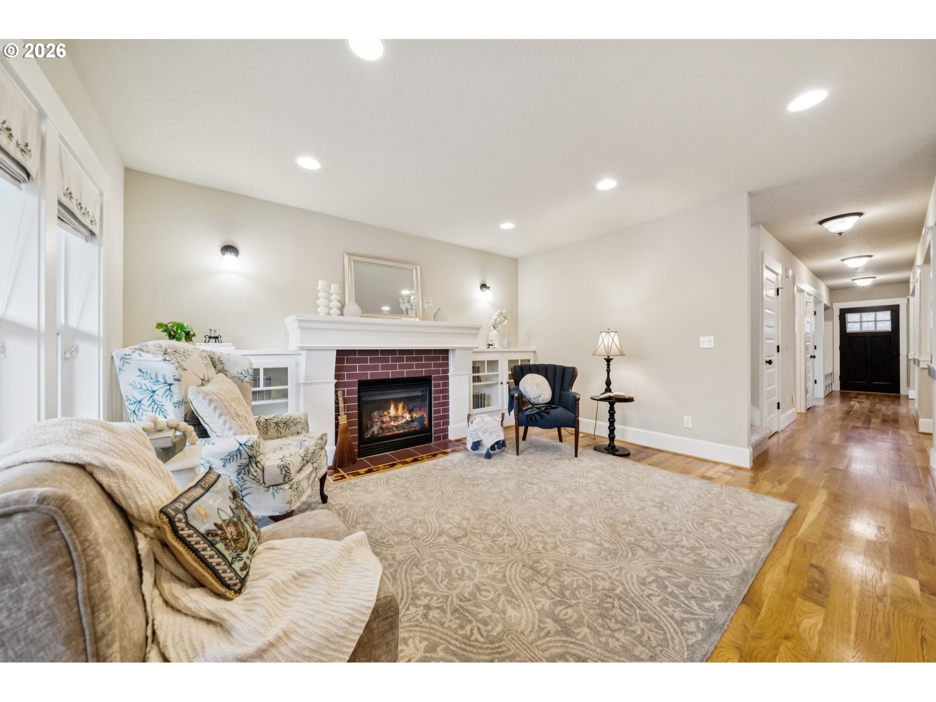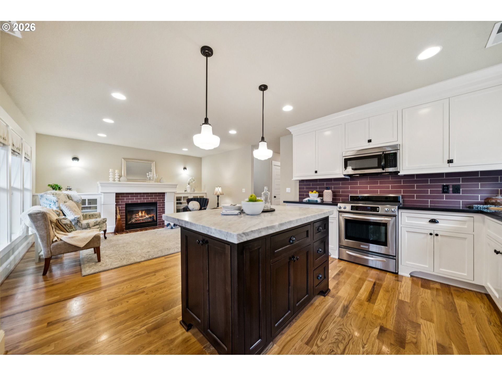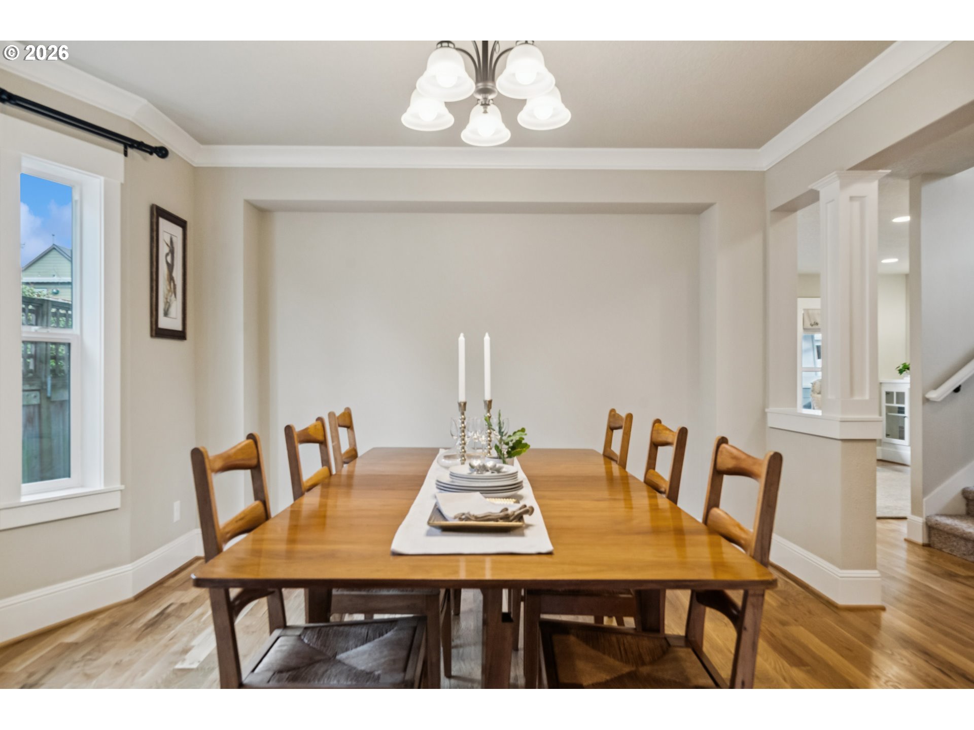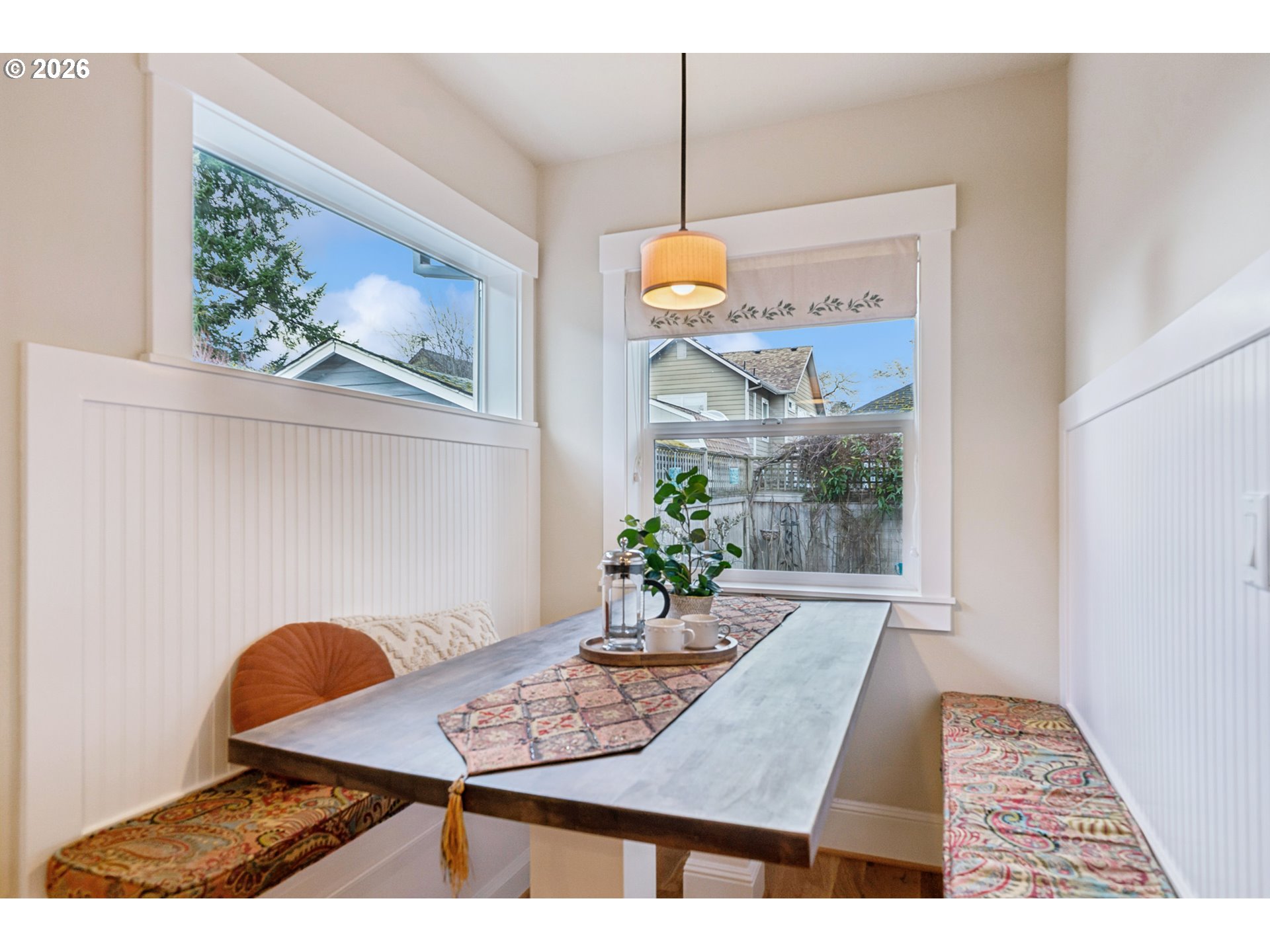 - Located in the vibrant Alberta Arts District, this 2013 Craftsman home with 3-bedrooms, main floor office, and 2.5-baths, blends classic charm with modern comfort and fantastic location. Step up to the large, covered front porch and into the spacious living room with hardwood floors and coffered ceilings. Pocket doors open to the formal dining room with bay window while French doors frame the main floor office providing flexible work-from-home or dedicated creative space. At the back of the home, the open kitchen and family room flood with natural light. Centered around a beautiful marble island, the kitchen features a built-in eating nook, generous kitchen pantry, and cozy family room anchored by a gas fireplace with blower. The main floor guest bath includes a utility room while under-the-stairs closet space offers additional room for storage. Upstairs, the spacious primary suite features recessed ceiling lighting, a generous walk-in closet and an ensuite bath with marble counters, tile surrounds, a soaking tub, and walk-in shower. Daily life is a breeze with two additional upper-level bedrooms, upper-level laundry, an additional full bath, plus a central vacuum system and AC throughout the home. Back downstairs, step easily from the family room onto the back porch and out to the low-maintenance and beautifully hardscaped Pennsylvania Bluestone patio. Outdoor living shines with this courtyard style space perfect for entertaining. Espalier pear trees, vines, and shrubs line the private yard and are just beginning to wake up from their winter sleep. With a long driveway and detached garage, the home offers plenty of parking and additional storage. Ideally situated in one of the most pedestrian and bicycle-friendly neighborhoods in Portland with easy access to Alberta shops & restaurants, the North Williams Avenue bike corridor, convenient access to I-5 and downtown Portland, this home offers excellent connectivity for commuting, recreation, and everyday amenities. [Home Energy Score = 6. HES Report at https://rpt.greenbuildingregistry.com/hes/OR10243760]