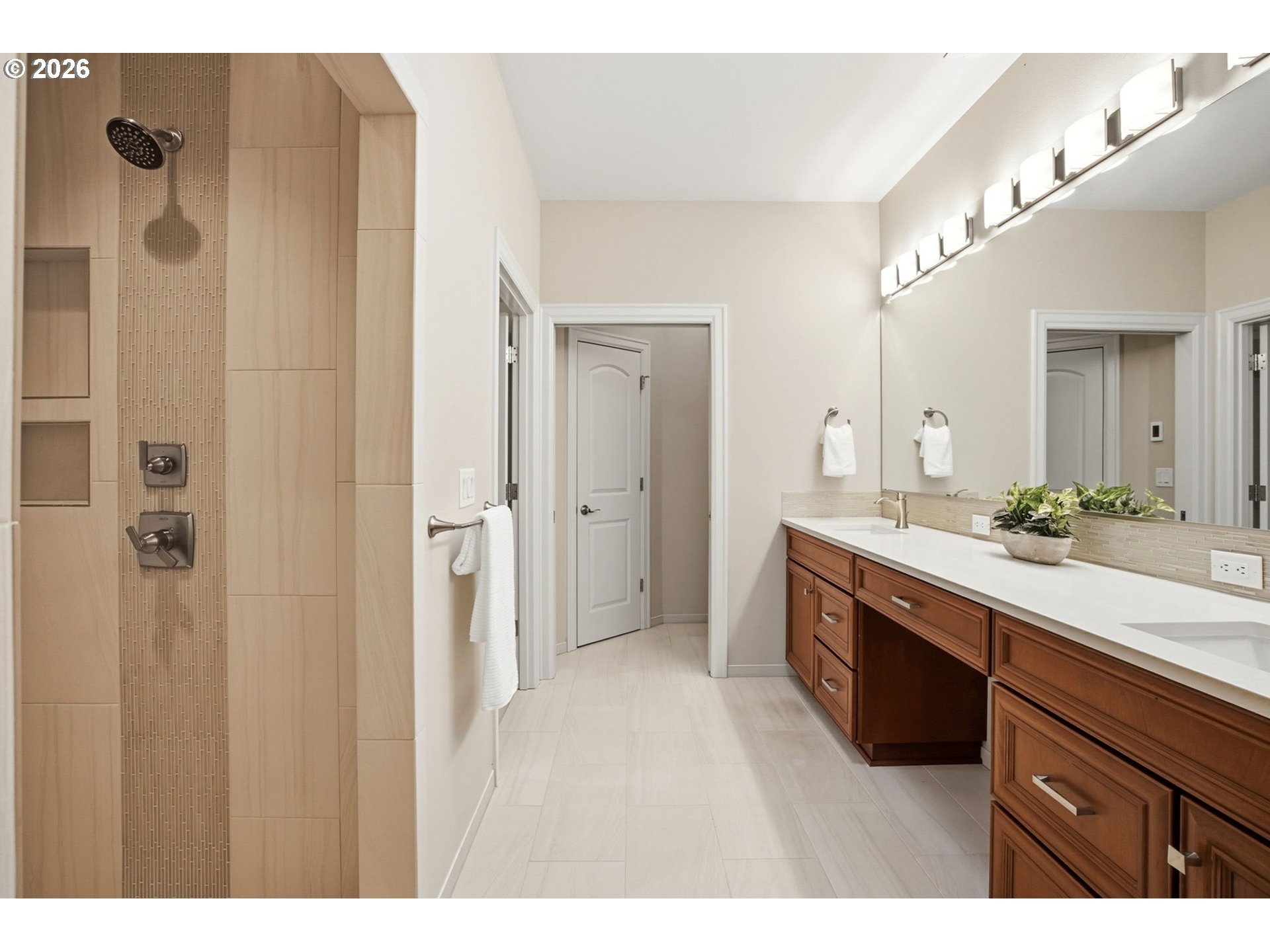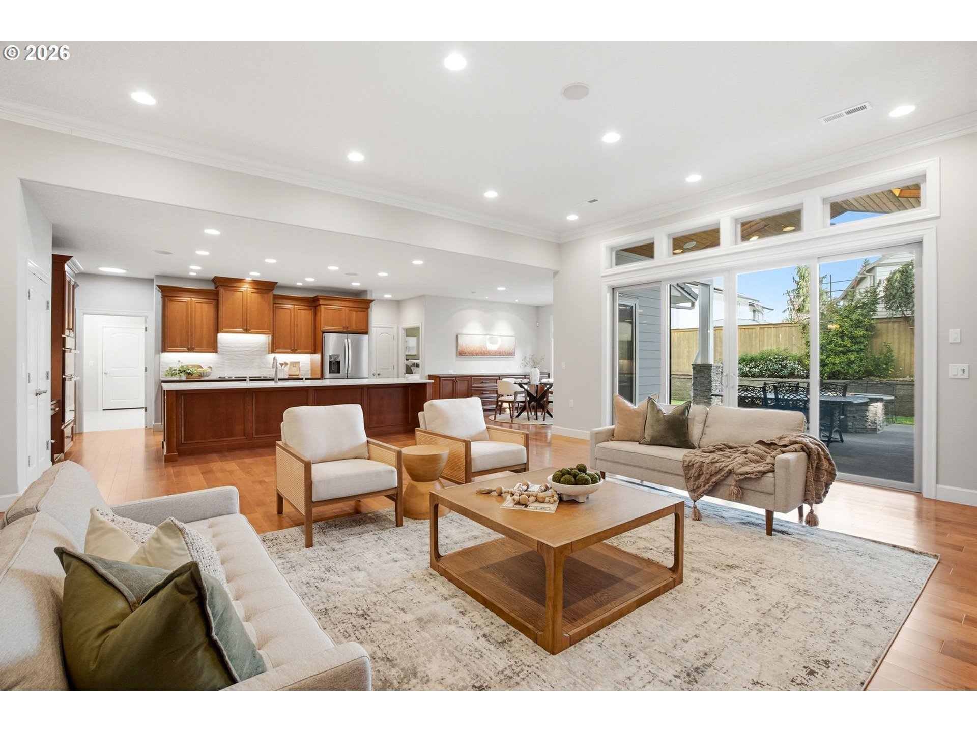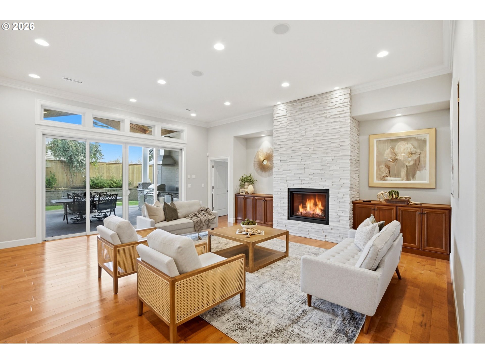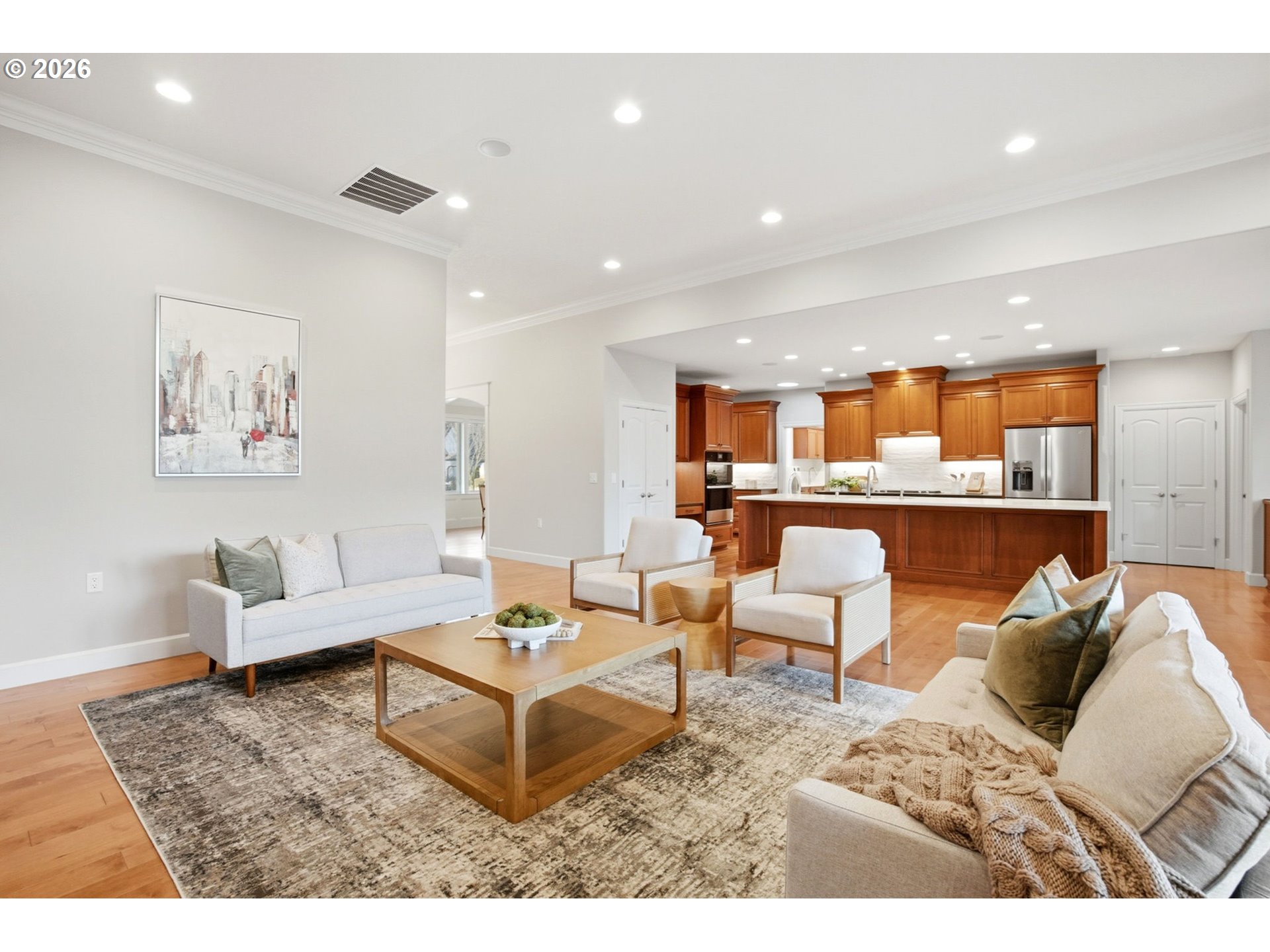 - No-step home! This custom built one owner single-story in popular First Place is tailored for aging in place. Experience refined living with exceptional functionality. 3 BD + office + 3 full BA. Designed for gathering, the spacious great room and well-appointed kitchen feature an impressive island that becomes the natural centerpiece of the home. The split bedroom layout provides separation between the primary suite and secondary bedrooms for increased privacy and quieter living spaces. Bdrm 2 has full bath just down the hall; bdrm 3 has adjoining full bath. Additional accessibility features include wide hallway, wide entrances, extra wide doors, roll in shower in primary, walk-in shower in hall bathroom. All rooms are large with most closets having motion sensor lighting including the walk-in pantry. Solar tubes bring in bright, diffused natural lighting. More highlights include: heated floors in primary bathroom, huge primary walk-in closet, generously sized laundry, slab granite and quartz, soft-close drawers/cabinets, two tankless water heaters, impeccable 3/4” hardwood flooring, abundant storage/closet space, built-in features, high ceilings, butlers pantry, under cabinet lighting, under eve lighting. Office/den with custom full-wall built-in desk designed for two. The large covered patio has remote/motorized shades, wood slat vaulted ceiling, skylights, fans, heaters and built-in fire pit (gas). Also featuring an outdoor entertaining station with built-in BBQ (propane), prep space, storage plus under counter refrigerator. 3 car garage with storage cabinets. Kitchen/patio refrigerators stay, Sonos sound system in great room included, 1-year home warranty included. Near the 3.5 acre neighborhood park featuring paved paths, benches, garden, gazebo, playground and open grass area. There are numerous resident-focused activities too. Conveniently located near groceries, restaurants, medical facilities, vet and easy access to I-205. Truly a standout home!