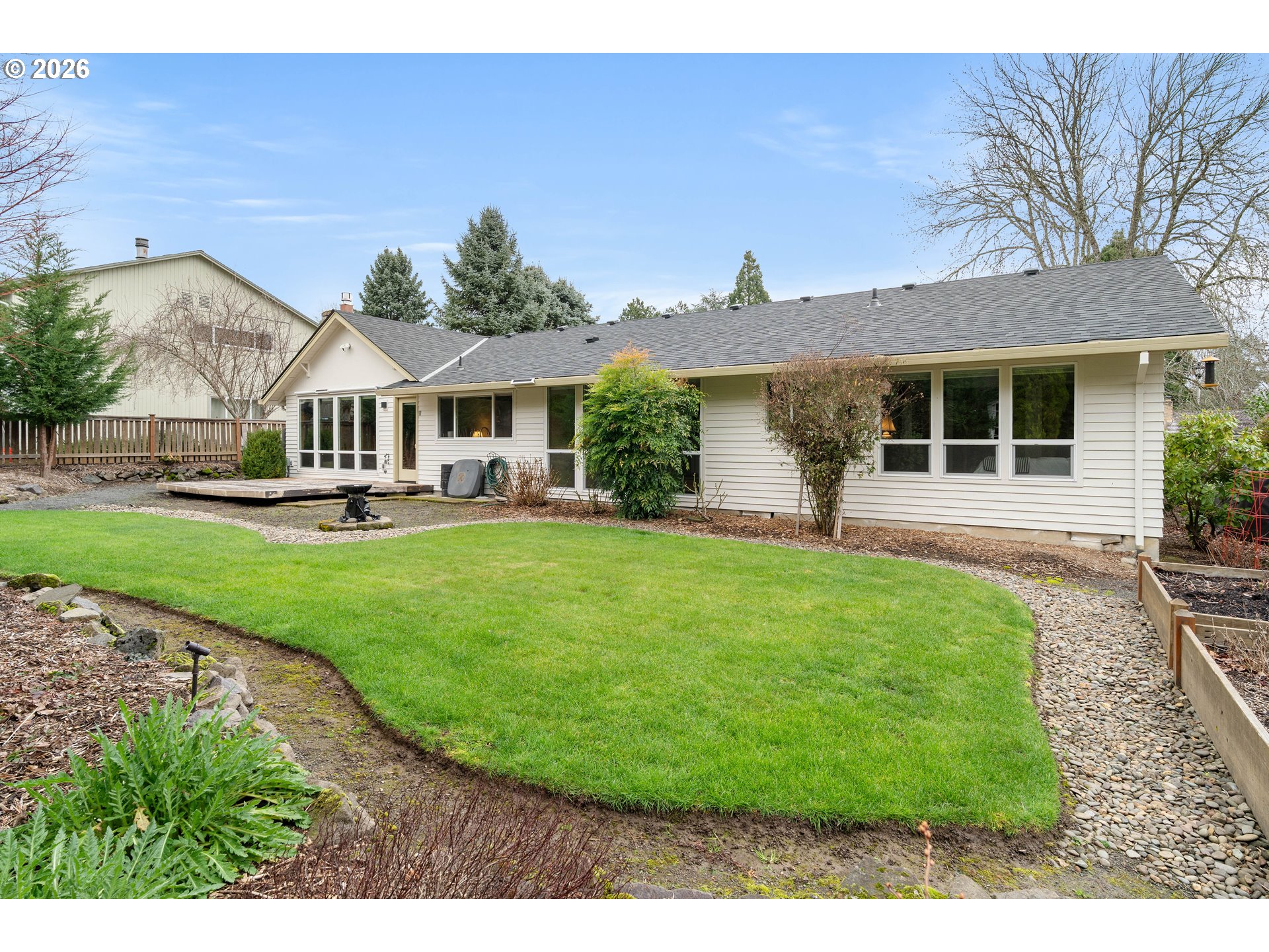 - Fantastic home on a quiet loop street, this Oak Hills ranch offers an exceptional setting just steps from community greenspace and amenities, including the pool and recreation center. The home has been meticulously maintained and thoughtfully updated with a newer roof, furnace, water heater, vinyl double-pane windows, a remodeled kitchen and primary bath, and extensive hardwood flooring throughout. The open kitchen and family room feature beautifully painted cabinetry, quartz countertops with a breakfast bar, and stainless steel appliances. The inviting family room includes a cozy gas fireplace and sliding door leading to the back deck overlooking the beautifully landscaped yard. The layout flows seamlessly into the formal living and dining spaces, making it ideal for entertaining. The oversized primary suite includes an updated ensuite bath with a walk-in tile shower, tile floors, and a slab-counter vanity. Two additional bedrooms offer wall-to-wall carpet and abundant natural light. Oak Hills is an unbeatable neighborhood with outstanding amenities, including an Olympic-sized pool, recreation center, playgrounds, expansive green spaces with walking paths, community events, and more. Conveniently located near shopping, dining, major employers, and Hwy 26 for an easy commute.