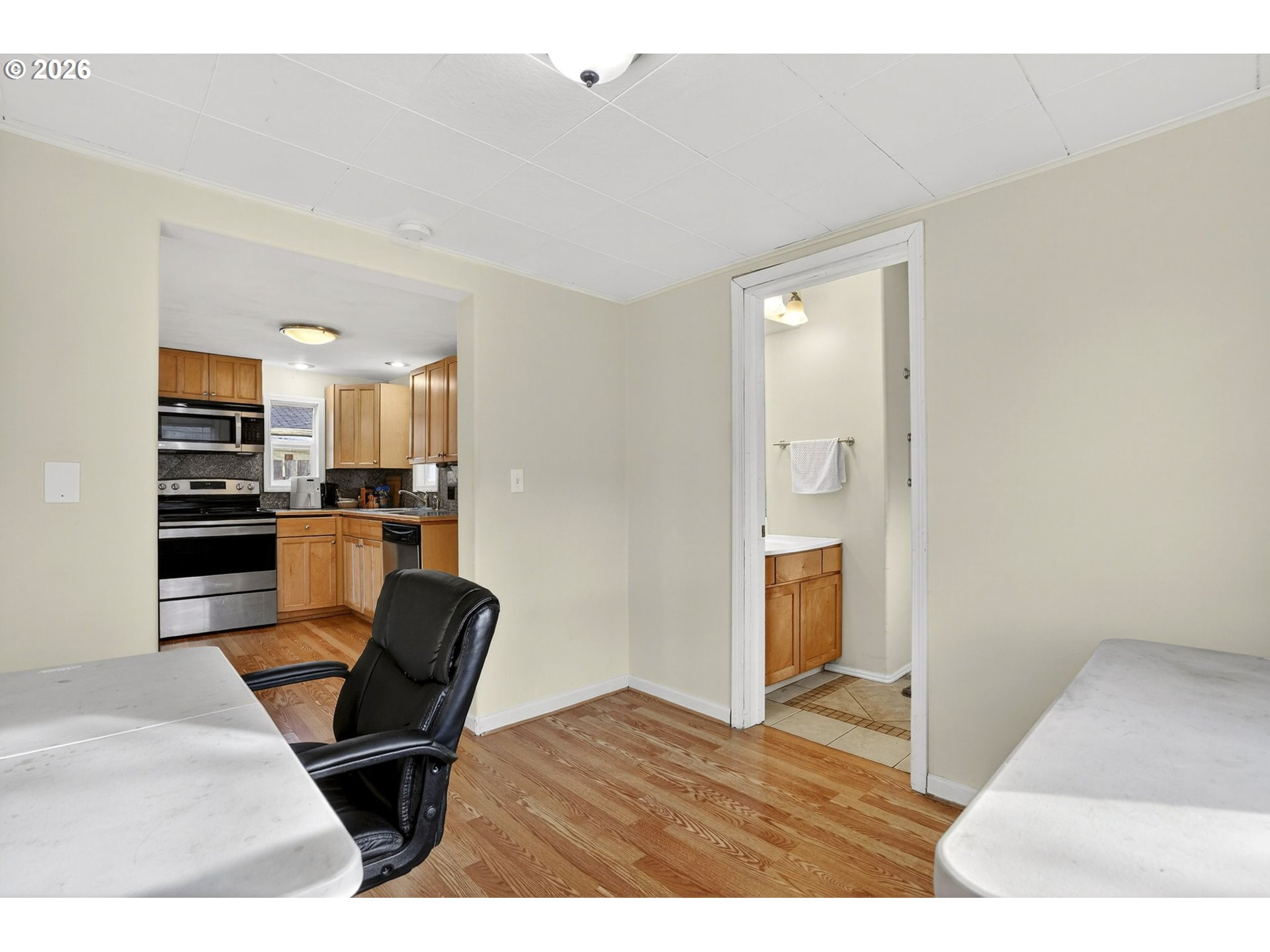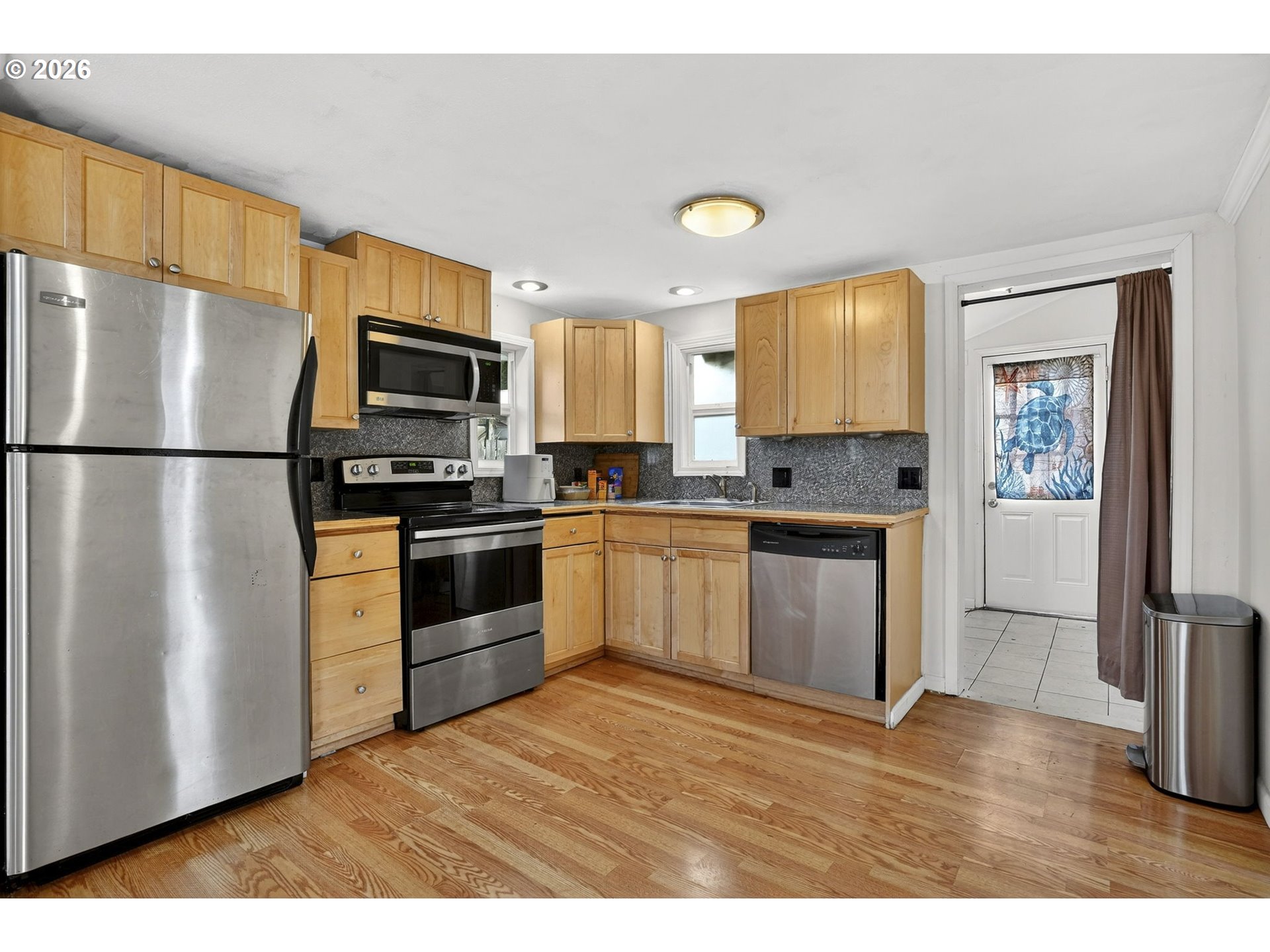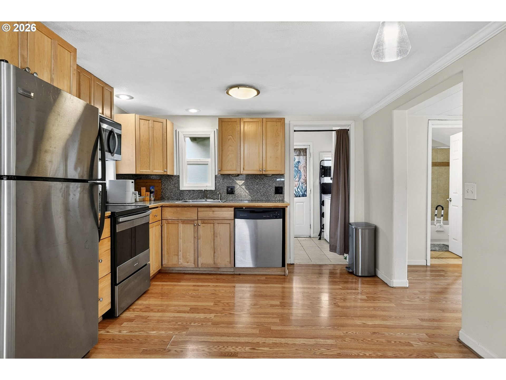 - One-level Bungalow near Washougal schools and a stroll to the park and river. Inviting front porch welcomes you into an open layout. Updates include kitchen and flooring and paint. Stainless-steel appliances. Two bedrooms and one full bathroom with tub/shower. Laundry room serves as a convenient mud room to the fully fenced backyard. Garden area and detached one-car garage.