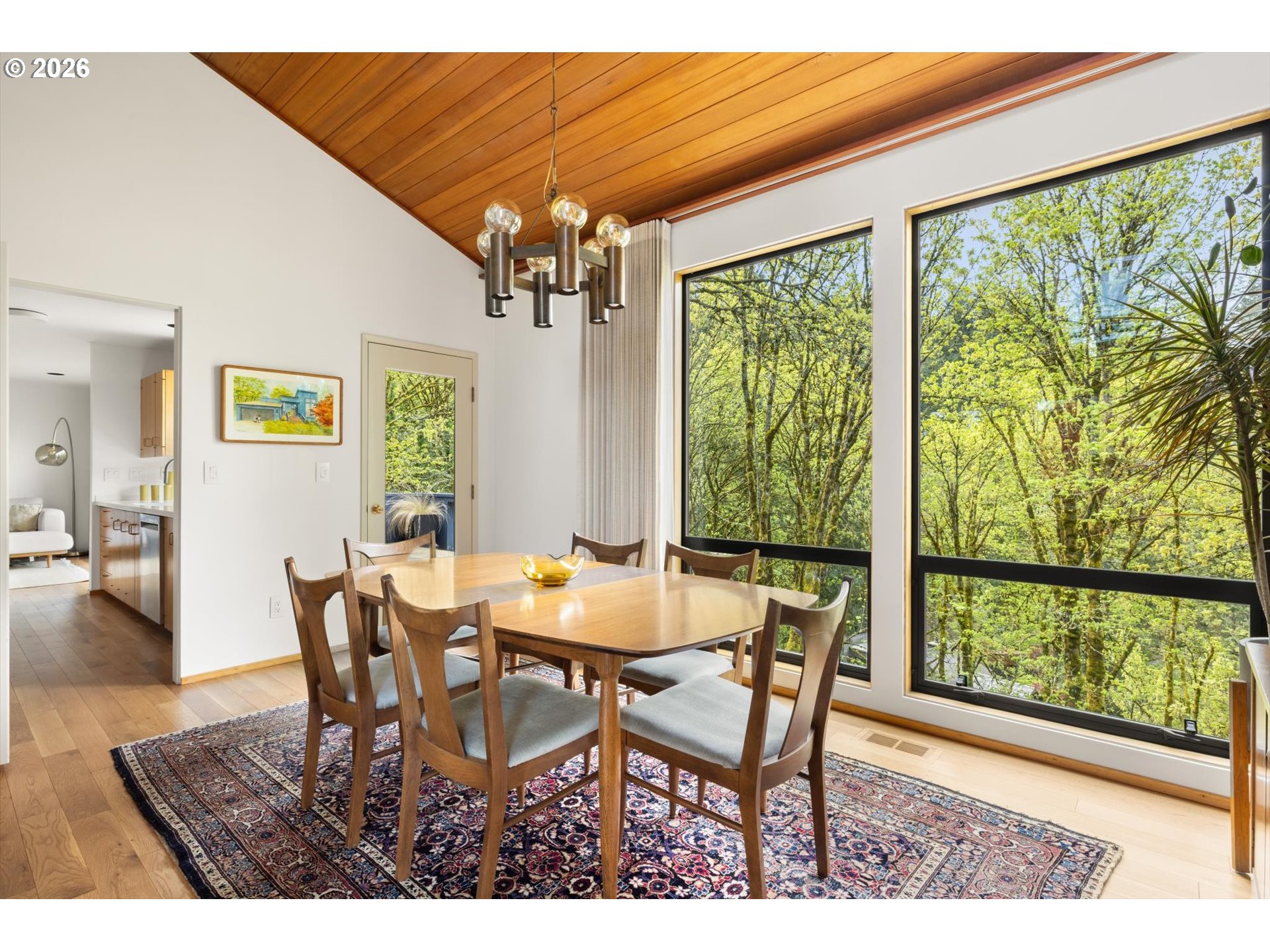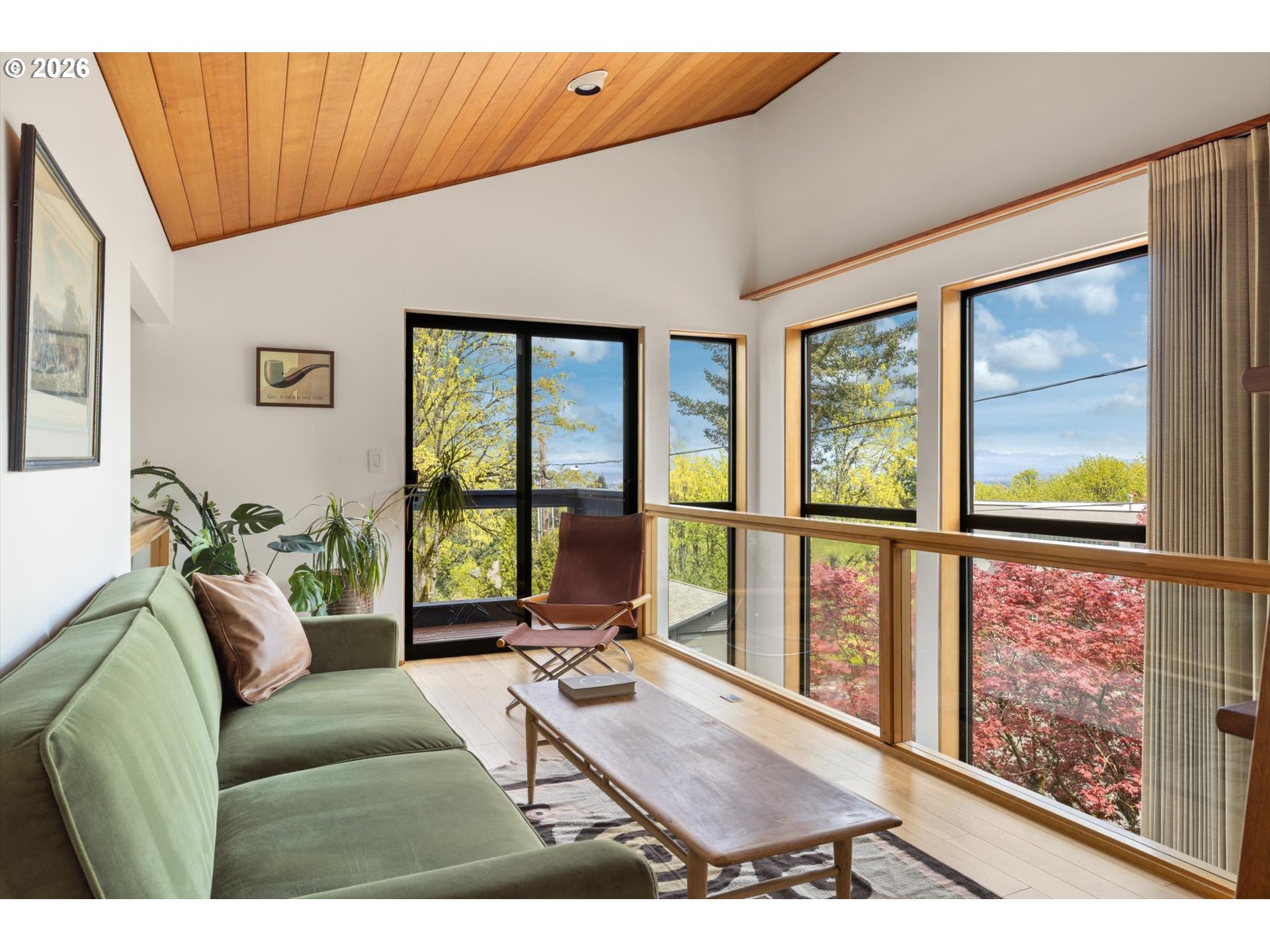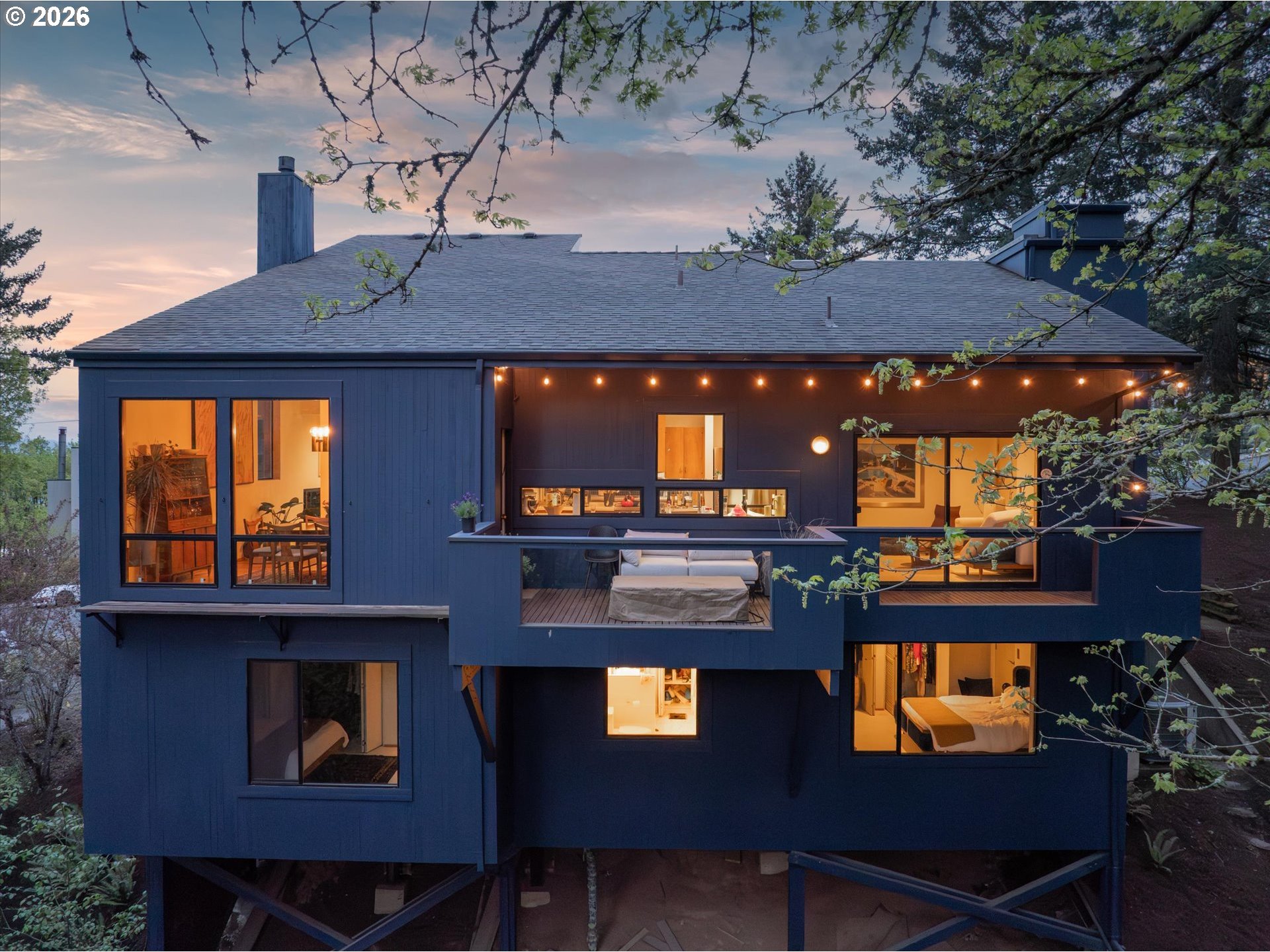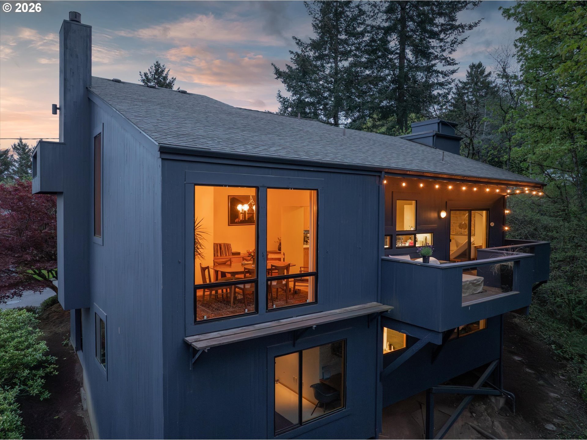 - ** OPEN HOUSE Sat 4/25 12-3pm. Private tours for buyers without agent representation can be booked at calendly.com/tour-time ** Designed by architectural team of York & Yodogawa & originally built for H. Chik M. Erzurumlu, a structural engineer & longtime Portland State professor, this home reflects a clear understanding of how space, light, & structure come together over time. When his wife fell ill, an elevator was added to connect each floor and the garage, allowing them to remain in the home they had created together. Set at the end of a quiet cul-de-sac, this one-of-a-kind home is grounded in its setting, balancing open outlooks with a sense of privacy among the surrounding trees. Natural light pours through expansive windows, including a dramatic two-story living room with floor to ceiling glass that frames Mt. St. Helens and layered views. A series of levels, loft space, & decks create moments for gathering & retreat, with a dedicated formal dining area positioned to take in the forest outlook. The kitchen is complete with Bertazzoni oven and Bosch refrigerator. A vaulted cedar ceiling brings warmth and scale to the main living areas, complemented by a gas fireplace, 4-inch oak floors underfoot, & custom cabinetry that carries throughout the home. Bathrooms are finished in imported travertine and Ann Sacks tile. The lower level is dedicated to three bedrooms, each with generous picture windows that look directly into the surrounding forest. The loft, complete with a wet bar & private deck, offers a more tucked away place to retreat, with generous storage thoughtfully integrated. With a high efficiency gas furnace, a whole house generator, & low maintenance grounds, the home is as considered in function as it is in feeling. In a setting where multi-level homes are often the norm, the elevator to every level, including the garage, offers long term ease and flexibility, all just moments from OHSU, nearby parks, trailheads, and a quick connection into the city.