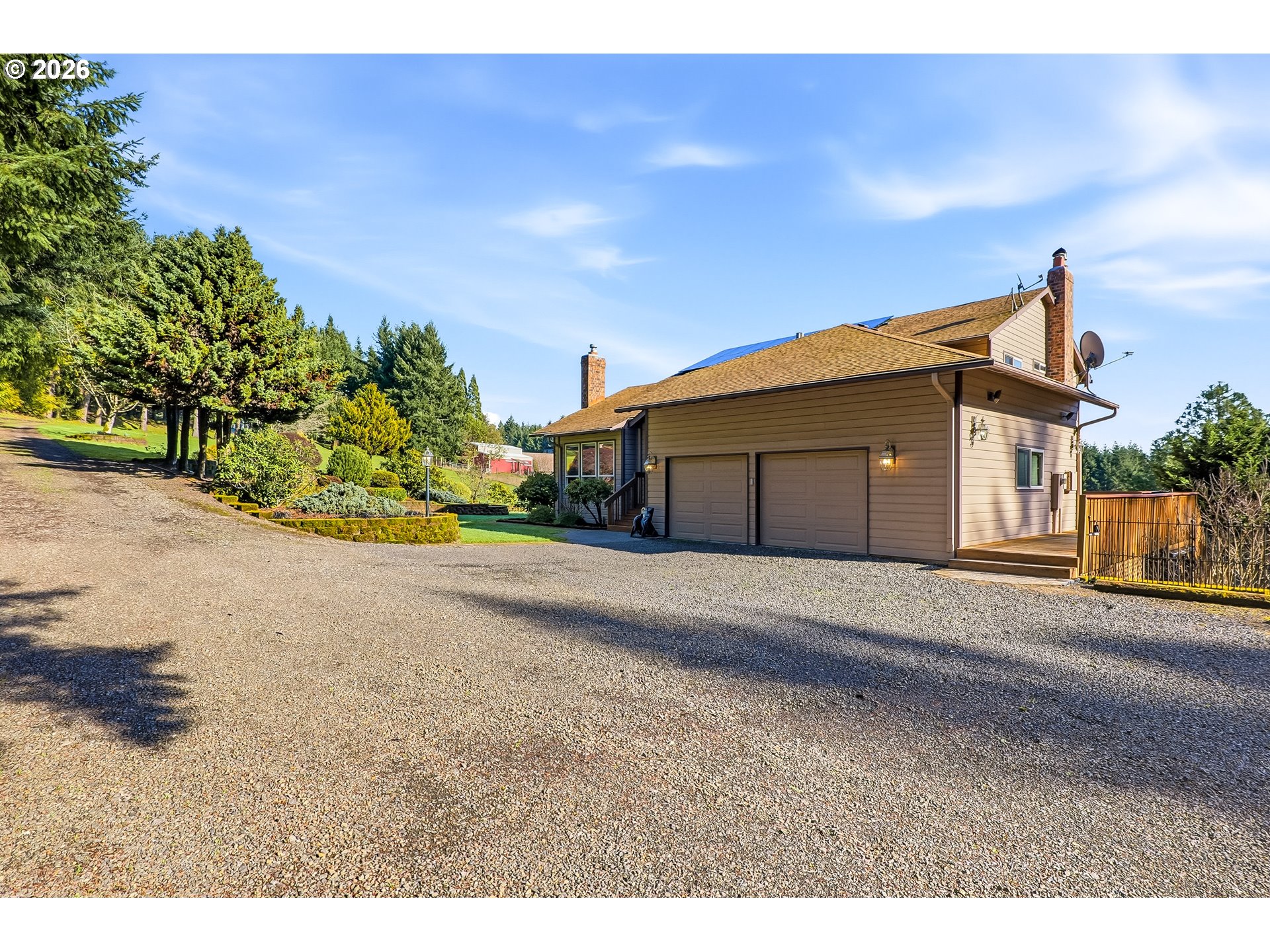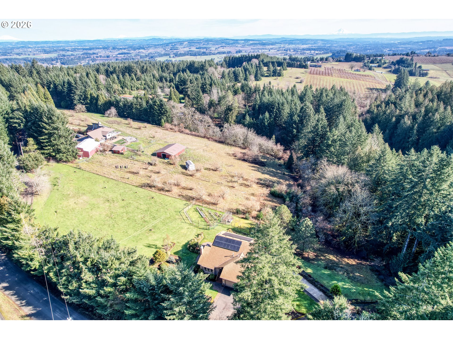 - Tucked into 4.85 beautifully maintained acres in sought-after rural Hillsboro, this one-owner estate offers a rare blend of privacy, scale and timeless Northwest charm. Built in 1988 this 4-bedroom, 3.5-bath home spans 3,545 square feet designed for effortless entertaining and comfortable everyday living. A grand entry with soaring vaulted ceilings and an elegant wrought-iron staircase creates a dramatic first impression, while expansive picture windows fill the living room with natural light and showcase tranquil territorial views. The classic brick fireplace with propane insert anchors the space with warmth and character. The kitchen blends style and function with stainless steel appliances, solid-surface counters, custom cabinetry, engineered hardwood floors and an island with 5-burner propane cooktop. Sliding doors open to a spacious deck, ideal for morning coffee or sunset gatherings. The dining room is perfect for hosting, while the cozy family room features a propane wood stove, brick alcove and seamless backyard access. Upstairs, the oversized primary suite offers a private retreat with its own deck overlooking the garden, plus a spacious en-suite bath with dual vanity, walk-in shower and generous closet space. Three additional bedrooms and a full bath provide flexibility for everyday living or a work from home option. The daylight basement is designed for gatherings with friends and family with custom bar seating, beverage coolers, built-ins, a full bath, 800-bottle wine cellar and versatile bonus areas. Outside, mature landscaping, raised beds, fruit trees, a year-round creek and a bocce ball court create a peaceful, resort-like setting. A 24x36 three-bay shop, solar panels and updated systems add function and efficiency, all just 15 minutes from Hillsboro.