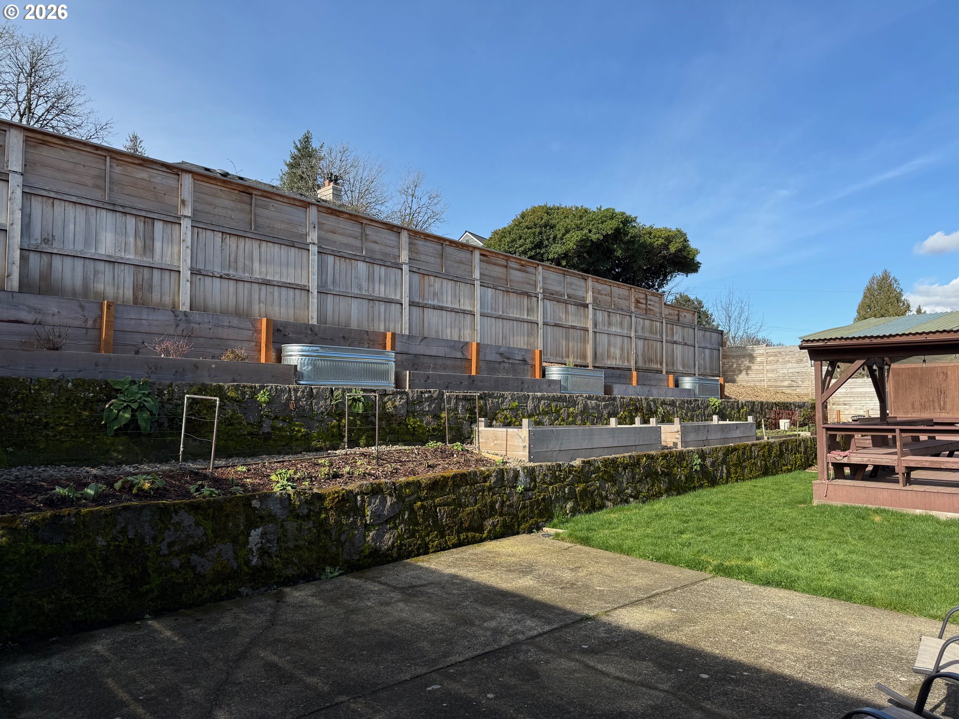 - Built-in Hot Tub, Covered Deck, Deck, Fenced, Garden, Patio, Porch, Public Road, Raised Beds, Sprinkler, Yard