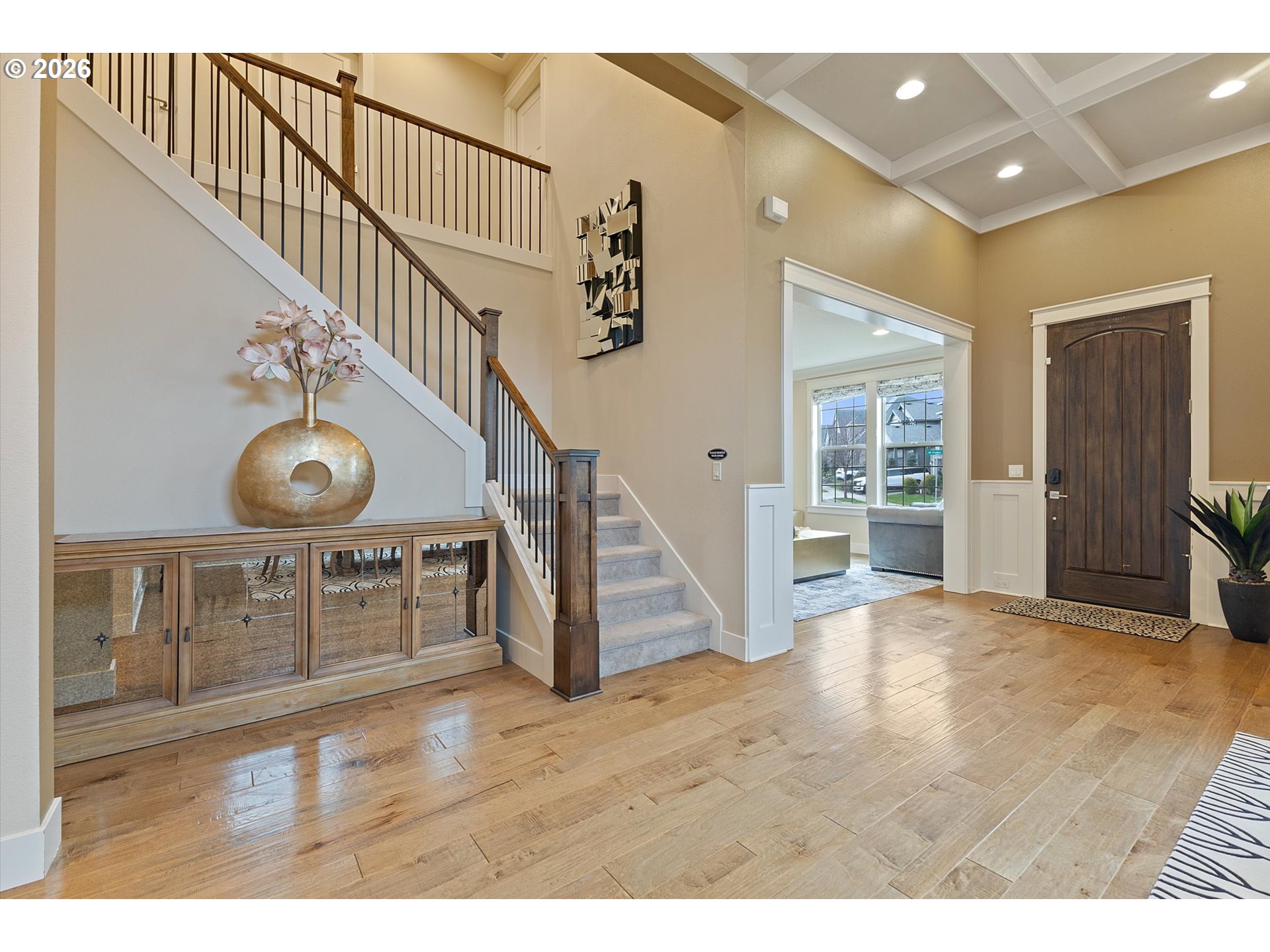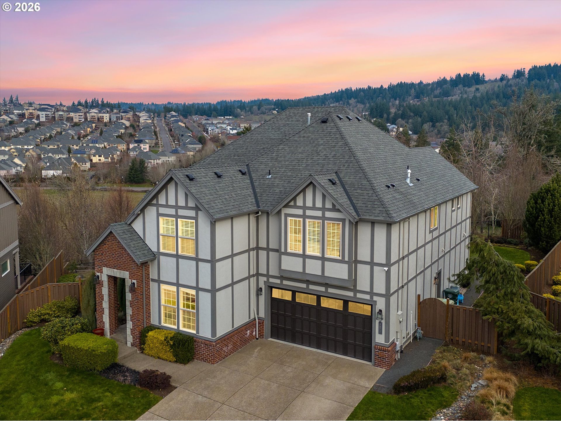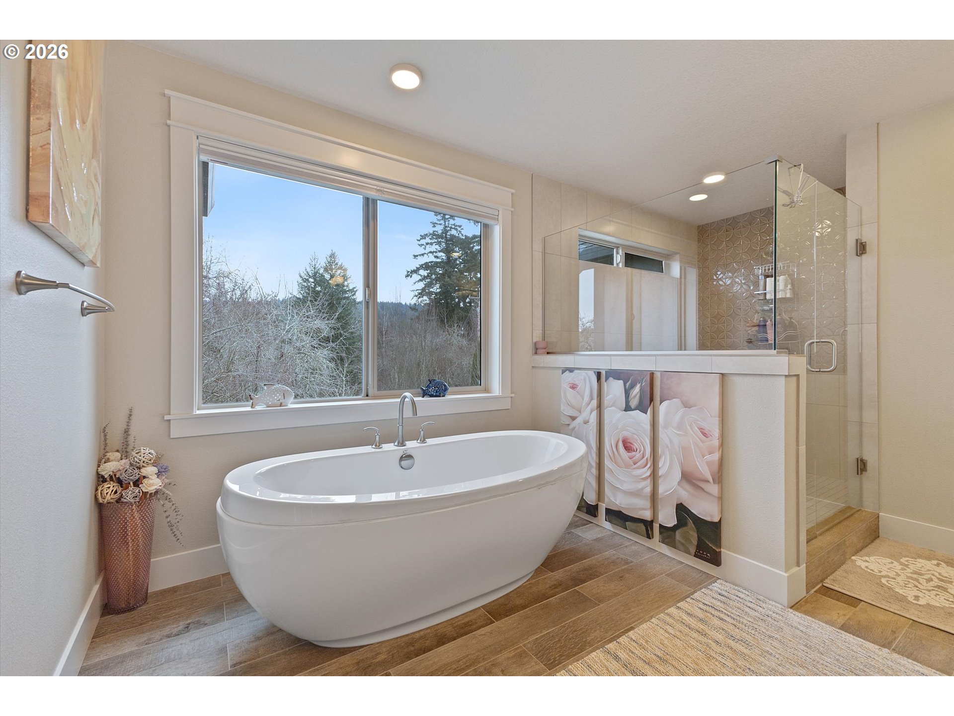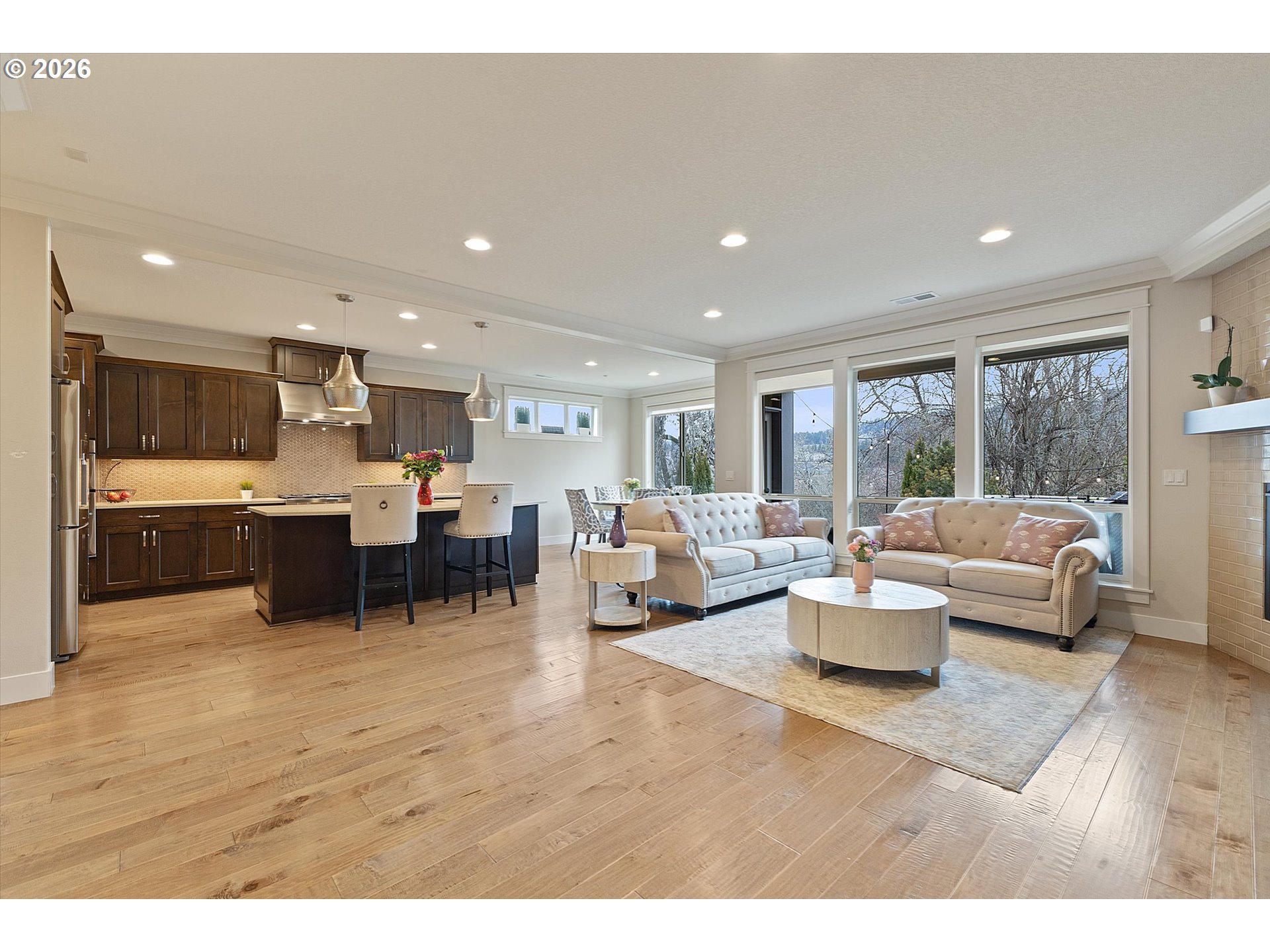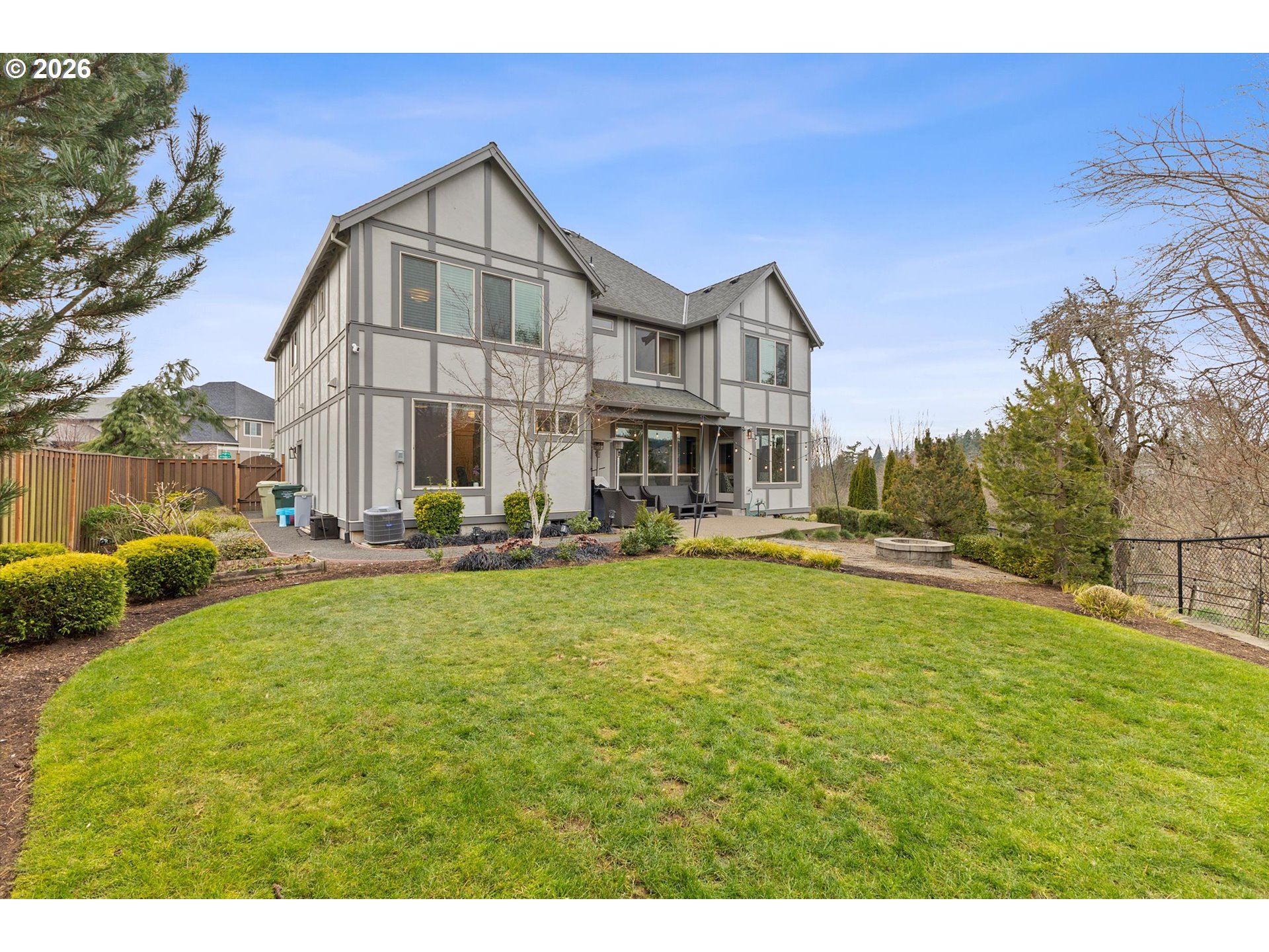 - This special home backs up to open space, with wooded views. There are upscale finishes throughout the thoughtfully laid out floor plan. The entry and dining room feature high box beam ceilings and extended engineered hardwood flooring, creating a warm, elegant first impression. The kitchen offers a nice layout with extensive tile and premium finishes, opening to a great room with a full-height tiled fireplace and custom built-ins.Bathrooms include extensive tile work, a freestanding soaking tub, and a frameless glass shower. The bonus room includes a wet bar, and additional custom built-ins are found in the hall and bonus areas. A private guest suite on the main level adds flexibility. Easy outdoor living with the patio, firepit, and tree-lined green space beyond the lawn. Energy Performance Score provided by Energy Trust of Oregon. Upgraded light fixtures in places.
