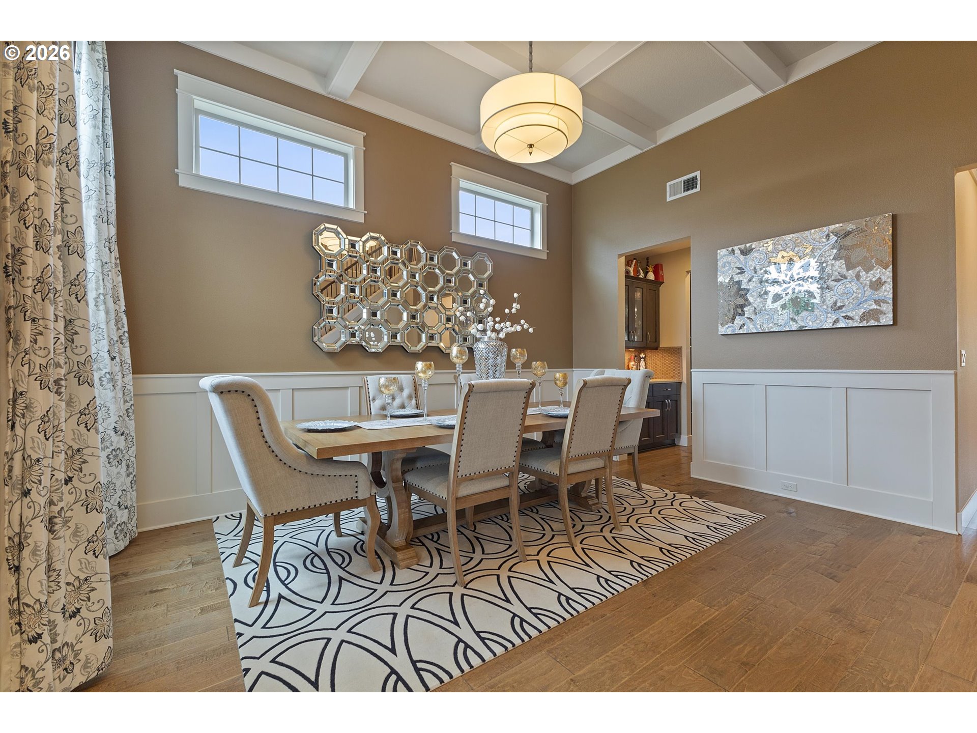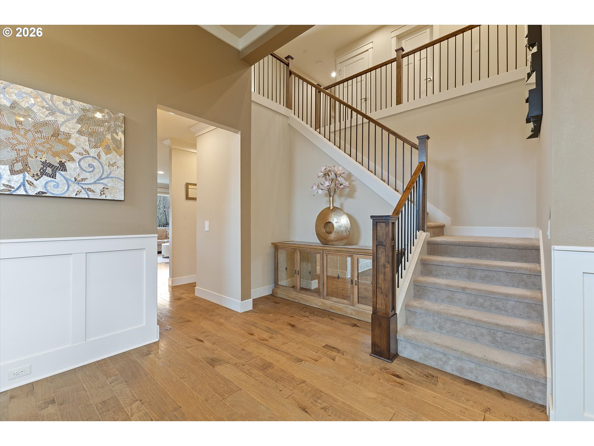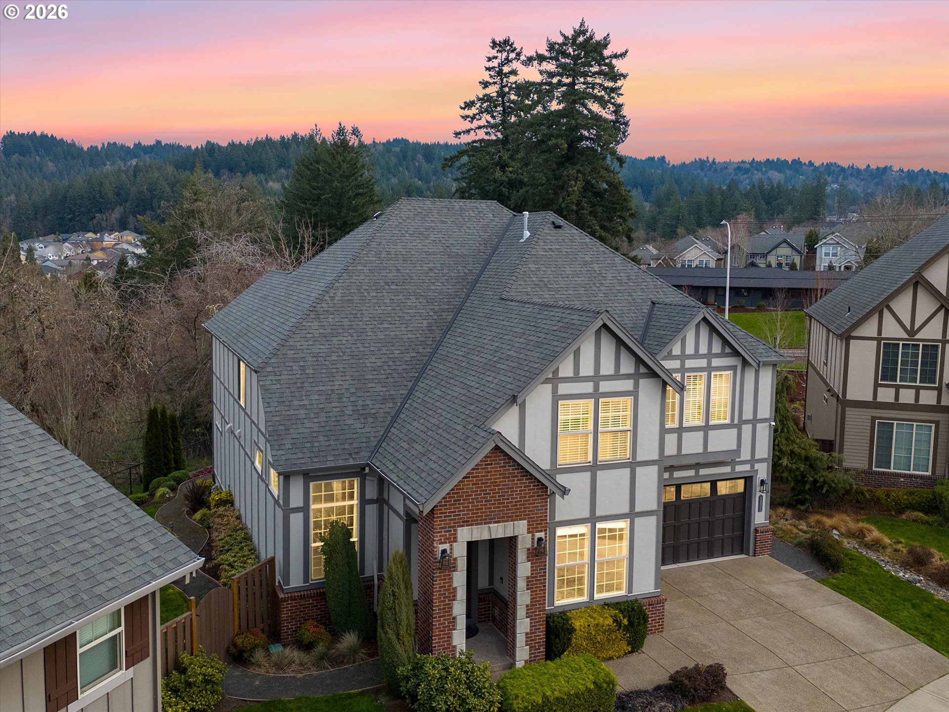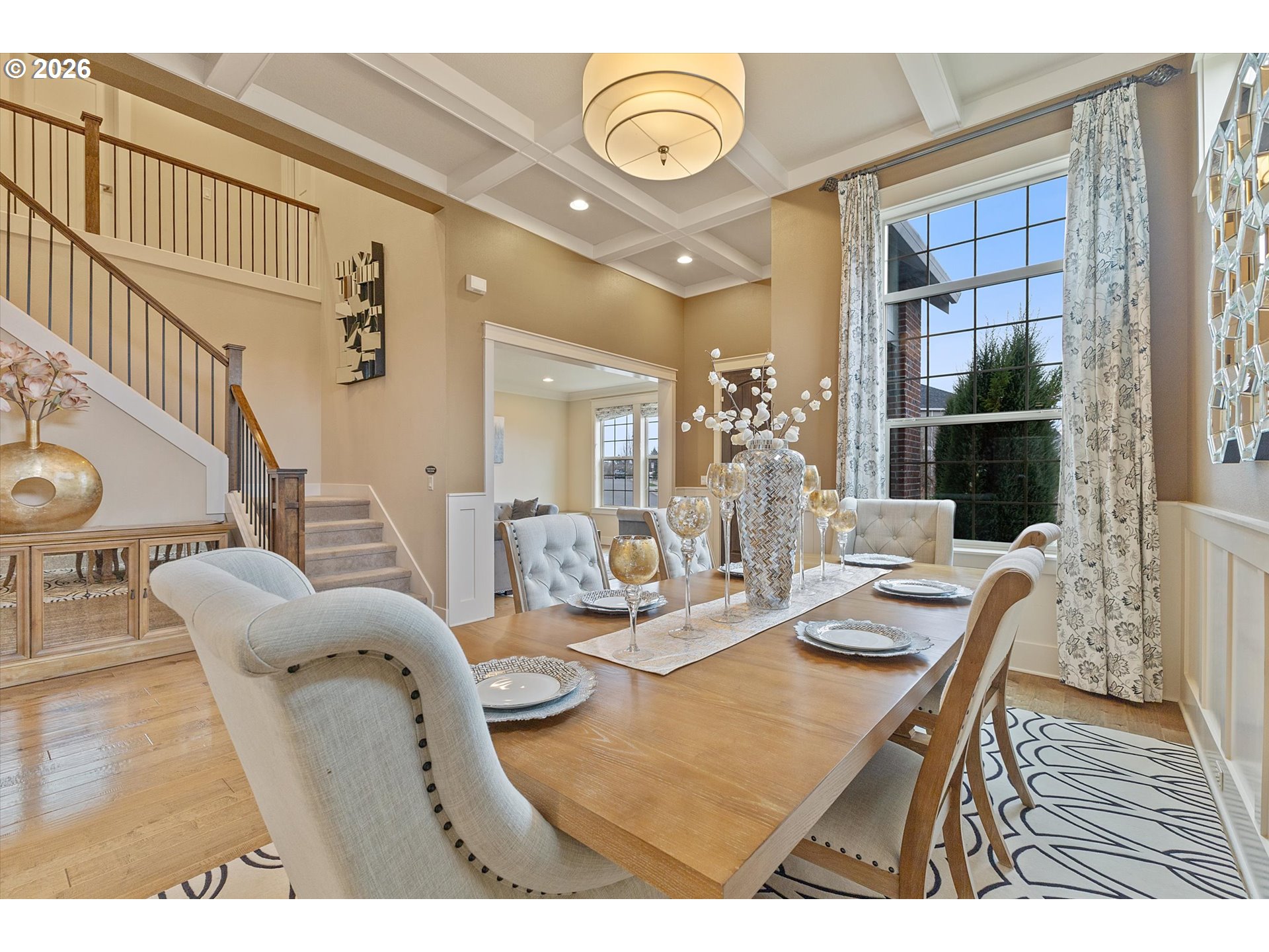 - This special home backs up to open space, with wooded views. There are upscale finishes throughout the thoughtfully laid out floor plan. The entry and dining room feature high box beam ceilings and extended engineered hardwood flooring, creating a warm, elegant first impression. The kitchen offers a nice layout with extensive tile and premium finishes, opening to a great room with a full-height tiled fireplace and custom built-ins.Bathrooms include extensive tile work, a freestanding soaking tub, and a frameless glass shower. The bonus room includes a wet bar, and additional custom built-ins are found in the hall and bonus areas. A private guest suite on the main level adds flexibility. Easy outdoor living with the patio, firepit, and tree-lined green space beyond the lawn. Energy Performance Score provided by Energy Trust of Oregon. Upgraded light fixtures in places.