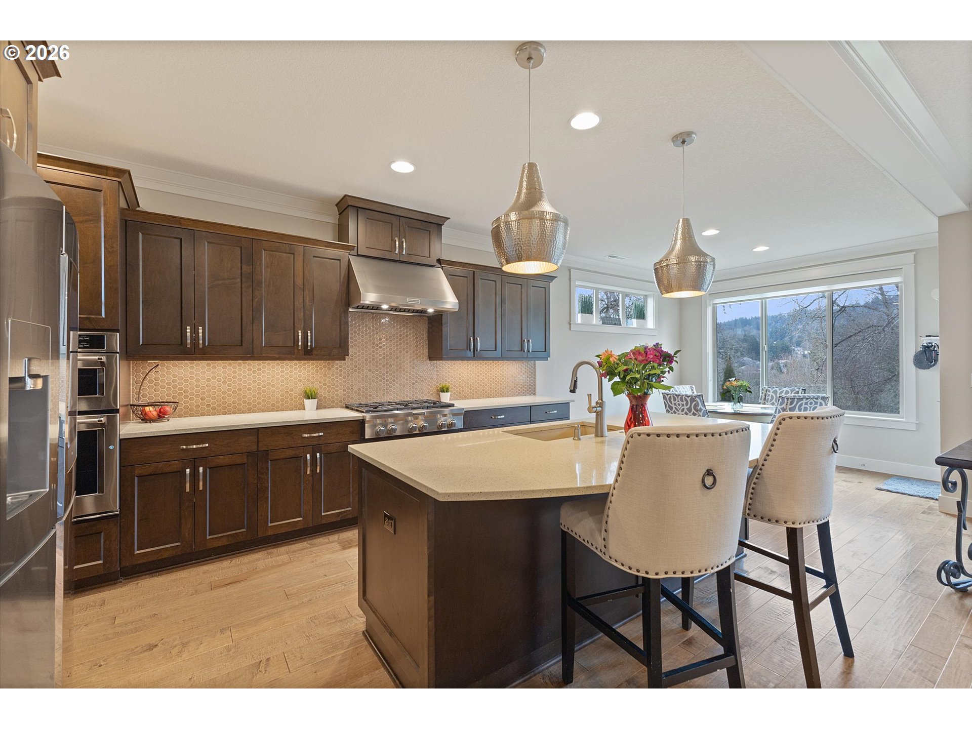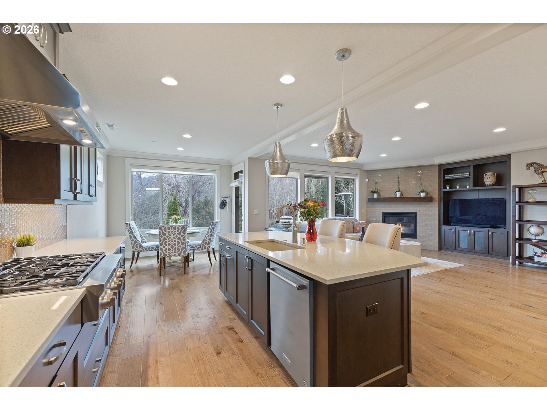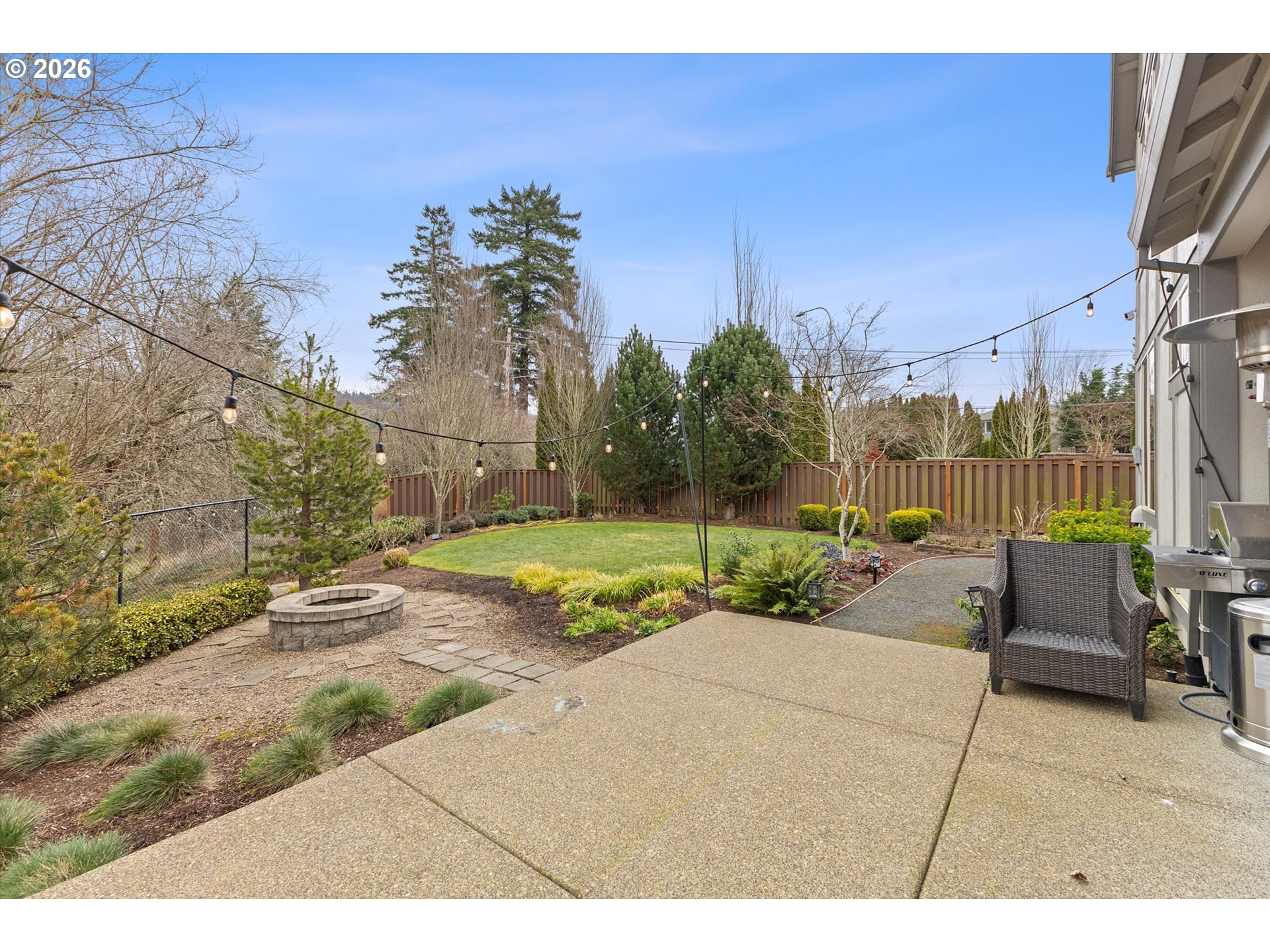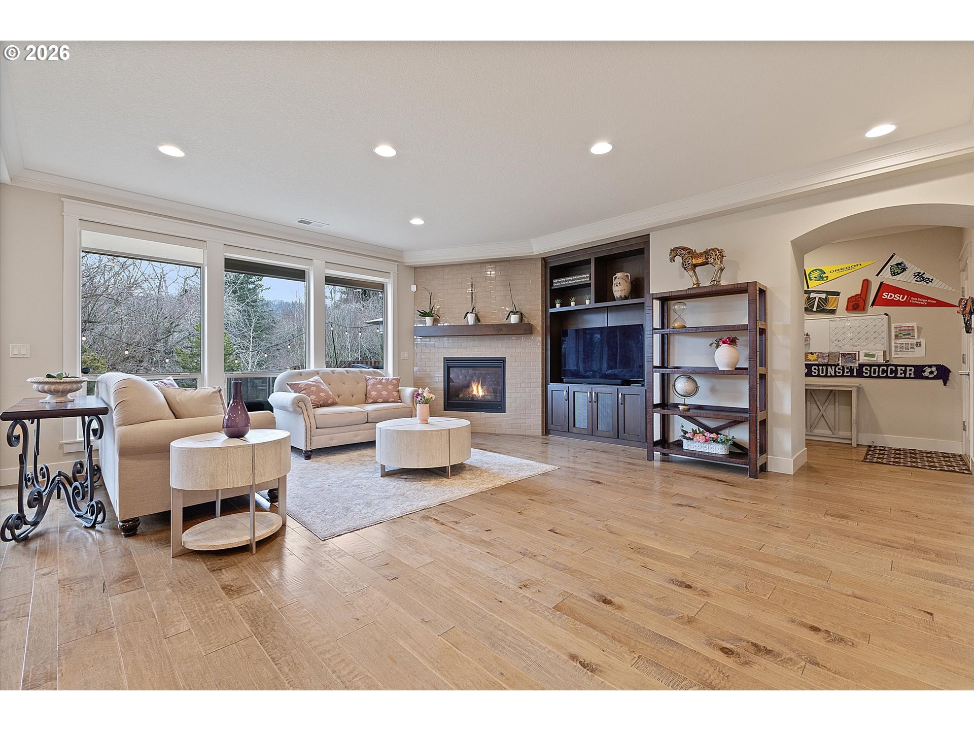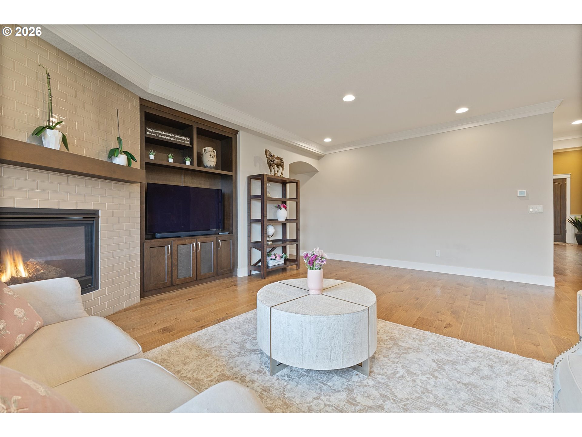 - This special home backs up to open space, with wooded views. There are upscale finishes throughout the thoughtfully laid out floor plan. The entry and dining room feature high box beam ceilings and extended engineered hardwood flooring, creating a warm, elegant first impression. The kitchen offers a nice layout with extensive tile and premium finishes, opening to a great room with a full-height tiled fireplace and custom built-ins.Bathrooms include extensive tile work, a freestanding soaking tub, and a frameless glass shower. The bonus room includes a wet bar, and additional custom built-ins are found in the hall and bonus areas. A private guest suite on the main level adds flexibility. Easy outdoor living with the patio, firepit, and tree-lined green space beyond the lawn. Energy Performance Score provided by Energy Trust of Oregon. Upgraded light fixtures in places.