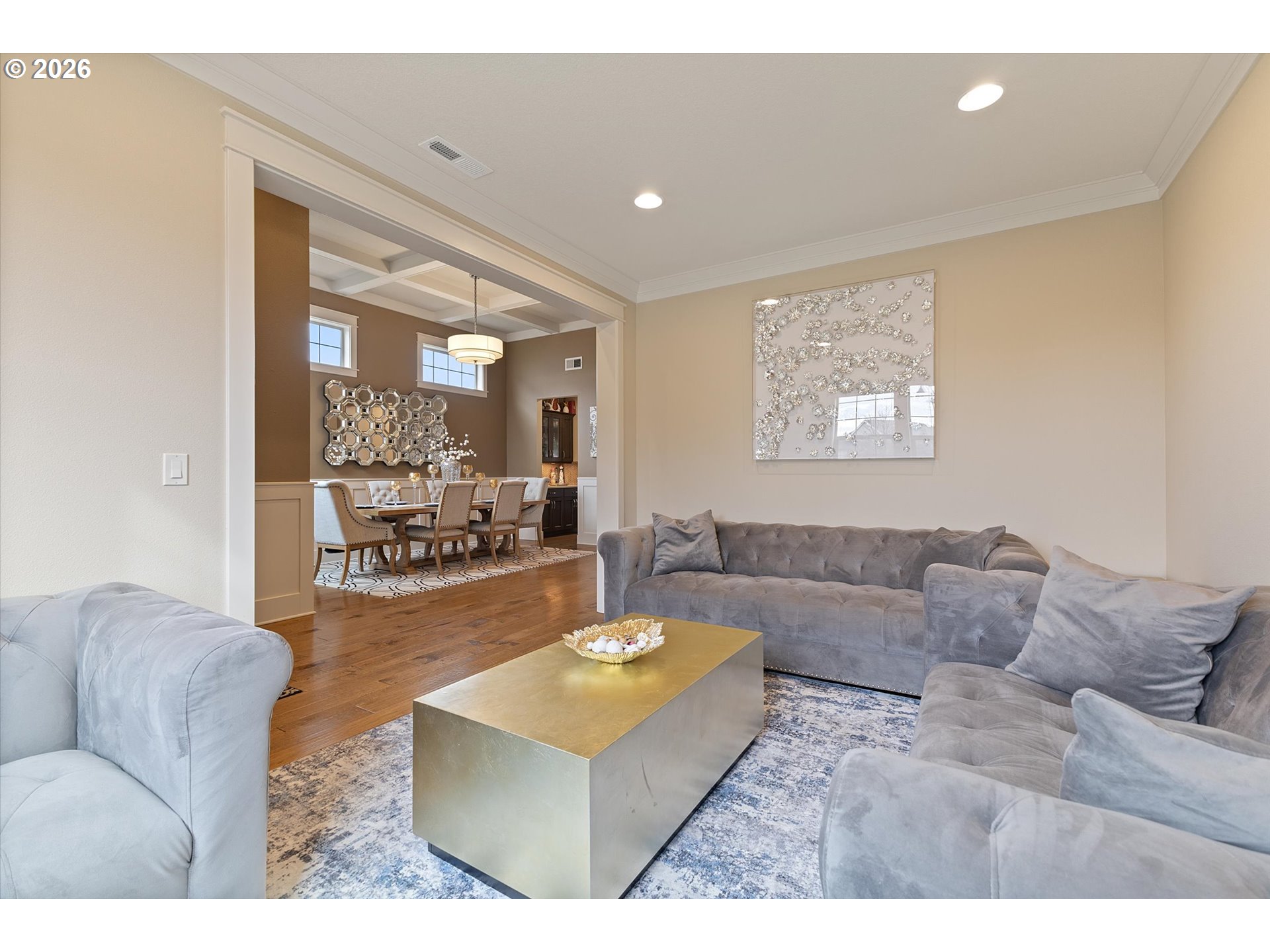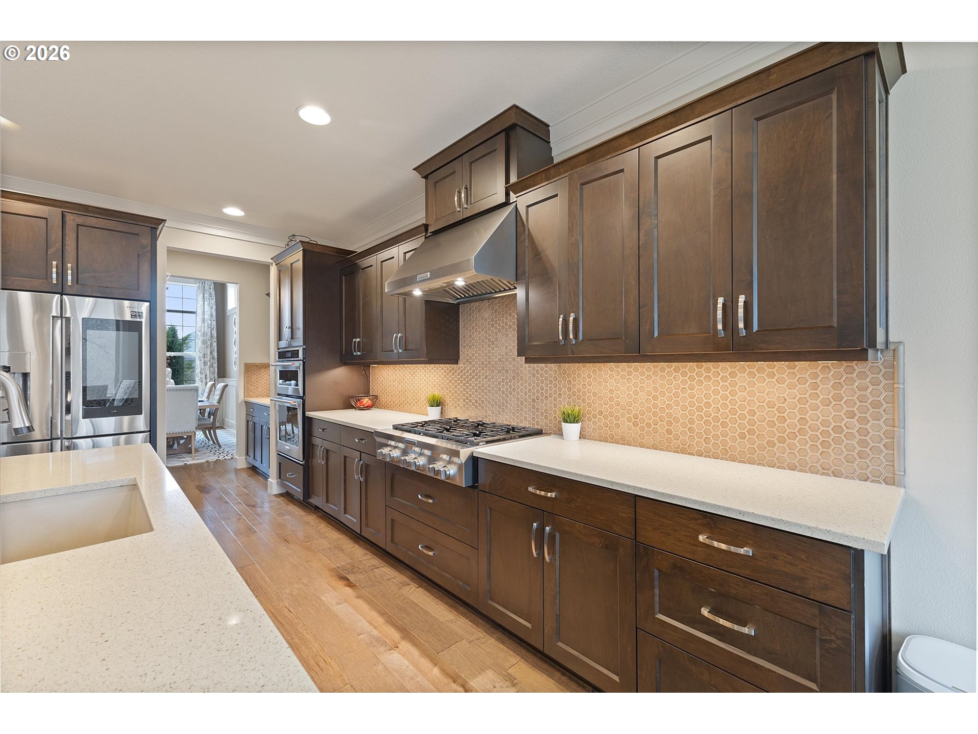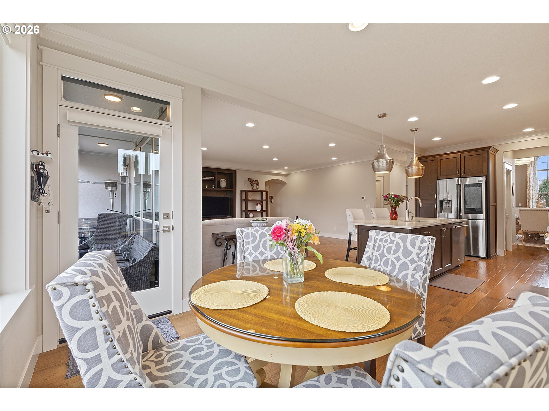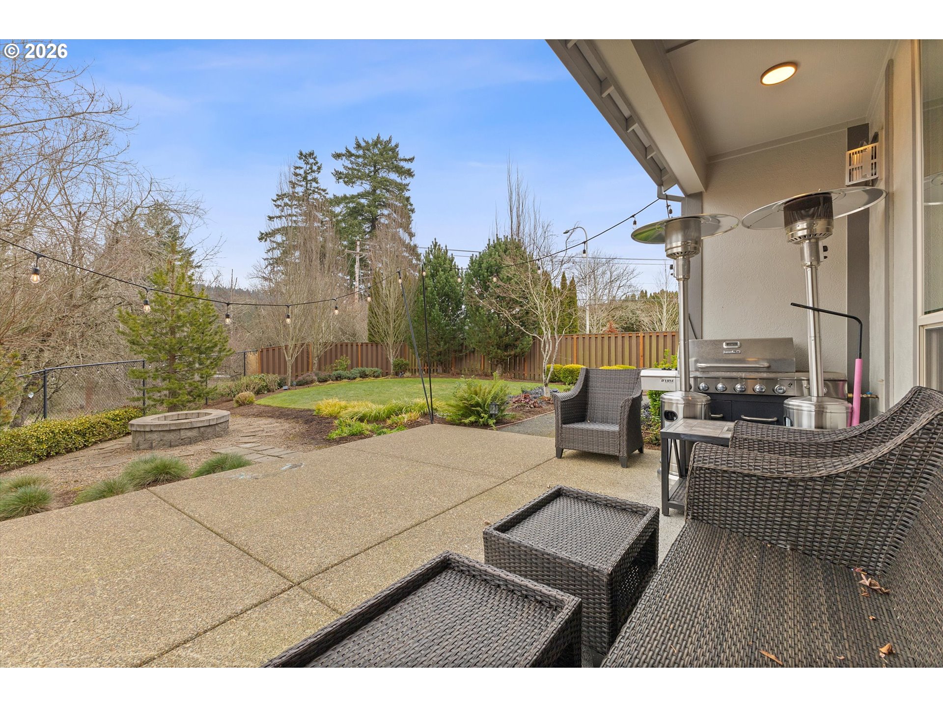 - This special home backs up to open space, with wooded views. There are upscale finishes throughout the thoughtfully laid out floor plan. The entry and dining room feature high box beam ceilings and extended engineered hardwood flooring, creating a warm, elegant first impression. The kitchen offers a nice layout with extensive tile and premium finishes, opening to a great room with a full-height tiled fireplace and custom built-ins.Bathrooms include extensive tile work, a freestanding soaking tub, and a frameless glass shower. The bonus room includes a wet bar, and additional custom built-ins are found in the hall and bonus areas. A private guest suite on the main level adds flexibility. Easy outdoor living with the patio, firepit, and tree-lined green space beyond the lawn. Energy Performance Score provided by Energy Trust of Oregon. Upgraded light fixtures in places.