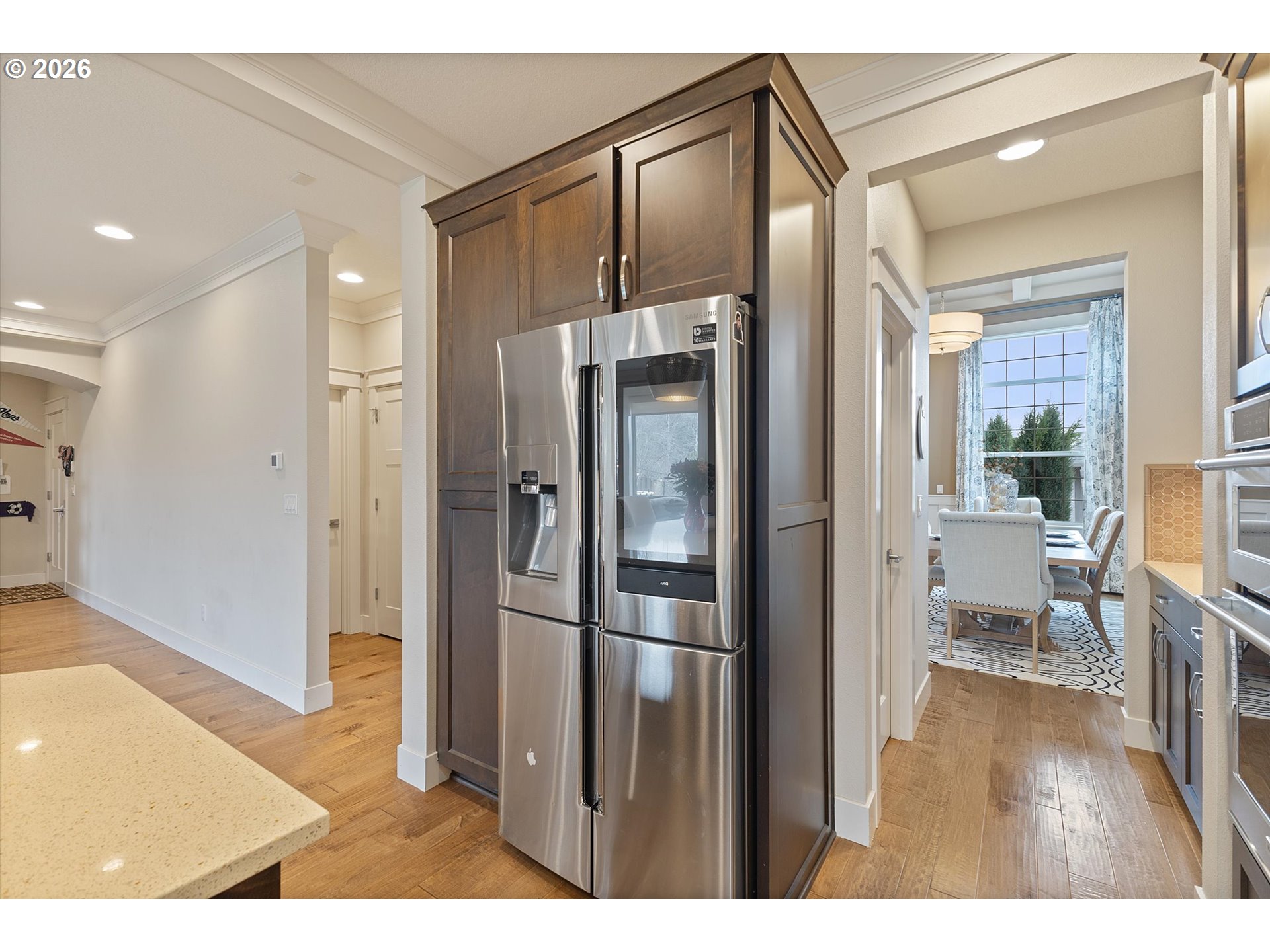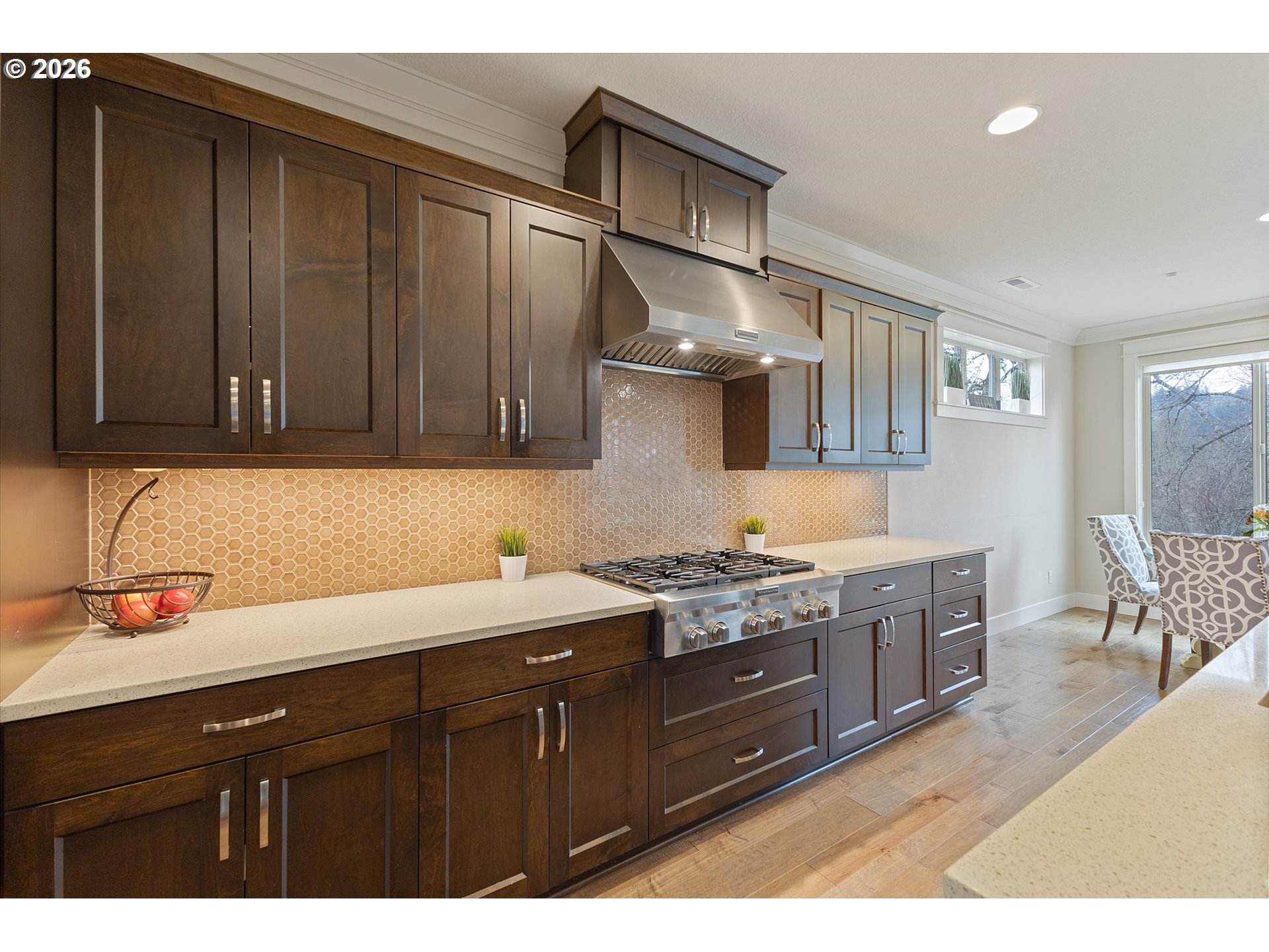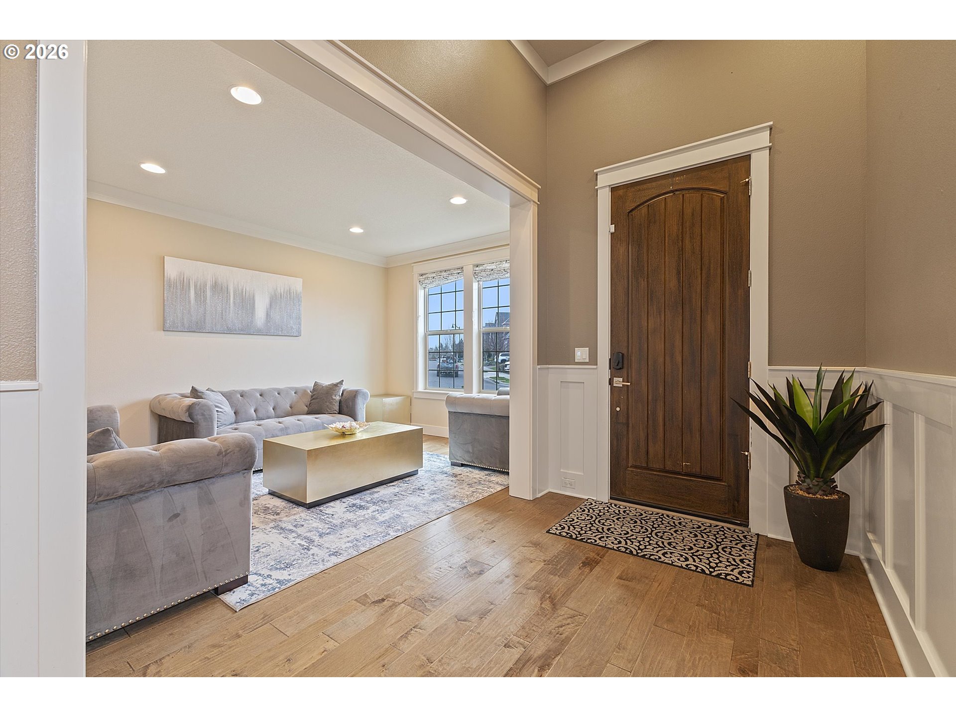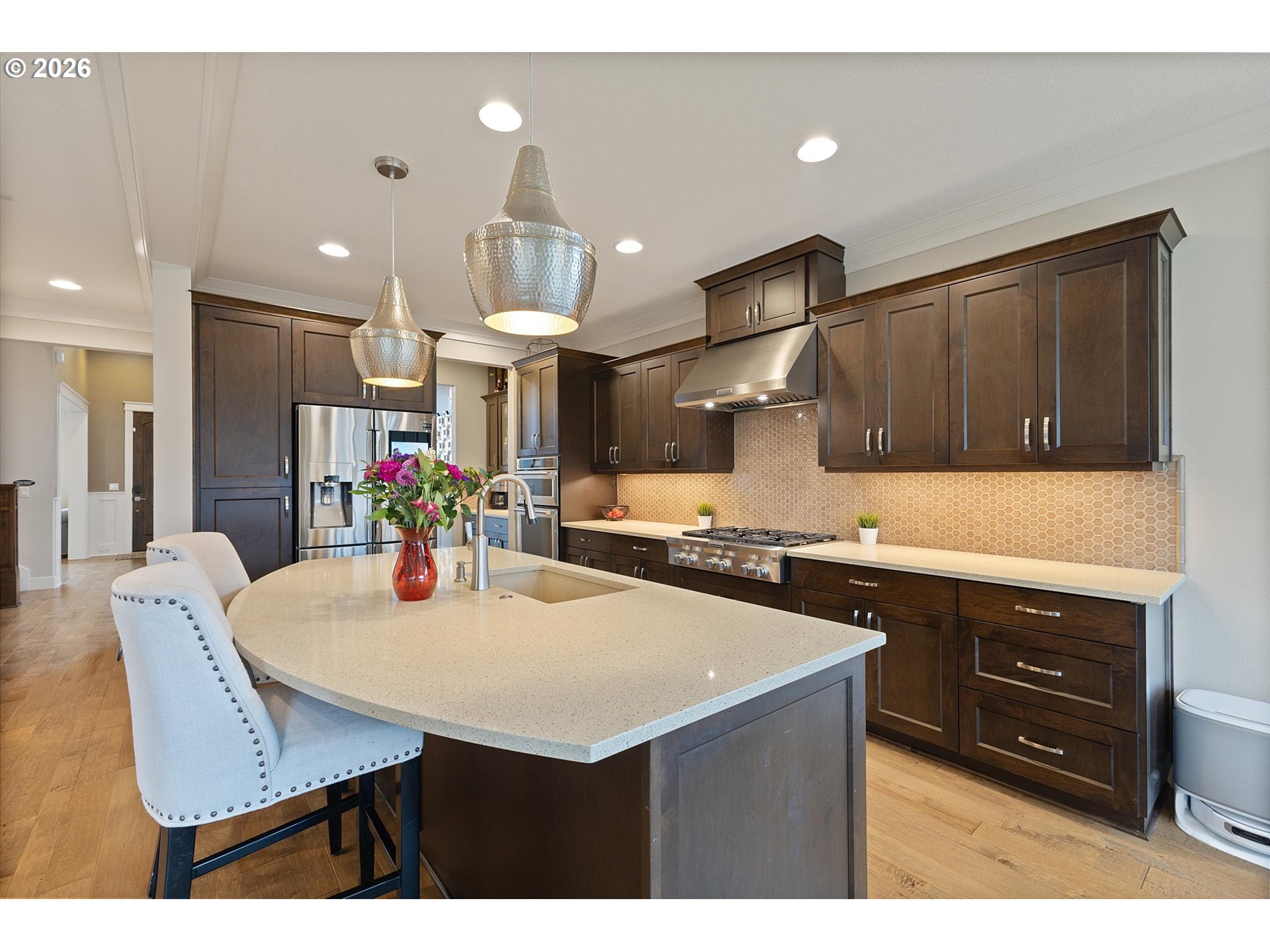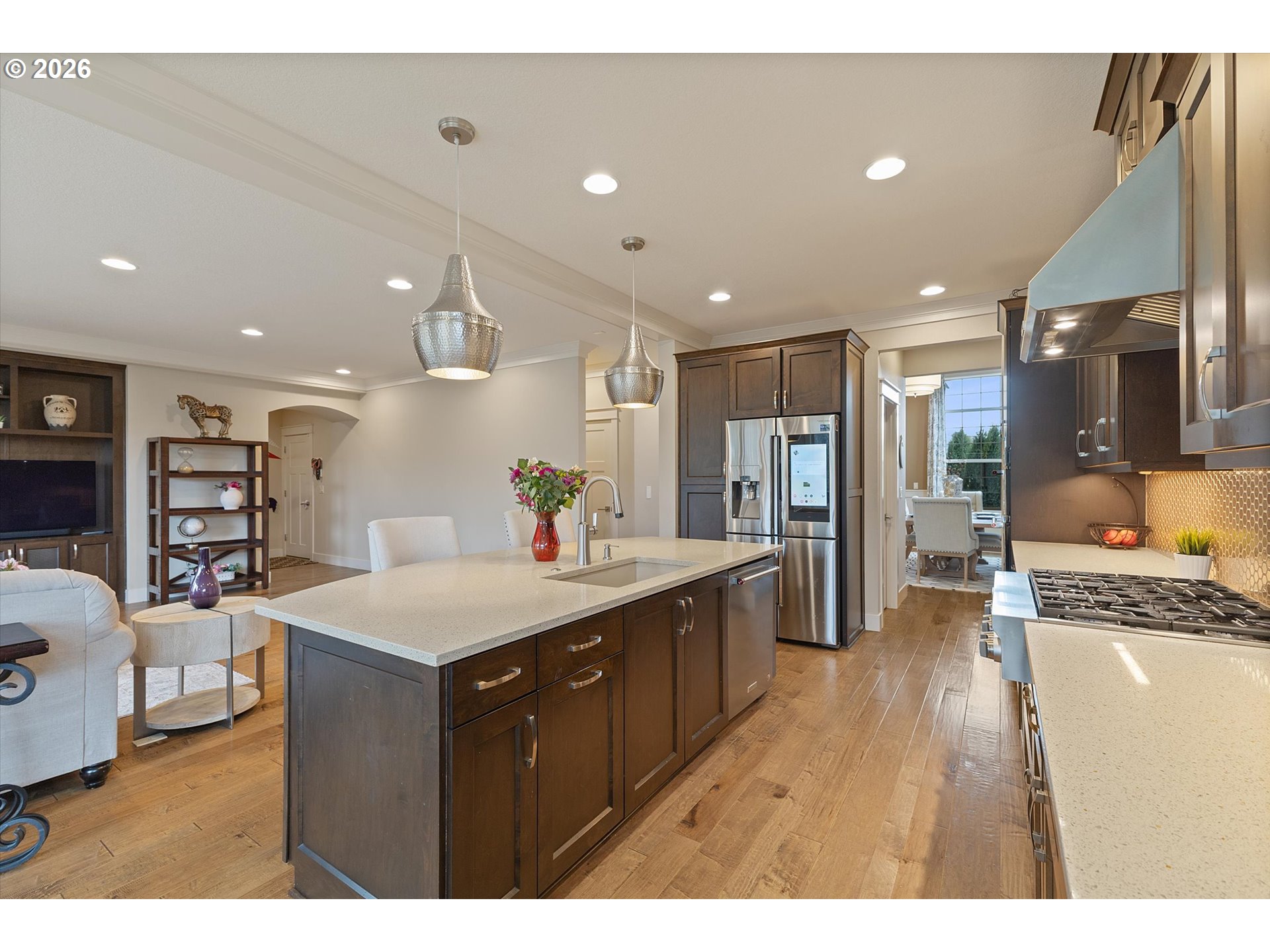 - This special home backs up to open space, with wooded views. There are upscale finishes throughout the thoughtfully laid out floor plan. The entry and dining room feature high box beam ceilings and extended engineered hardwood flooring, creating a warm, elegant first impression. The kitchen offers a nice layout with extensive tile and premium finishes, opening to a great room with a full-height tiled fireplace and custom built-ins.Bathrooms include extensive tile work, a freestanding soaking tub, and a frameless glass shower. The bonus room includes a wet bar, and additional custom built-ins are found in the hall and bonus areas. A private guest suite on the main level adds flexibility. Easy outdoor living with the patio, firepit, and tree-lined green space beyond the lawn. Energy Performance Score provided by Energy Trust of Oregon. Upgraded light fixtures in places.