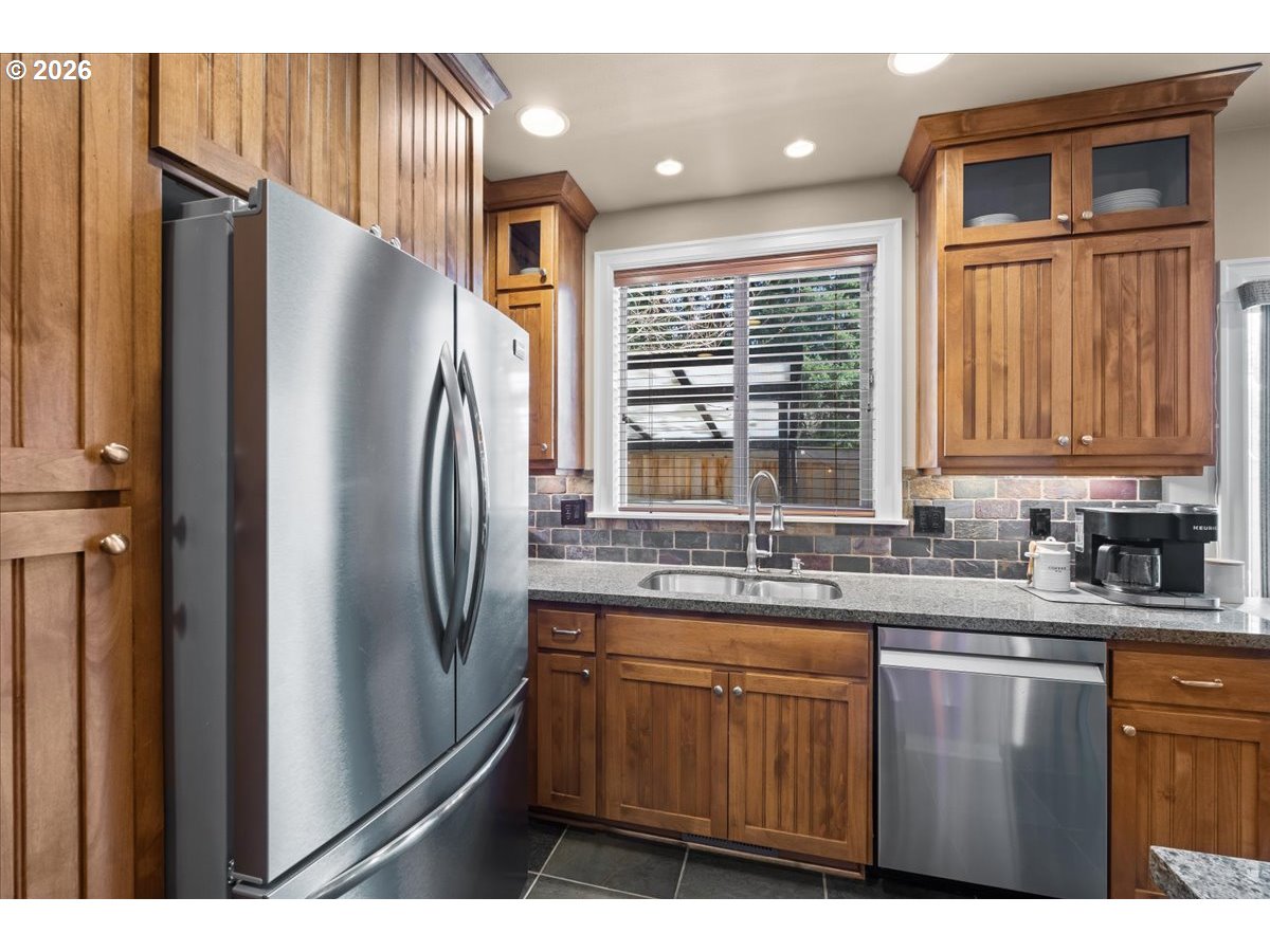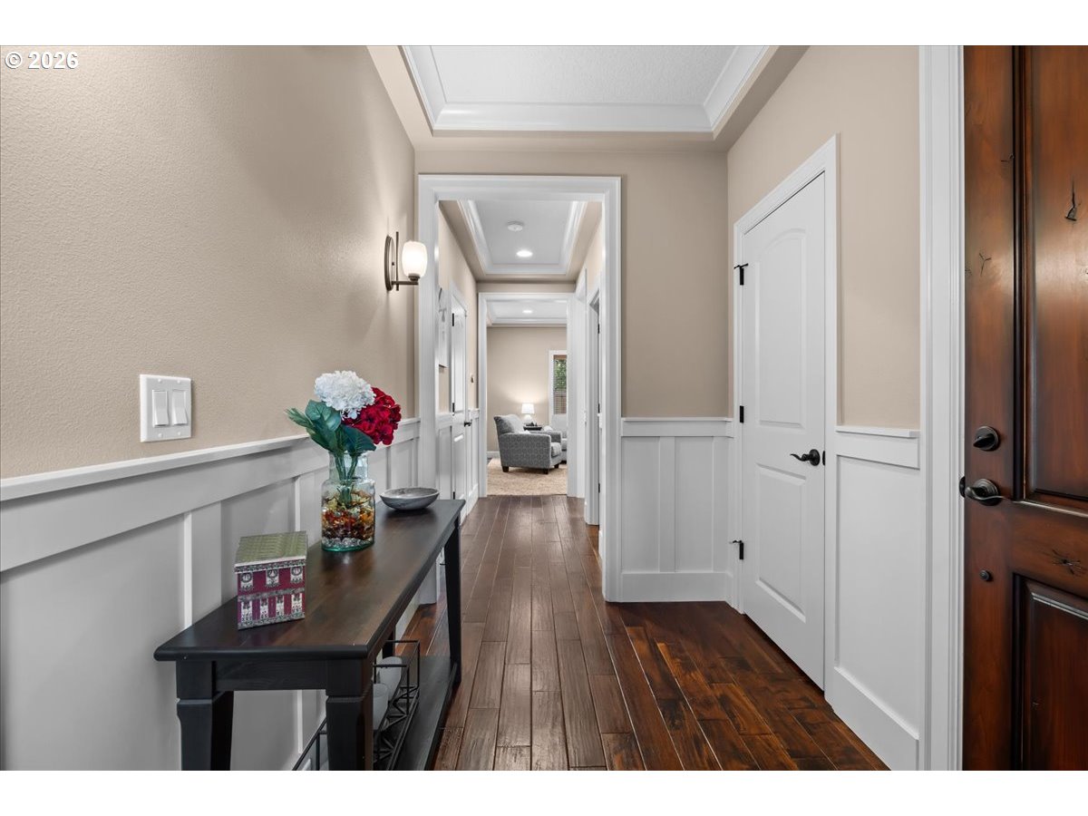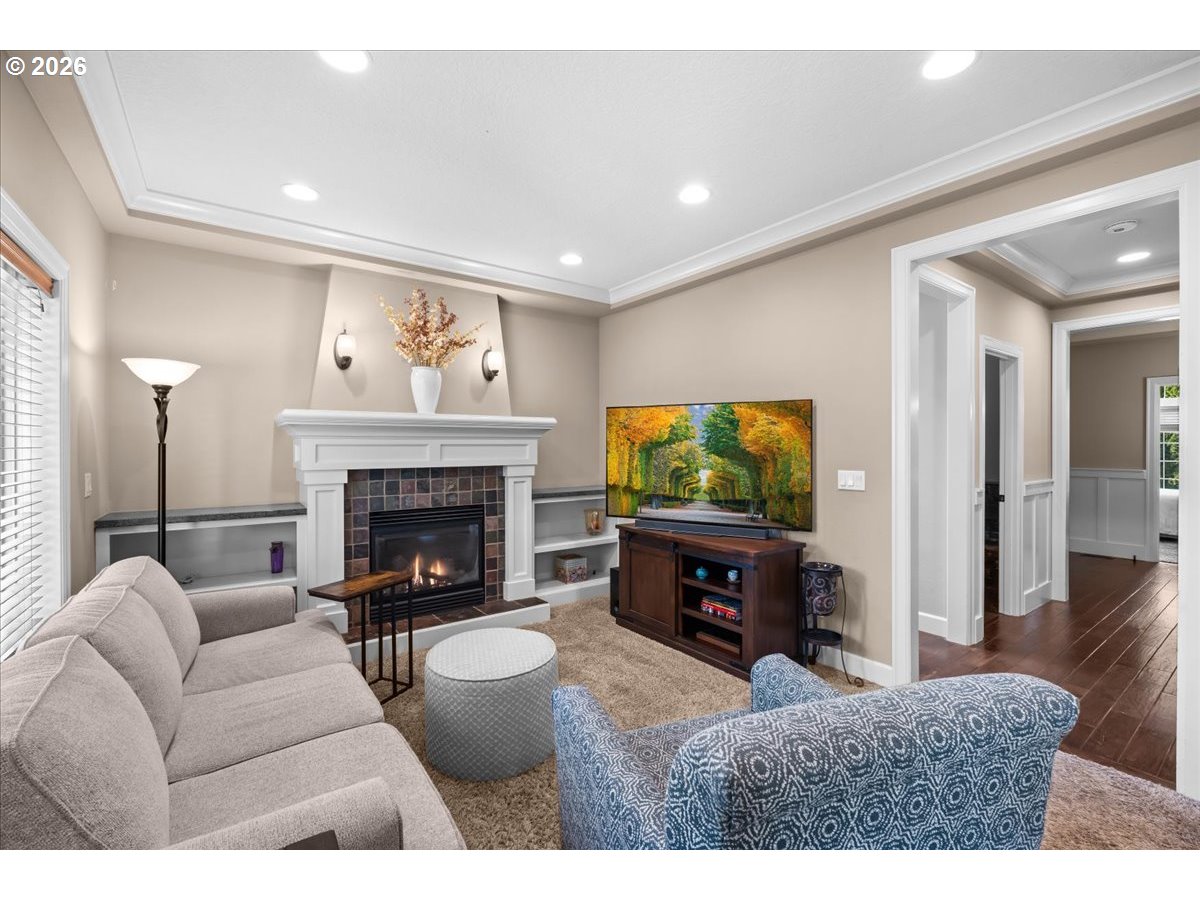 - Impeccable craftsmanship and refined finishes define this stunning home, ideally situated in a fantastic location on a quiet dead-end street with easy access to everything you need. Just minutes from Nike campus, intel campuses, shopping & restaurants. Step inside to discover real hardwood floors, wainscot, high ceilings accented by crown molding and recessed lighting, creating an elegant yet welcoming atmosphere throughout the home. The chef’s kitchen is beautifully appointed with gas cooking, stainless steel appliances, slab granite countertops, gorgeous cabinetry, and an inviting adjacent breakfast bar — perfect for both everyday living and entertaining. The living room offers warmth and comfort with custom built-ins surrounding a cozy gas fireplace, making it the heart of the home. Retreat to the relaxing spacious owner's suite featuring a spa-inspired bath with a walk-in shower, dual vanities, and a generous walk-in closet. In addition upstairs, you’ll find a spacious loft area that functions beautifully as a second living space, media room, sitting area, or home office. Two additional bedrooms and a full bathroom with double sinks provide comfort and convenience, while the upstairs laundry adds everyday ease and functionality. A main-level bedroom provides flexibility for guests, multi-generational living. Enjoy a private backyard setting — ideal for summer evenings, morning coffee, or quiet relaxation. With timeless finishes, thoughtful design, real hardwood flooring, and an exceptional location in desirable Cooper Mountain, this home truly offers the perfect blend of comfort, quality, and convenience.