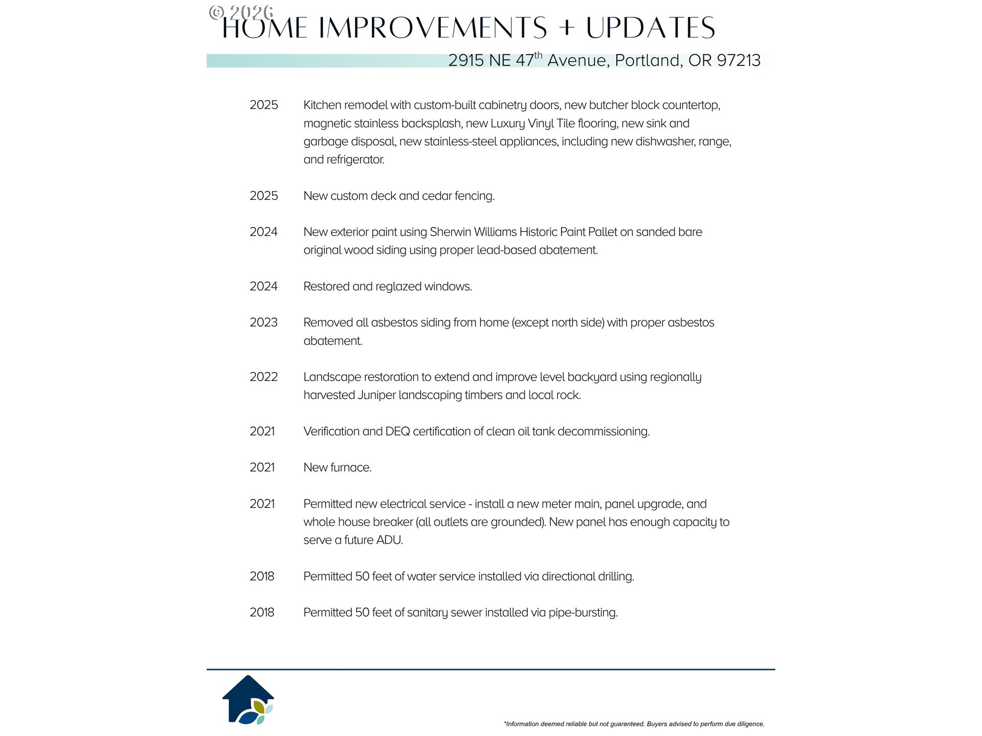 - Sweet Alameda-Beaumont bungalow with wonderful backyard and rare two-car garage. Ideal floorplan and location! One block north of prestigious Alameda Street and three blocks south of Fremont's fun cafes, shops and restaurants. The floorplan lives large and beautifully with a light-filled living room featuring wood-burning fireplace, open staircase, bay window and hardwoods. Large dining room with matching bay window, hardwoods and built-in bench seating. Down the hallway, find a coveted main floor bedroom with more hardwood floors and spacious full bathroom. Bright and charming remodeled kitchen with period charm, custom-built cabinet doors, butcher block countertops, magnetic stainless backsplash, and new stainless-steel appliances. Sweet kitchen nook with eating area and French doors that open to beautiful, private new deck and large fenced backyard. Ideal for outdoor entertaining, gardening and play. Upstairs you will find a large, bright and airy primary suite with attached bathroom, wood floors and walk-in closet. Adjacent is a second bedroom with wood floors and flexibility to be an ideal office as well. Unfinished basement offers flex-space to add your own equity, and currently provides great storage, utility and laundry. Fabulous detached two-car garage built in 1992 could be an amazing future ADU. Please ask to see the plans from one of Portland's premiere ADU builders that came with 2021 purchase (buyer due diligence of course). A truly special opportunity to create the versatility you need with so much intrinsic value beyond what you can see in the photos. Please see the impressive “Home Improvements + Updates” list, including new electrical service and panel, new exterior paint, etc. Epicenter to over 50+ fun restaurants, cafes, parks, and shopping. Please see carefully curated list. Walk score of 78 and Bike score of 93. [Home Energy Score = 4. HES Report at https://rpt.greenbuildingregistry.com/hes/OR10246112]