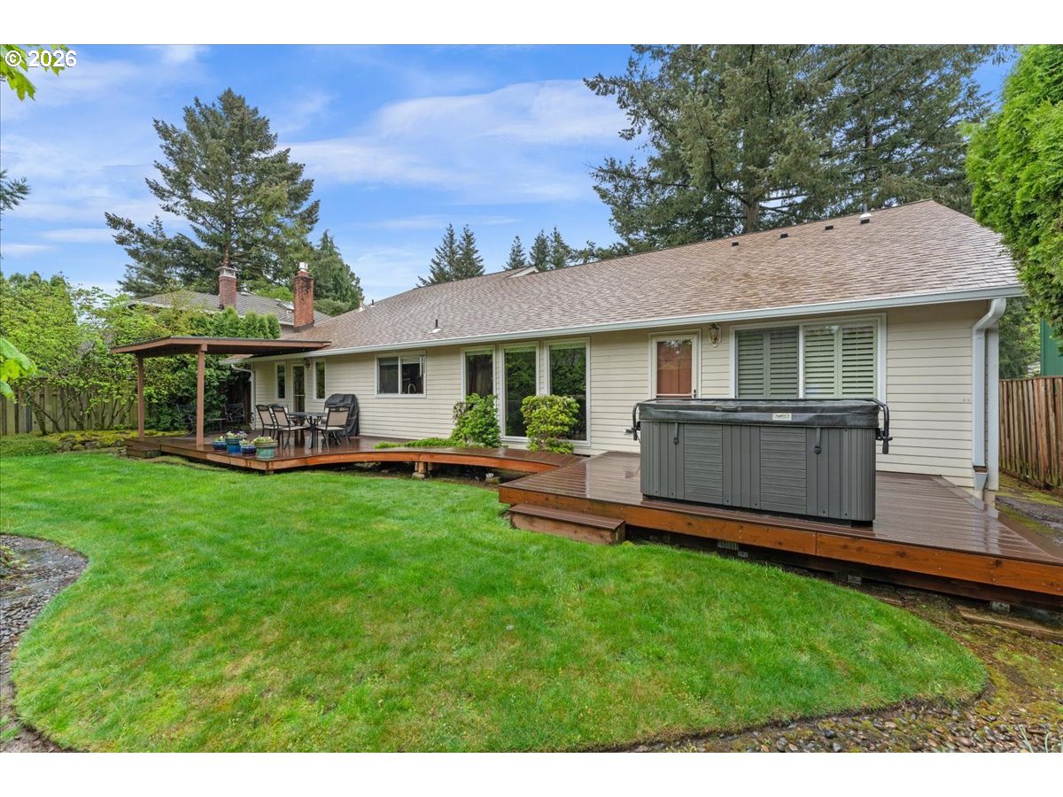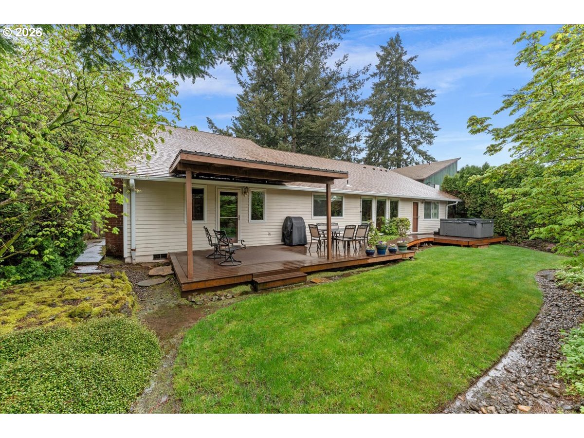- Charming One-Level Home with Bonus Loft, Updated Kitchen & Private Backyard Retreat. This beautifully maintained home in the coveted Sandstone neighborhood offers the ease of one-level living plus a versatile bonus loft perfect for a home office, guest space, or creative studio. Light-filled rooms create a warm atmosphere throughout the home. The kitchen was fully updated in August 2024 and features stylish ceramic tile flooring, quartz countertops, custom beechwood cabinetry, a tile backsplash, a sleek new cooktop, and a new high-end Bosch dishwasher ideal for both everyday living and entertaining. Gorgeous Brazilian teak engineered hardwoods flow seamlessly throughout the front half of the house. Sit by the cozy gas fireplace in the family room and watch your favorite series on the 57-inch Smart TV (included in the sale). The family room boasts high vaulted ceilings. The bright sunlit living room with three floor to ceiling windows offers a place where you can visit with friends or simply read in quiet. Recent exterior upgrades include a new roof (April 2026) and brand new gutters (October 2025). Step outside to a serene, private backyard with low-maintenance landscaping and a newer Trex deck and patio cover. Unwind in the spa/hot tub (included in the sale). A laundry room provides easy access to a large attached garage that includes built-in storage and a dedicated work surface for projects or hobbies. Additional storage is available throughout the home for ultimate convenience. This home blends comfort, functionality, and natural beauty. Don’t miss your opportunity to make it yours!