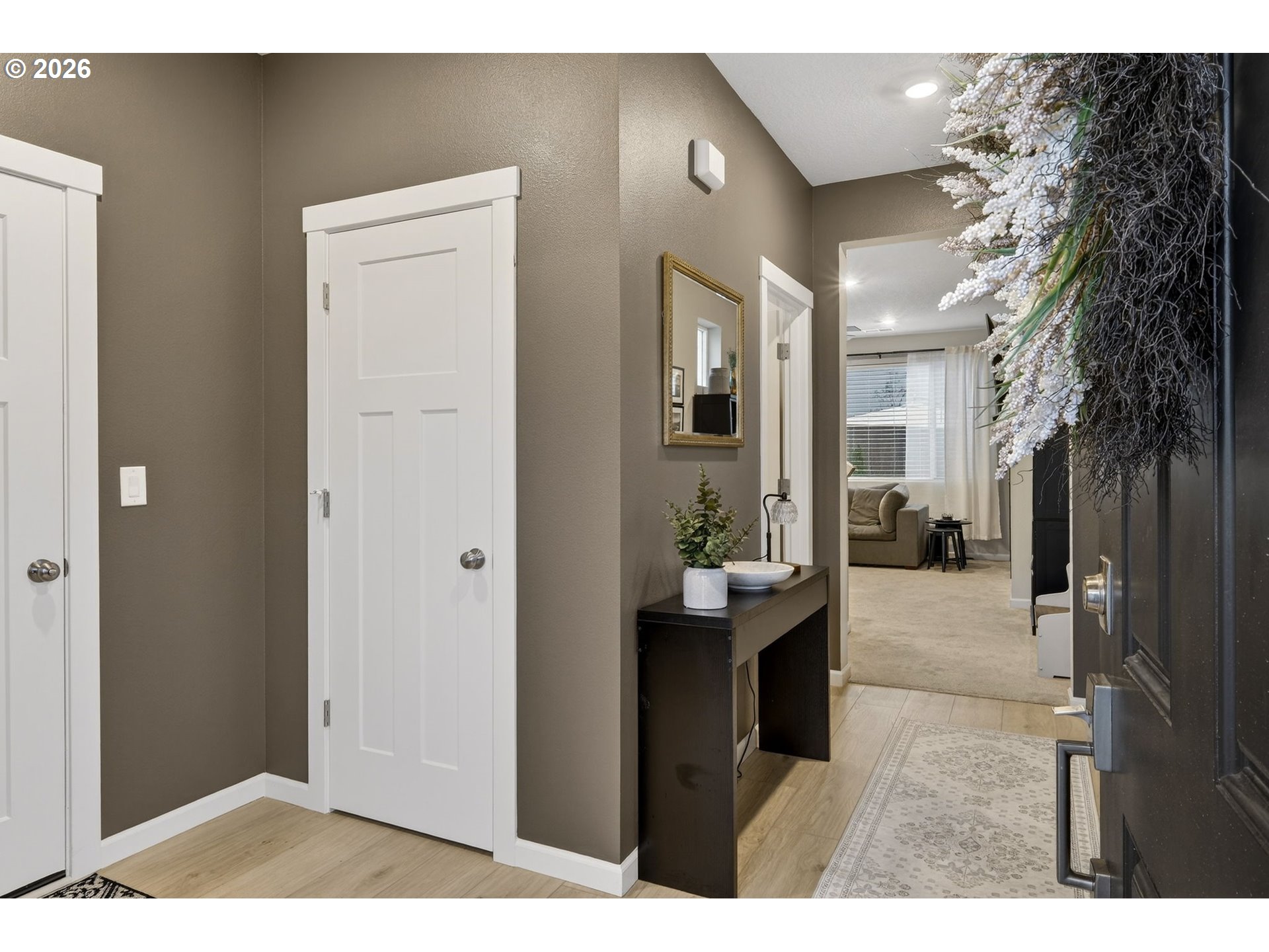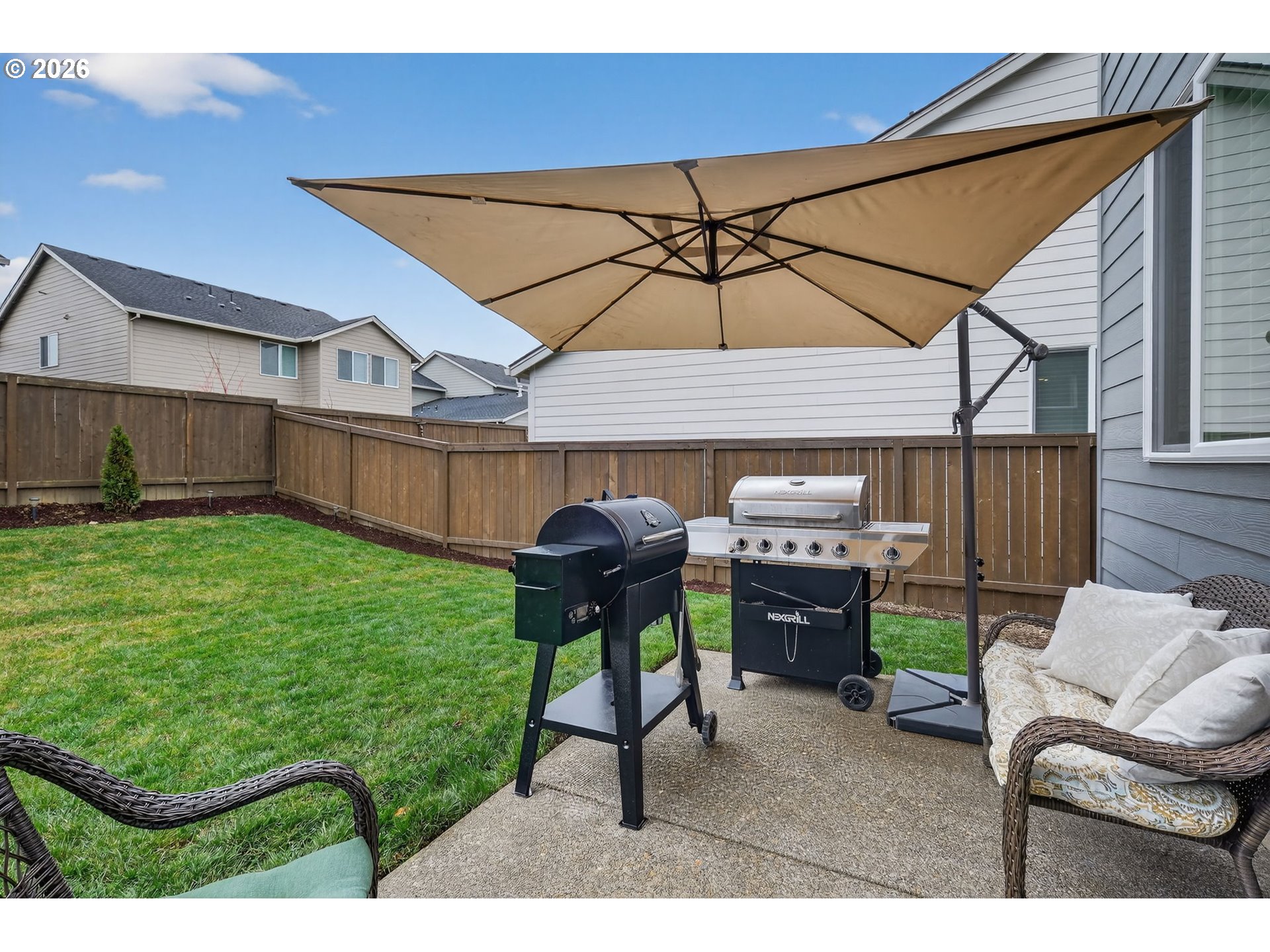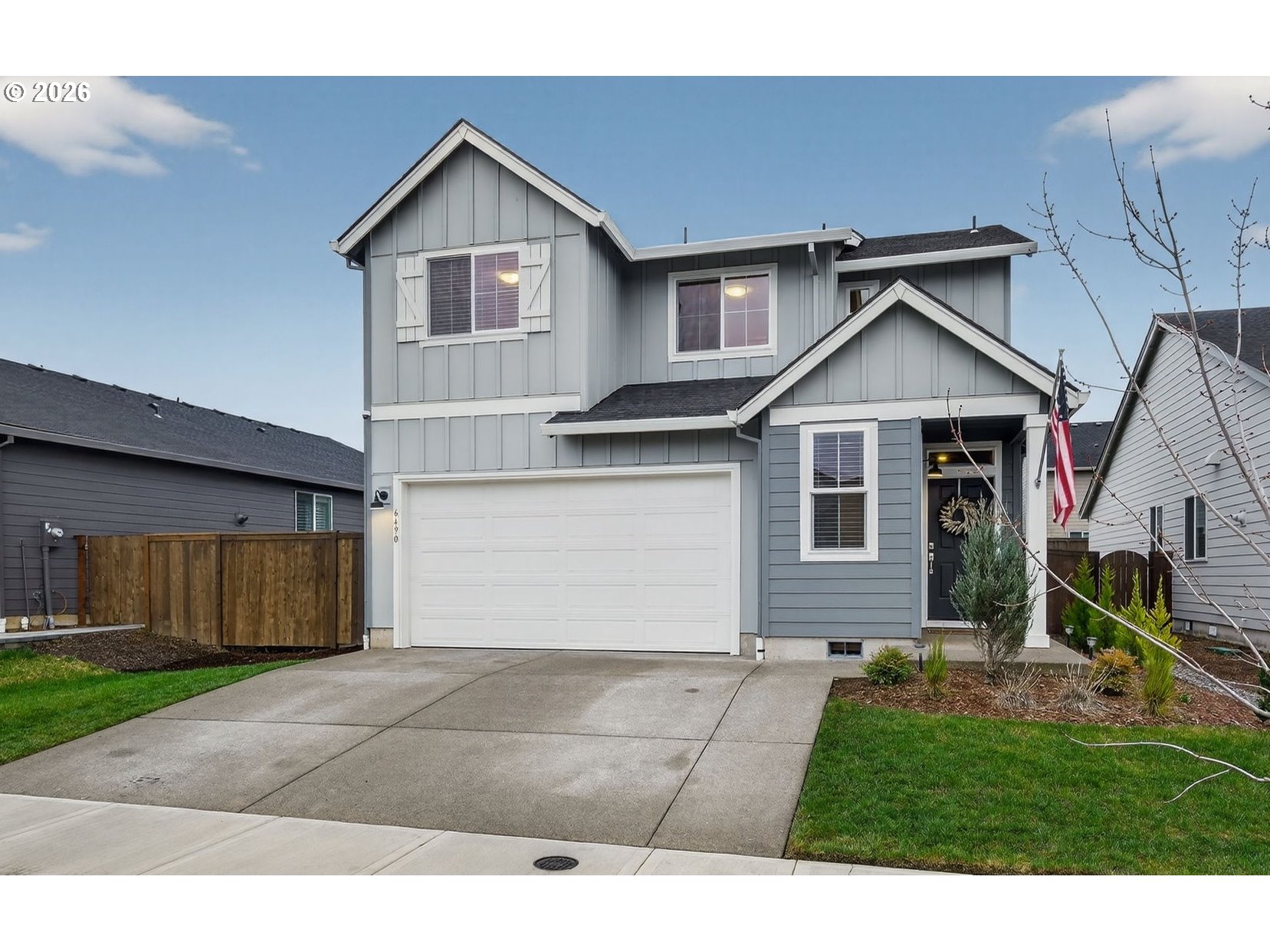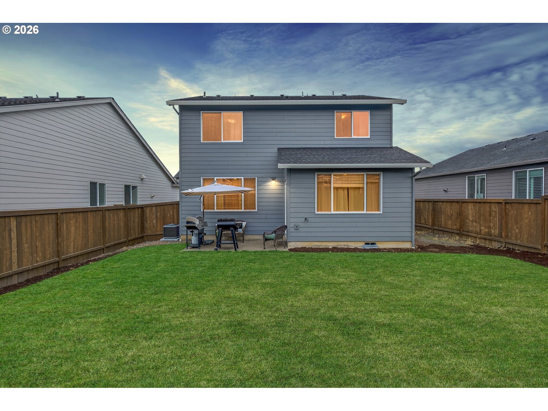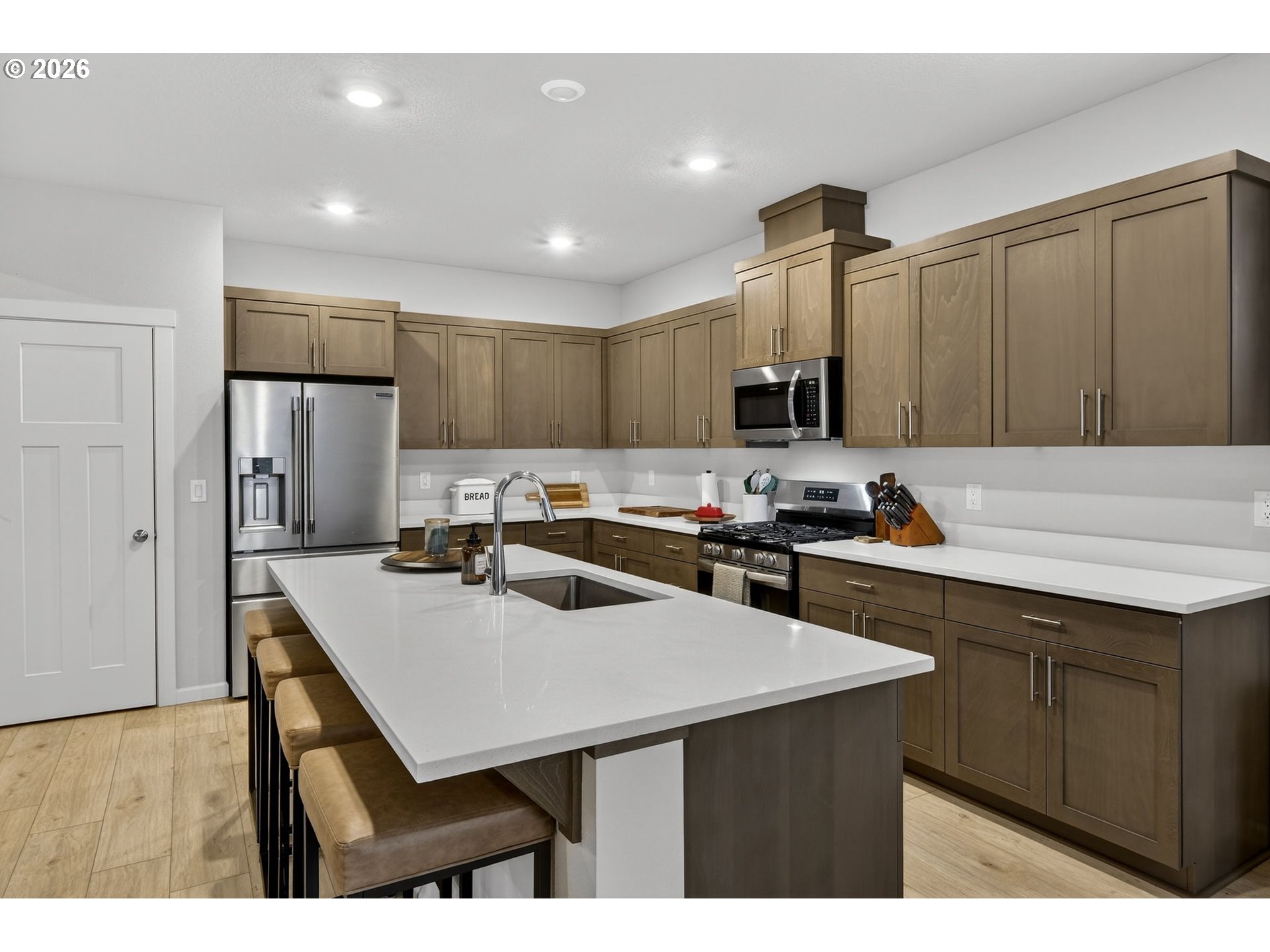 - Built in 2025, this beautifully maintained 1,876 square foot two-story home in Gresham offers 4 bedrooms and 2.5 bathrooms with a warm, welcoming layout that feels even more spacious in person. The open-concept main level is filled with natural light and features luxury vinyl plank flooring, recessed lighting, and a comfortable living room anchored by a cozy gas fireplace with built-in shelving and plenty of room for oversized furniture. The kitchen is designed for gathering, complete with expansive quartz countertops, a large island with generous seating, stainless steel appliances including a gas range and built-in microwave, a walk-in pantry, and rich wood cabinetry that adds warmth and character. The dining area flows effortlessly to the backyard patio, creating an easy indoor-outdoor connection perfect for everyday living and entertaining. Upstairs, the primary suite offers a peaceful retreat with a spacious layout, dual-sink vanity with quartz counters, walk-in shower with glass enclosure, and ample storage, while three additional bedrooms provide flexible space for guests, a home office, or hobbies. Additional highlights include a dedicated laundry room with washer and dryer, high-efficiency 95%+ forced air furnace, tankless gas water heater, central air conditioning, double-pane windows, and an attached 2-car garage with abundant storage space. The fully fenced backyard features a patio and lawn area ready for summer evenings, barbecues, and room to play. This home combines modern construction with comfort and space to truly settle in—schedule your showing today!