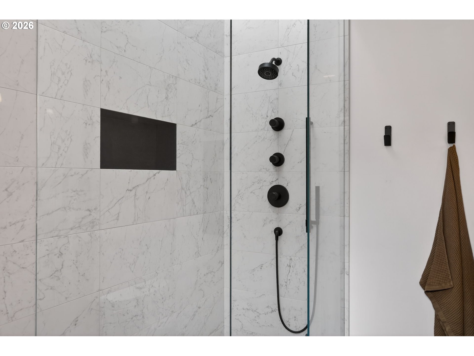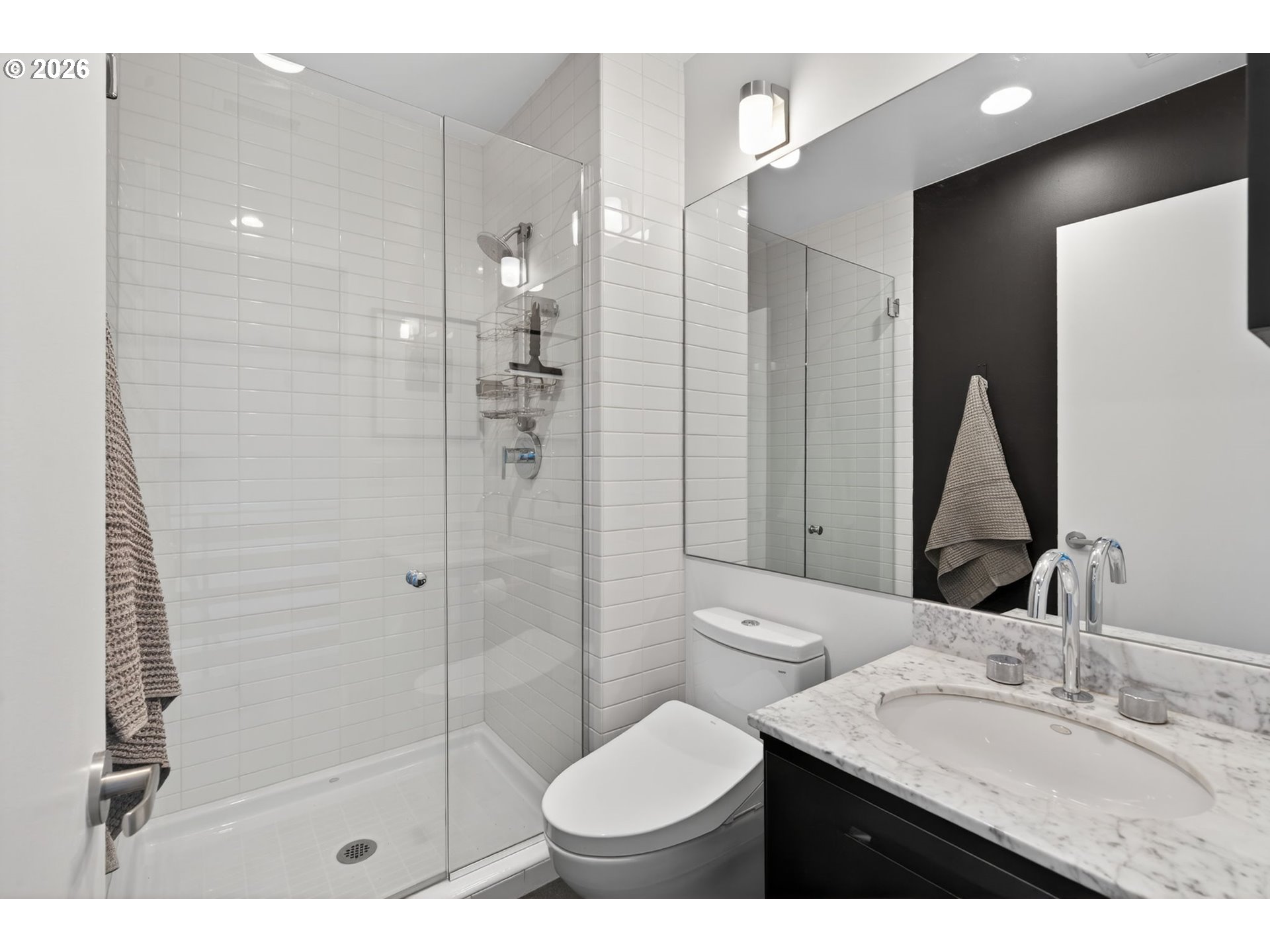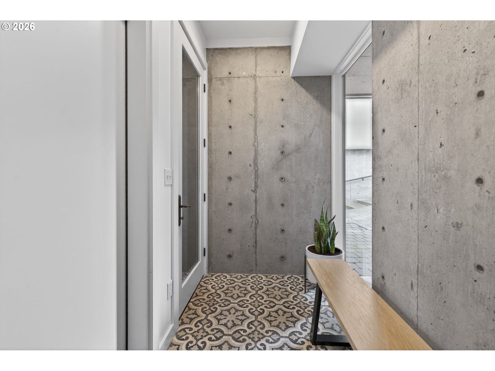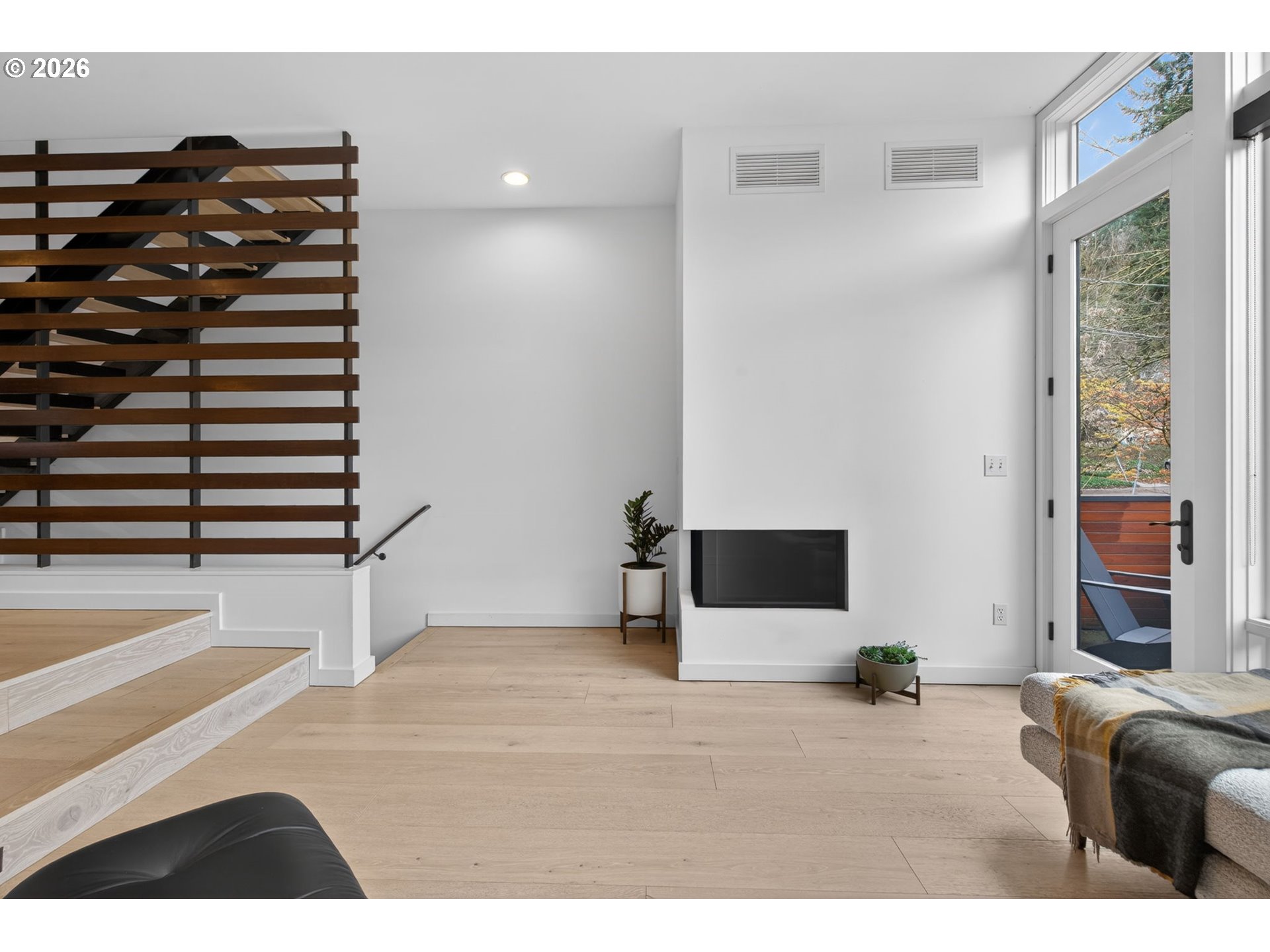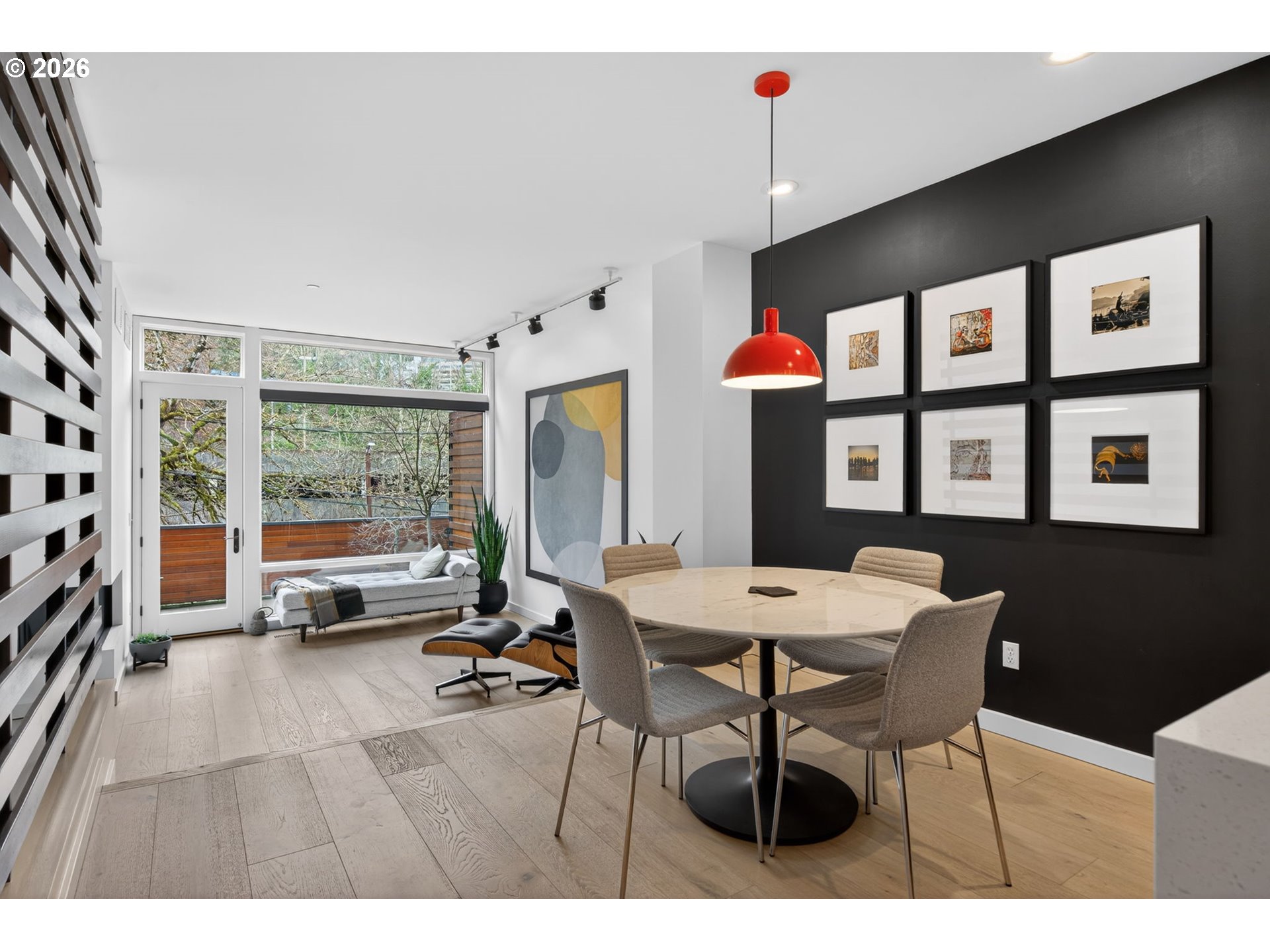 - The gem of the community and one-of-a-kind — the only completely remodeled and upgraded unit with high-end finishes throughout each level. Welcome to this tucked-away boutique condo building just a few minutes from downtown, yet offering a sense of true privacy. The community offers a modern look with stylish interiors. This condo lives like a true home with an open floor plan on the main living level and wide plank oak flooring with walls of windows and three directional light. The living room offers a custom gas fireplace, a wall of windows to a very usable deck space great for outdoor dining or lounging. The kitchen has been expanded with solid surface waterfall countertop, large eating peninsula, high-end appliances, and ample storage. Great space for a true dining table open to the kitchen as well. Slatted wood accent wall leads to the upstairs where you'll find a true owners suite with vaulted ceilings, full bathroom with skylight, and high-end finishes. Ample-sized second bedroom can function well as a den/office. Lower level entry with access to oversized tandem garage great for storing toys, outdoor gear, or vehicle. Literally minutes to downtown core, access to the freeway, and shopping. Just blocks to restaurants, PSU, Farmers Market, MAX train, and parks.