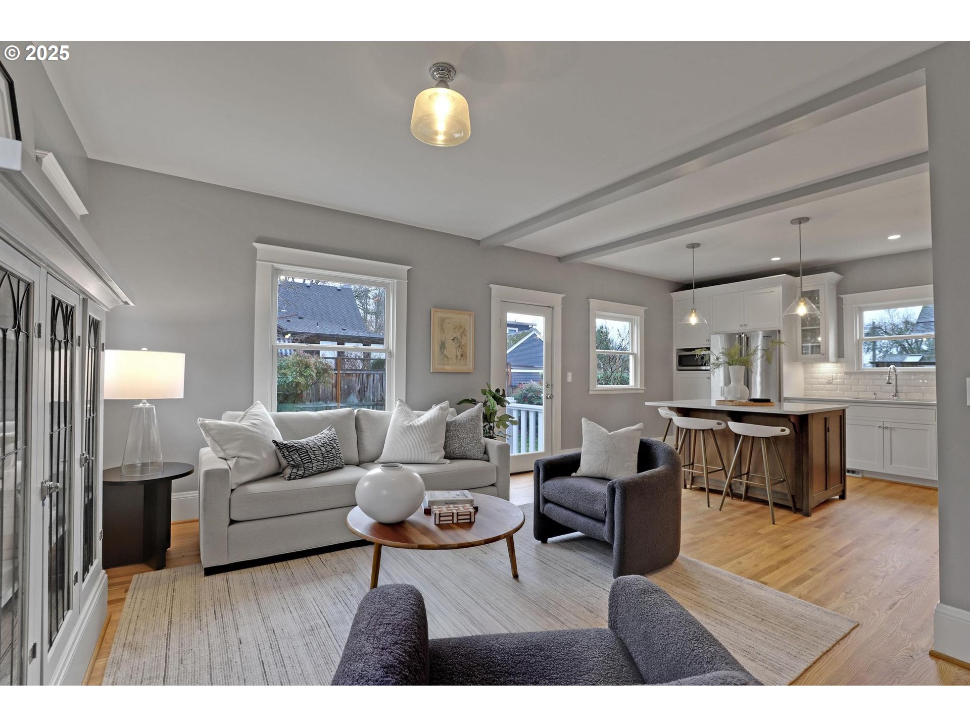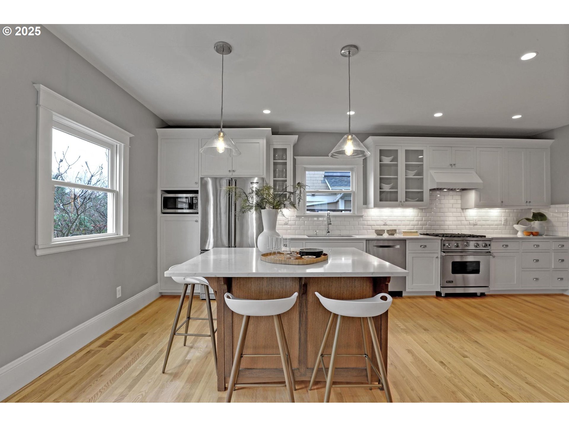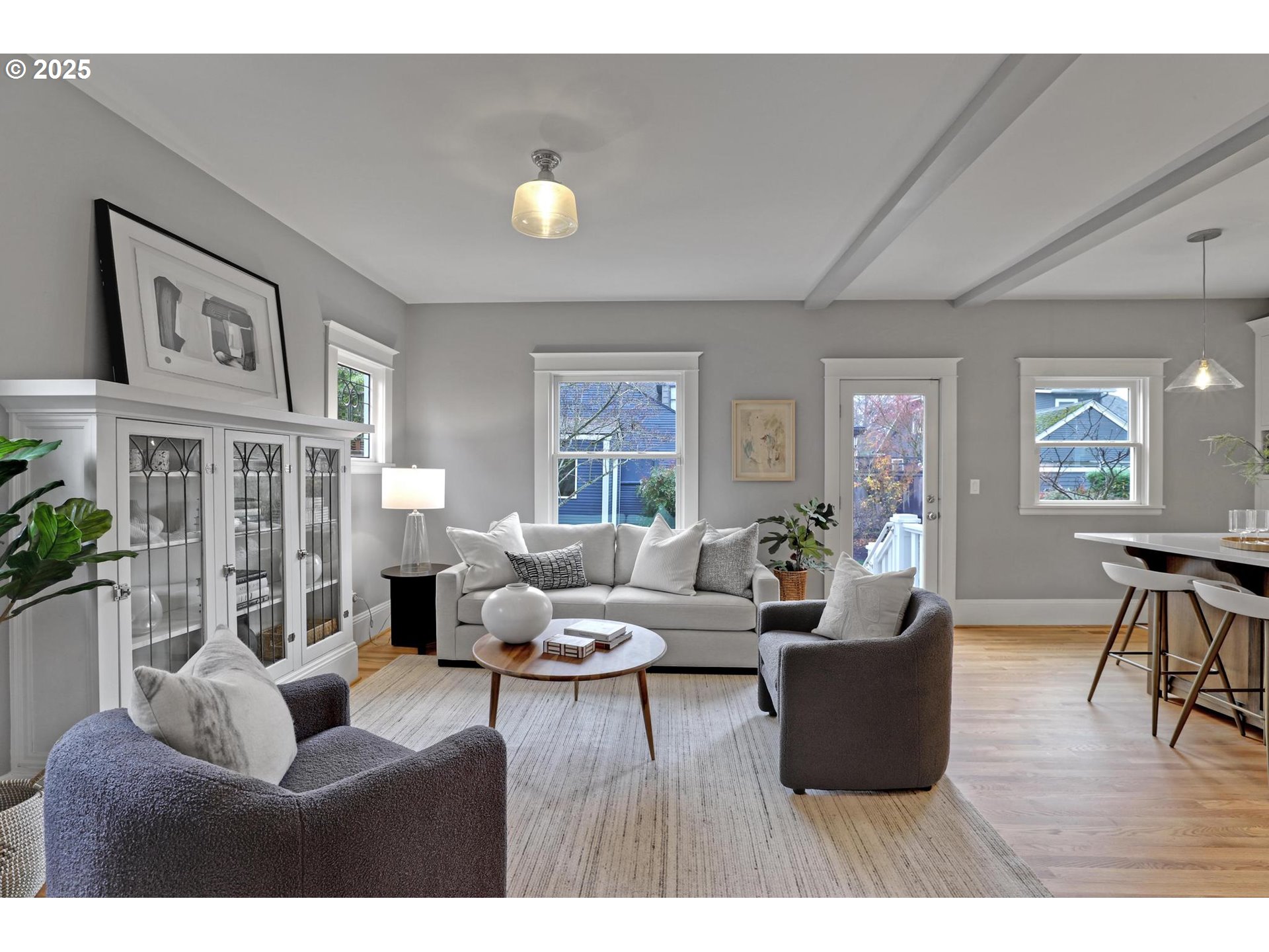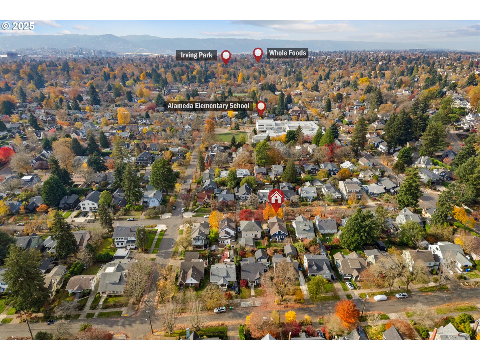 - Nestled in the heart of Portland’s sought-after Alameda neighborhood, this beautifully remodeled home blends timeless charm with modern comfort. This gorgeous light-filled home sits graciously above the ideal, quiet and tree-lined street. Fabulous covered front porch to enjoy the view. With brand new exterior paint, the curb appeal is welcoming and wonderful. The entryway opens to newly refinished hardwoods on the entire main floor, and an elegant formal living room with chic wood-burning fireplace and boxed beamed ceilings. The formal dining room features charming original leaded-glass built-ins, a large bay window with bench seating and more boxed beam ceilings. Big picture windows and natural light everywhere! Enter the big, beautiful and open kitchen with seamless connection to most fabulous great room. Perfect area for everyday family togetherness and entertaining large groups. The heart of this gourmet kitchen is a large cook’s island with quartz countertops, custom cabinetry and seating for four. Stainless-steel appliances include Viking professional gas range and ZEPH’R range hood, Viking refrigerator and a Bosch dishwasher. The great room features the original charming leaded glass windows and built-ins. Easy outdoor access from the kitchen and great room into a large, fully fenced backyard, ideal for barbecues and watching kids play while you cook. Lovely half bath off the hallway for easy circular flow of entire main floor. Upstairs there are three generous bedrooms and two bathrooms, including a stunning vaulted primary suite with walk-in closet and private bath. The entire ensuite lives large and beautifully! The finished lower level adds flexibility for guests with a fourth bedroom, full bath, ideal office space, laundry room, along with a family room everyone will love. Please see impressive “Home Improvements & Highlights” list and carefully curated “What’s Nearby” list for all the fun restaurants, cafes, parks and shopping. Open 12/6 & 12/7, 1-3 pm. [Home Energy Score = 3. HES Report at https://rpt.greenbuildingregistry.com/hes/OR10243040]