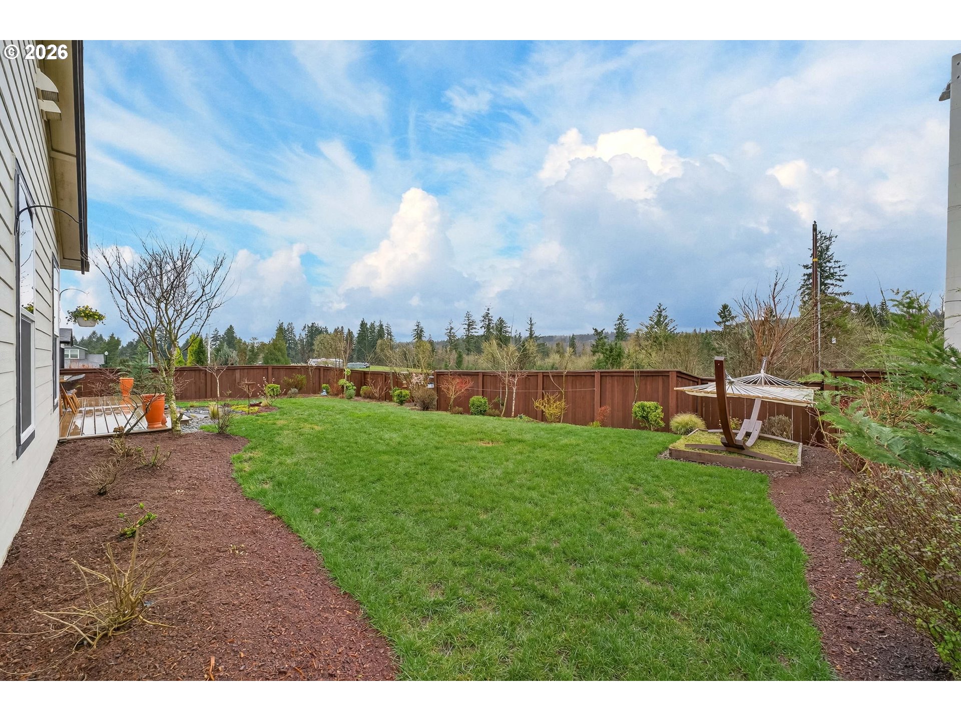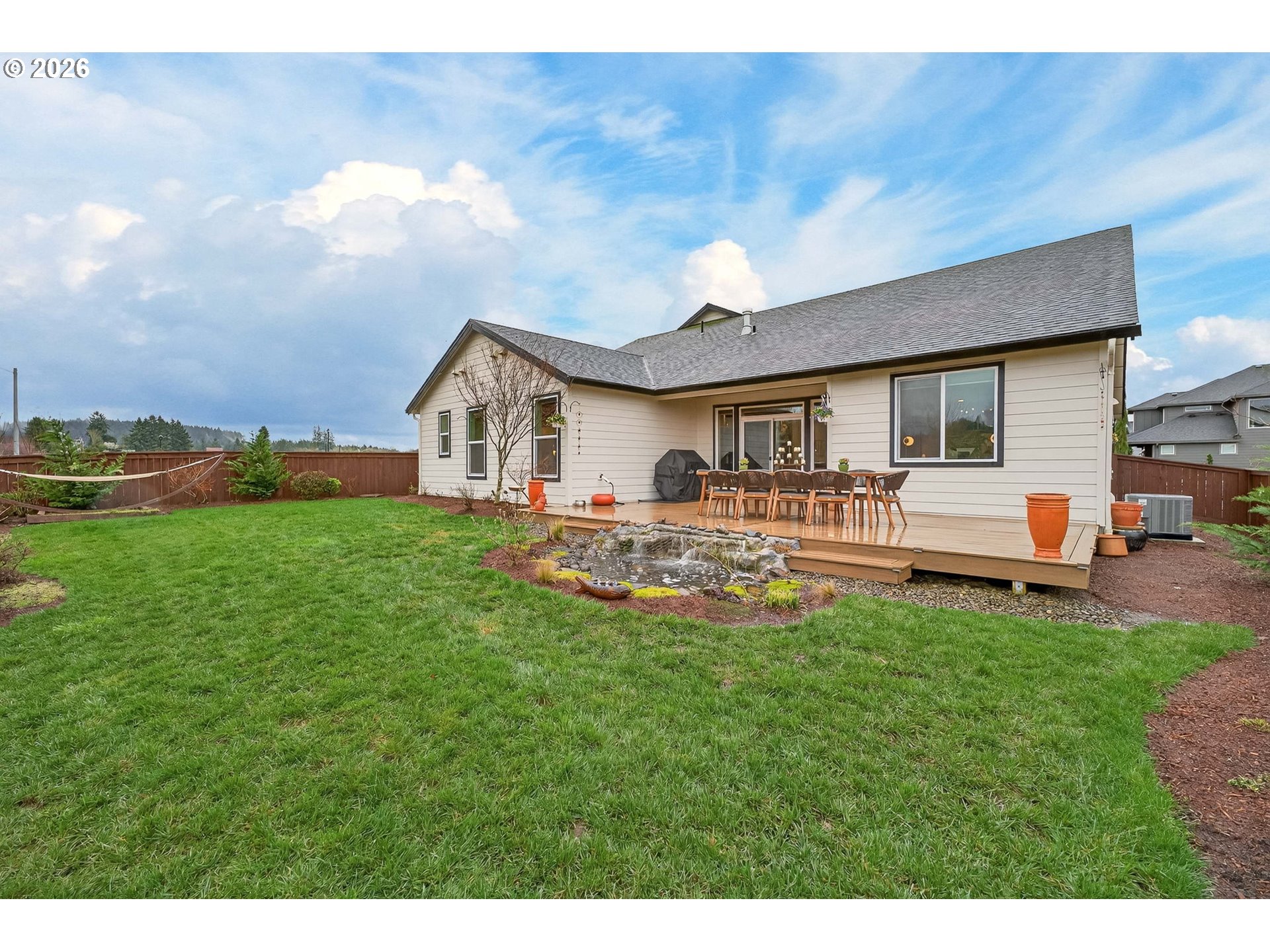 - Deck, Fenced, Porch, Raised Beds, Sprinkler, Water Feature, Yard
