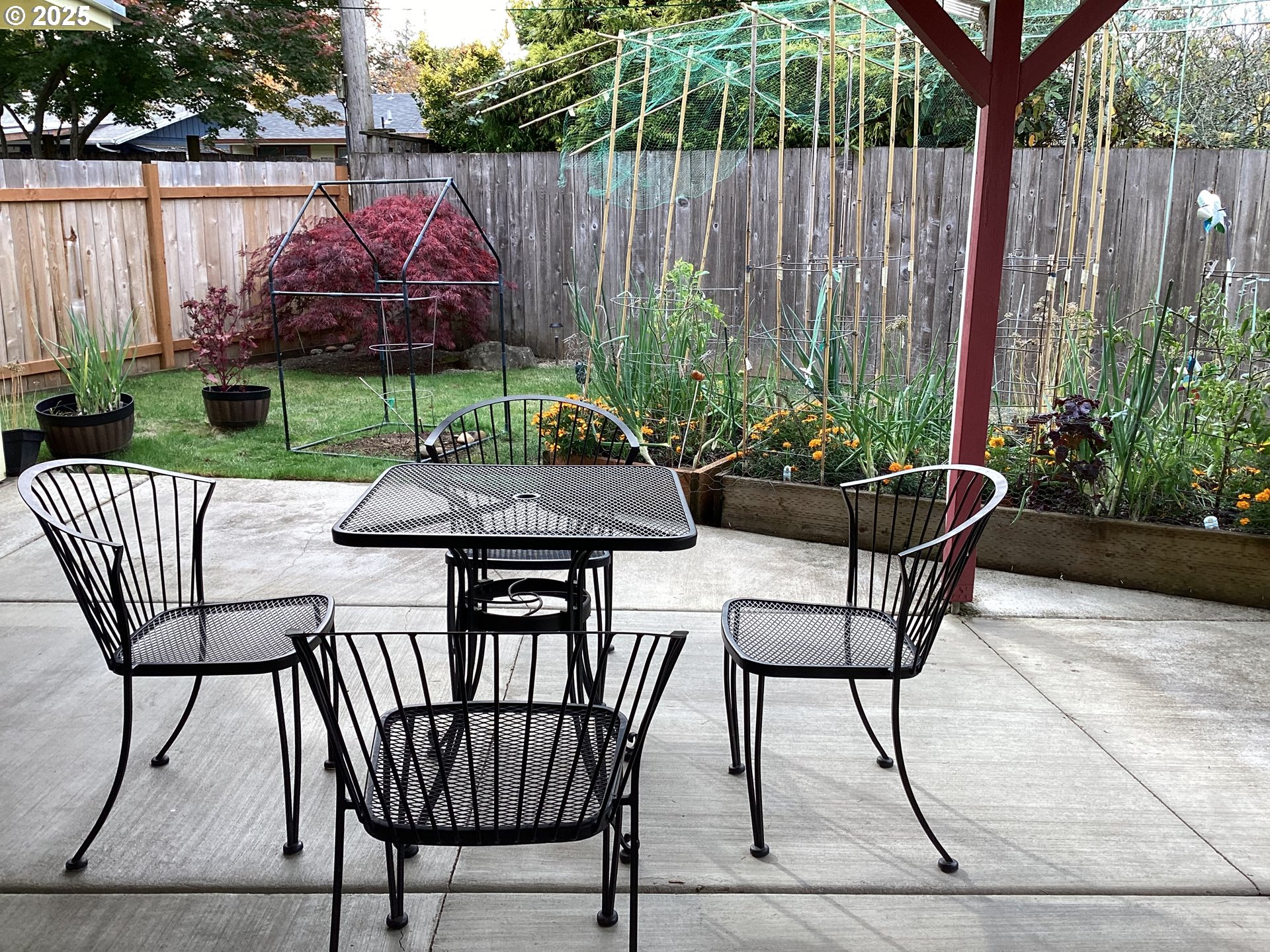 - Covered Patio, Fenced, Garden, Raised Beds, Security Lights, Storm Door(s), Tool Shed, Yard