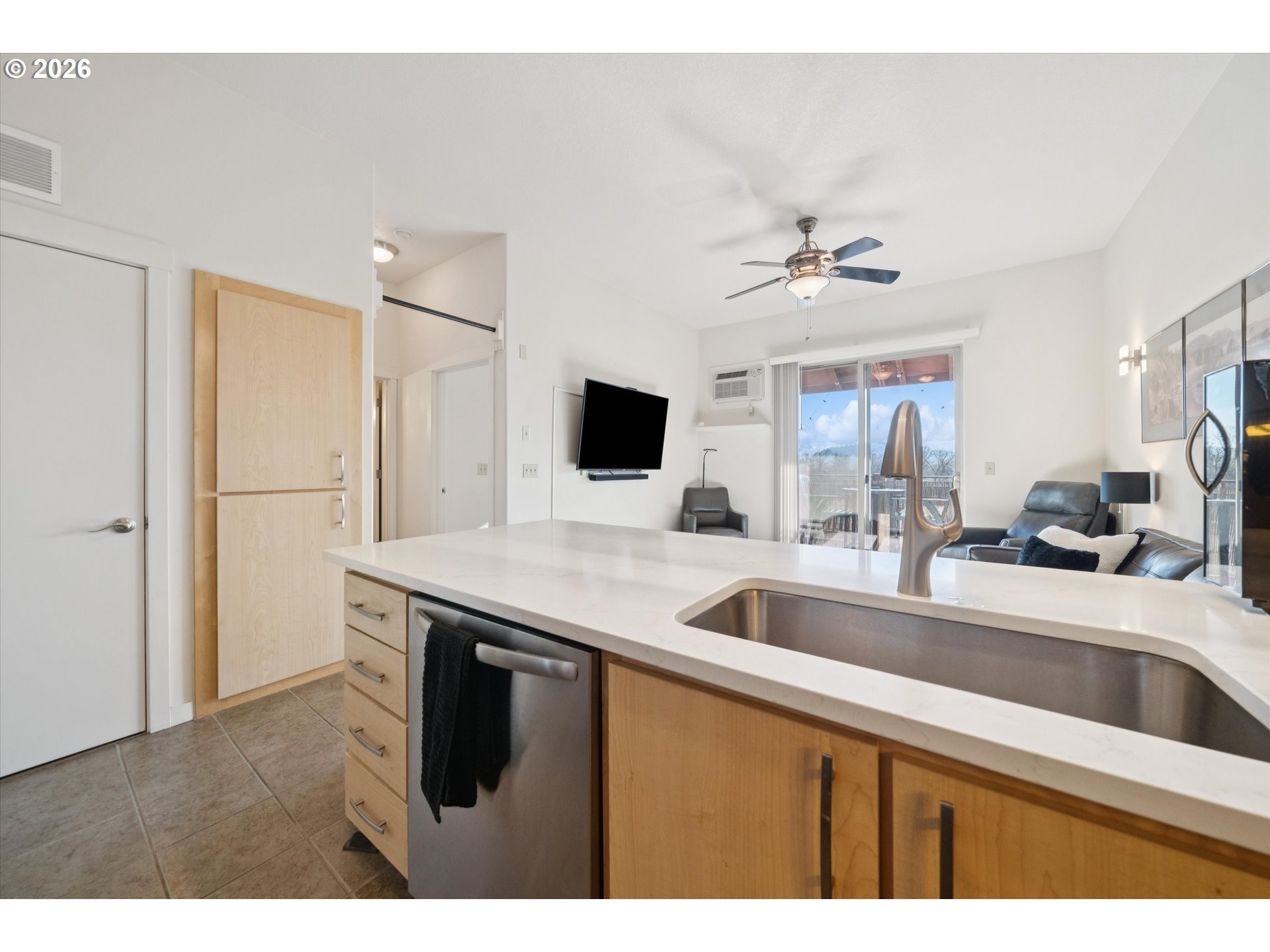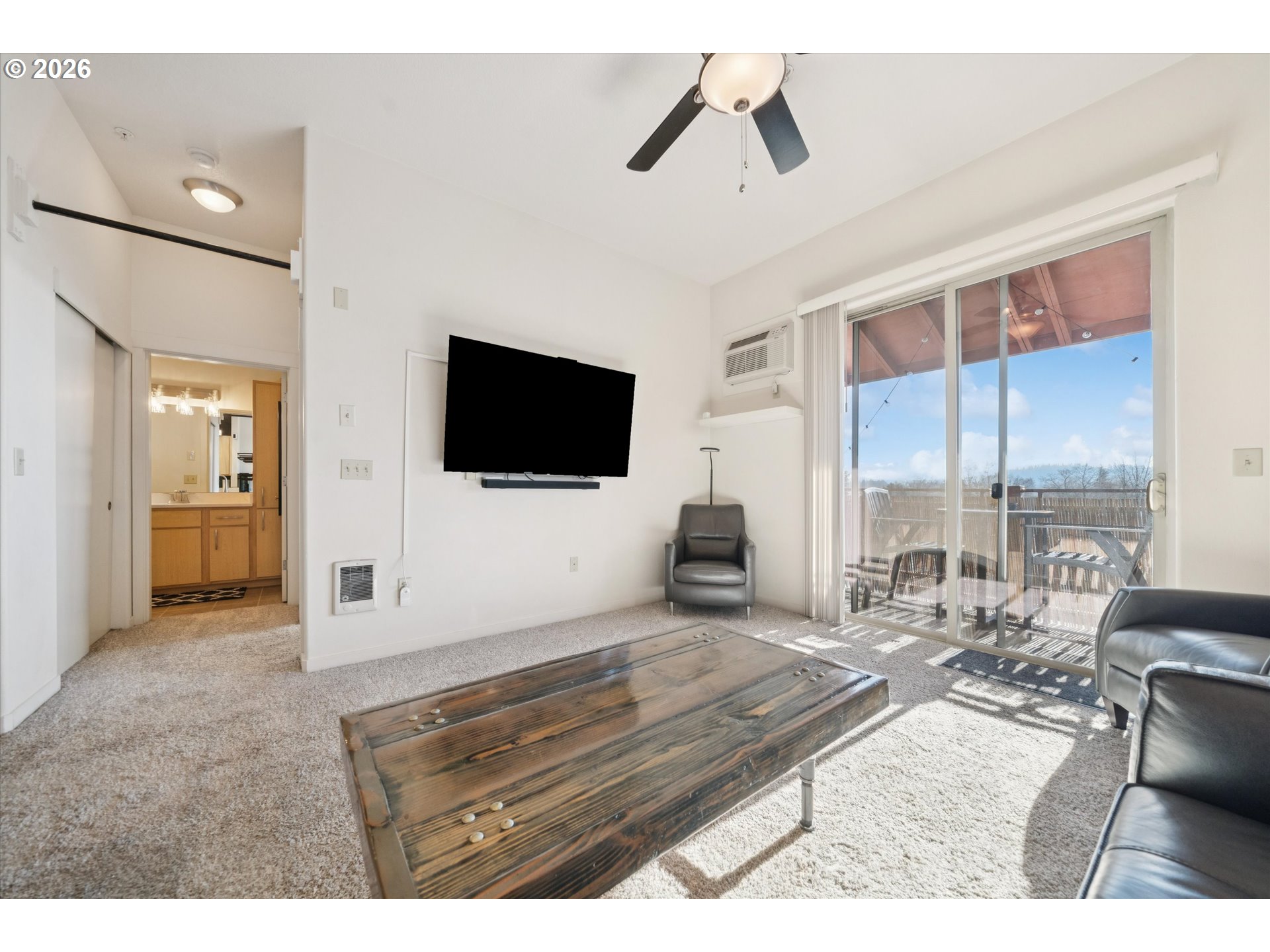 - Top-floor, end-unit condo offering added privacy, natural light, and views. Located in a newer building with secure entry. This unit features an open floor plan and high ceilings. The kitchen features updated stainless steel appliances, while both bathroom and kitchen are appointed with quartz countertops. Carpeted living and bedroom areas are complemented by tile flooring in the kitchen and bath.Additional features include newer air conditioning, wall heaters, ceiling fans, a newer water heater, and a sliding glass door leading to a spacious deck. Enjoy amazing views from the balcony! The unit includes one deeded, covered, secured parking space and a deeded and dedicated storage unit. In-unit wash/dry hook-up. Low HOA dues with access to on-site amenities, including a gym. Convenient location approximately 15 minutes to downtown, 20 minutes to the Columbia River Gorge, and close to freeways, golf, and Glendoveer tennis...don't miss it!