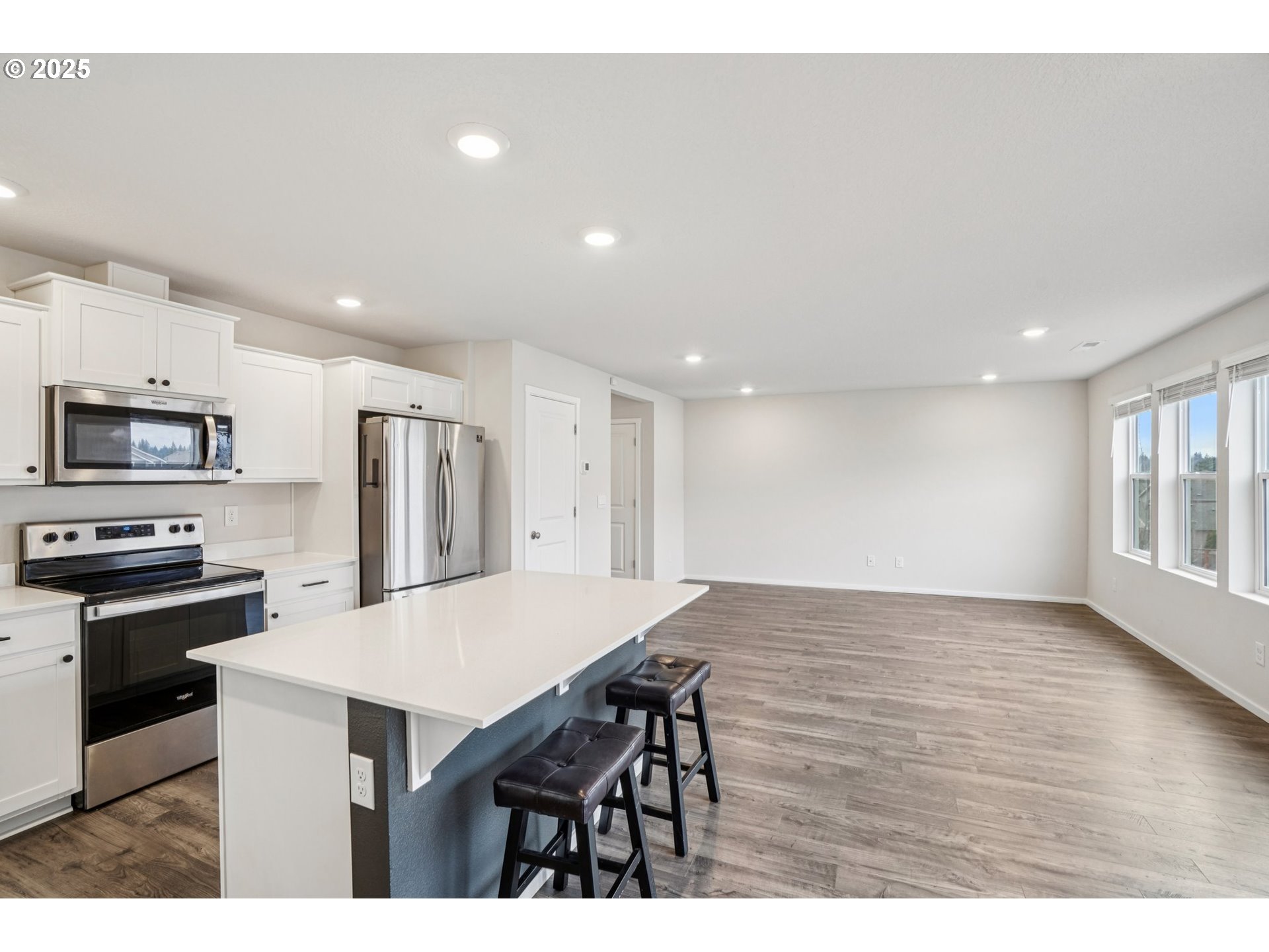 - Welcoming covered front porch with keyless entry leads into a bright, open great-room layout with seamless flow between the family room, dining area, and island/breakfast bar kitchen. The family room features recessed lighting and laminate flooring, while the kitchen offers stainless Whirlpool appliances—including a built-in dishwasher, microwave, and glass-cooktop range—plus a stainless Samsung refrigerator. Quartz countertops, abundant cabinetry with display space above, a walk-in pantry, and a generous island with breakfast bar create an ideal space for cooking and gathering. The adjacent dining area provides slider access to the back deck. Upstairs, the primary en-suite includes recessed lighting, LVP flooring, a walk-in closet, and an en-suite bath with single sink quartz vanity and shower. The upper level also hosts three additional bedrooms, a full bath with single sink quartz vanity and combo soak tub and shower, and a dedicated laundry room equipped with a Samsung washer and dryer. A convenient main-level powder room with pedestal sink serves guests. Interior highlights include an open great-room design, island/breakfast bar kitchen, stainless appliances, walk-in pantry, upper-level linen closet, and a blend of laminate, LVP, and carpet throughout. Outside, the home offers a covered front porch, back deck, and a fully landscaped corner lot with sprinklers front and back. The two-car garage adds comfort and practicality to this well-appointed property. Mortgage savings may be available for buyers of this listing.