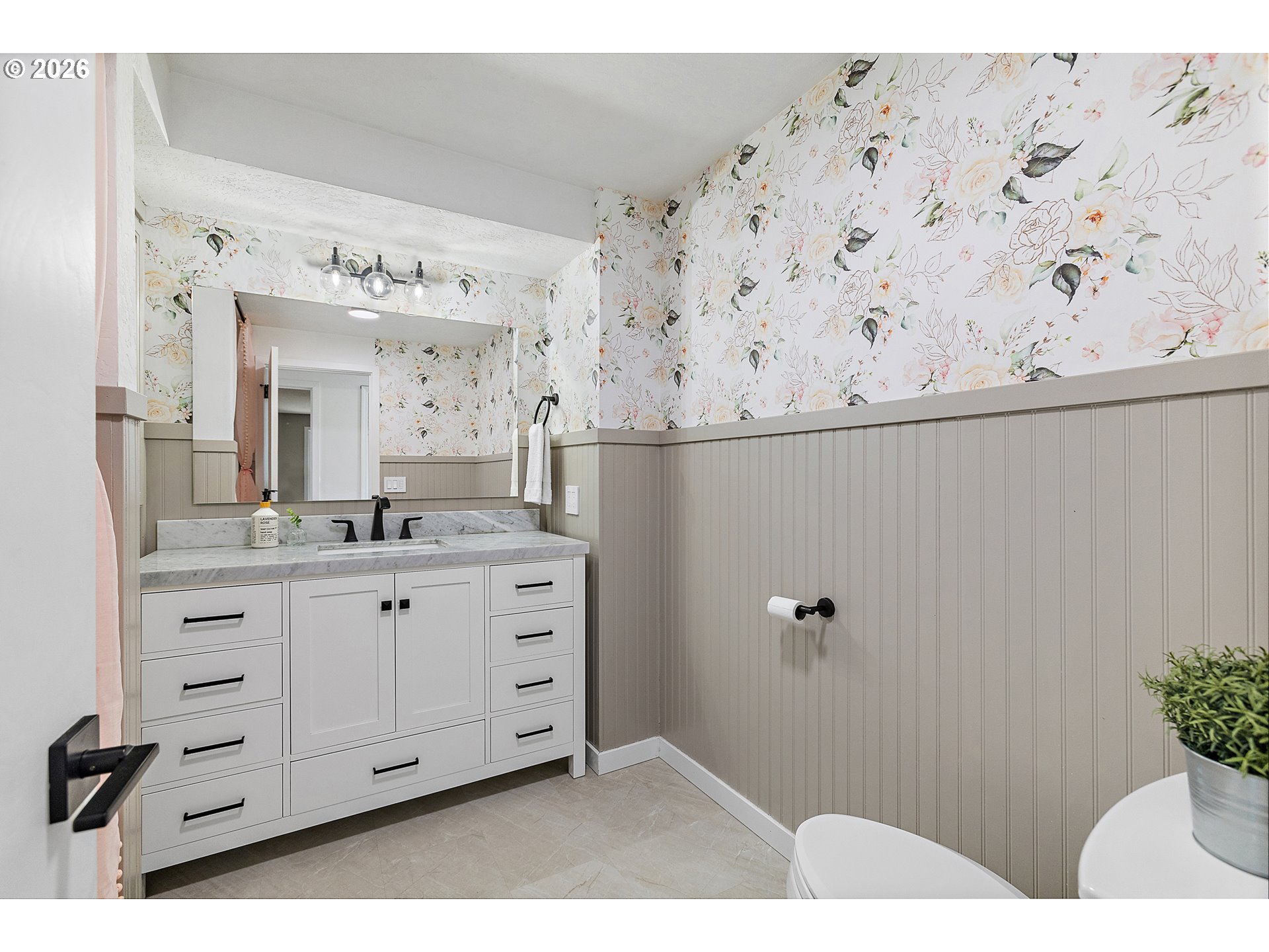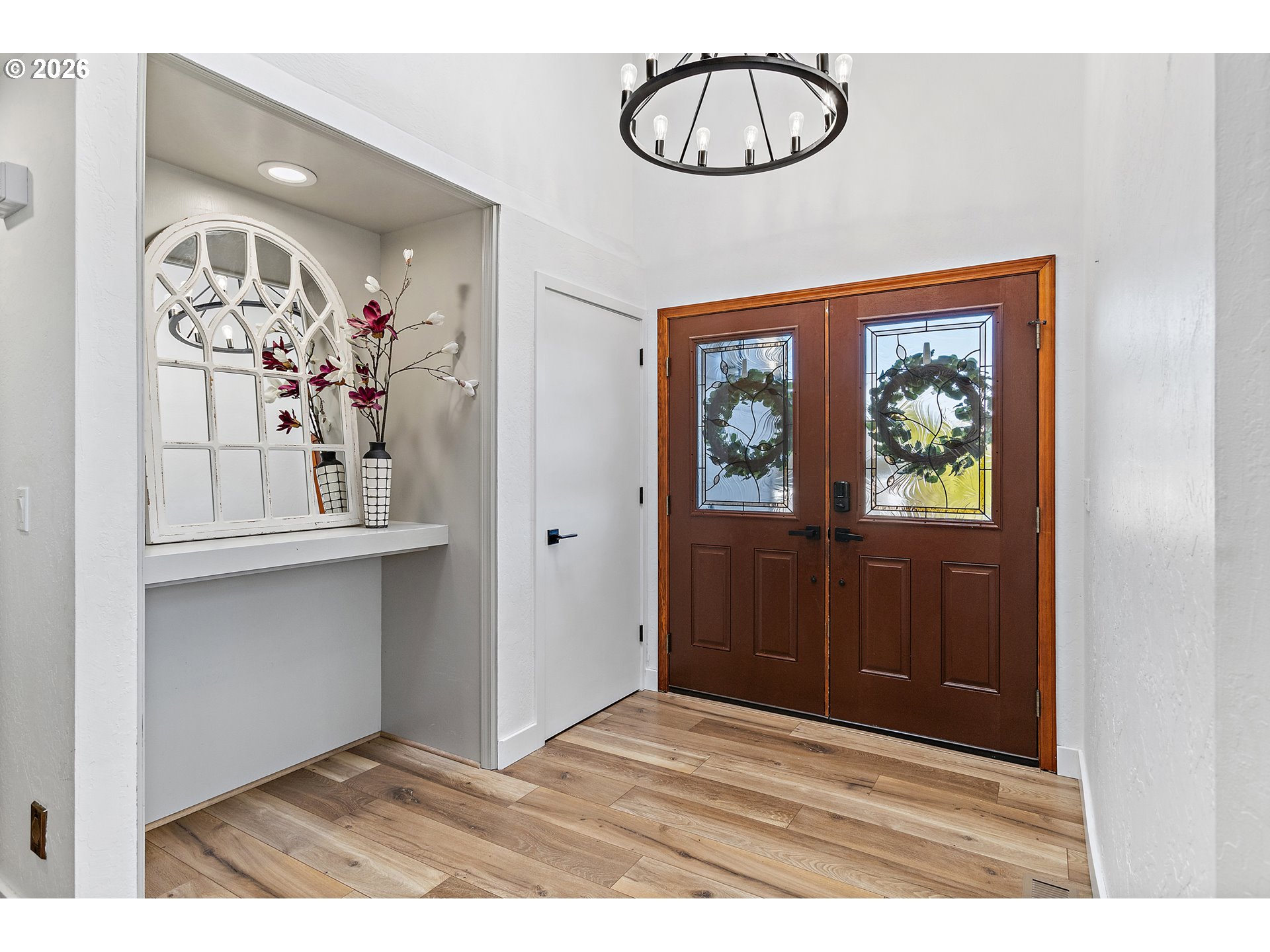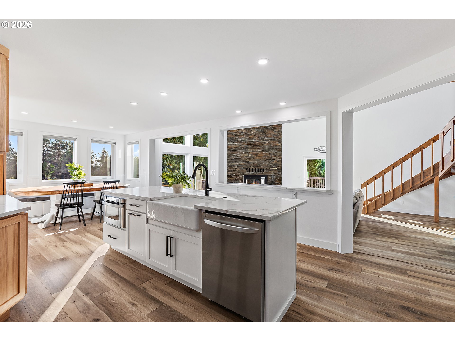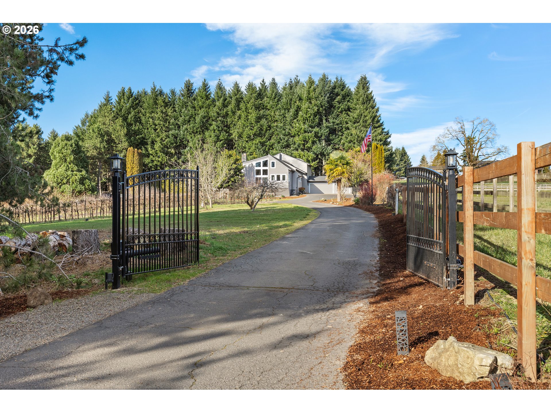 - A gated entry opens to a rare country oasis just off Stafford, where over five usable acres offer the privacy and space of rural living minutes from town. With easy access to I-5, I-205, Wilsonville, Tualatin, and West Linn, this property offers peaceful surroundings without sacrificing convenience.The home has been beautifully renovated with major updates throughout. A 50-year Presidential roof, skylights, and gutters (2021) were followed by a kitchen remodel with quartz countertops and high-end appliances, plus new LVP flooring (2022). In 2025, the home received new windows, sliding doors, exterior siding, paint, a stunning primary bedroom and bathroom renovation, and new mini-splits. Smart lighting and high-speed Xfinity internet add modern efficiency.The primary suite is a true retreat, featuring a spa-like bath with skylights, a statement shower, and a custom stone fireplace. A private deck offers a peaceful place to unwind, while the main living space is filled with light from floor-to-ceiling windows.The daylight basement features separate living quarters with an exterior entrance, living and dining areas, kitchenette, a second owner’s suite, an additional bedroom, and woodstove—ideal for multigenerational living or guests.The land supports an acreage lifestyle with mature grapevines and fruit trees, room for gardening and animals, exterior shed, wood storage, and an outbuilding suitable for animal shelter.Outdoor spaces include a deck off the main level and a covered patio with hot tub. Ample parking includes a 3-car garage, RV parking, and room for toys.Buyer to verify schools; currently within the new Frog Pond Primary boundary.