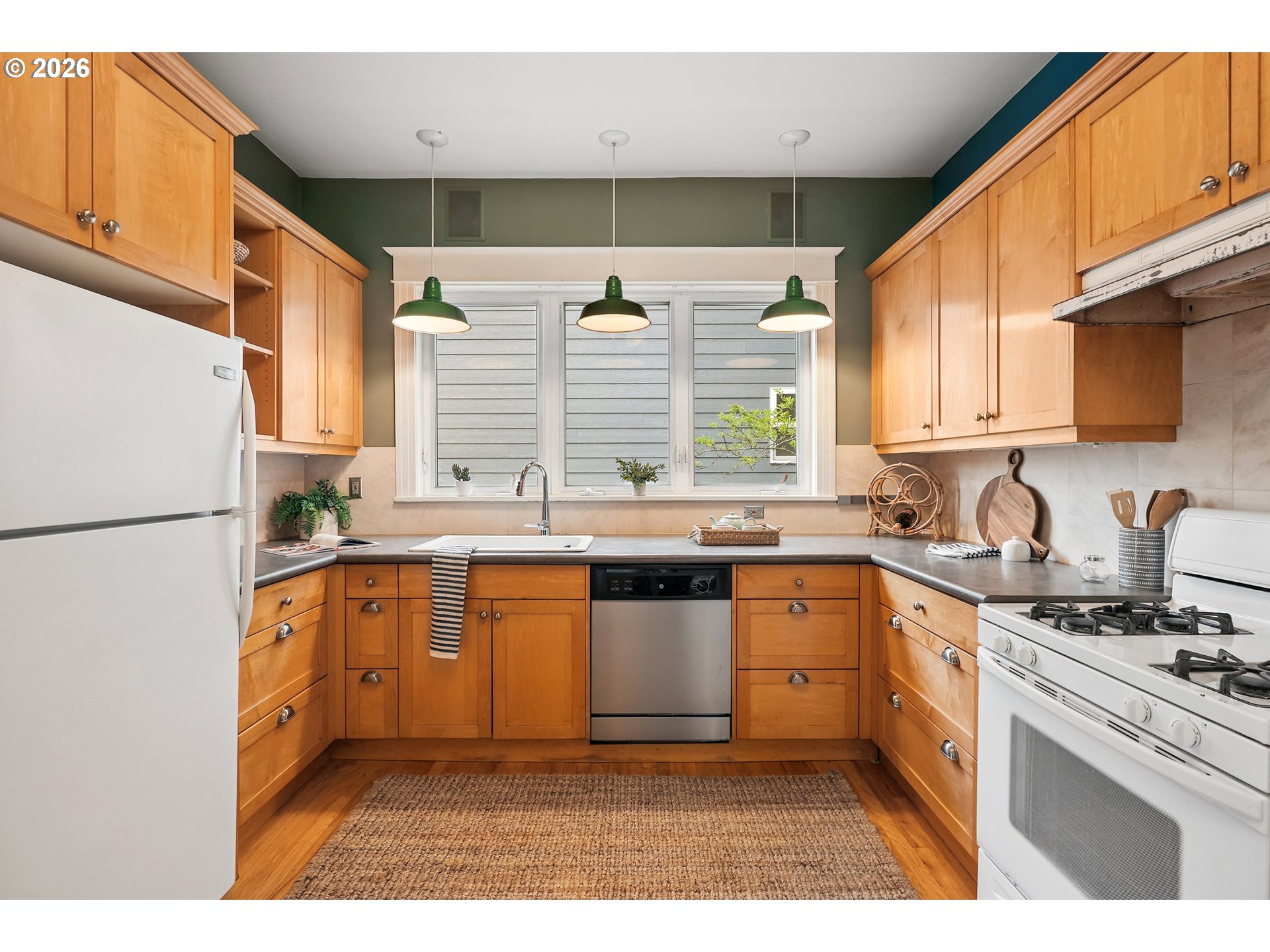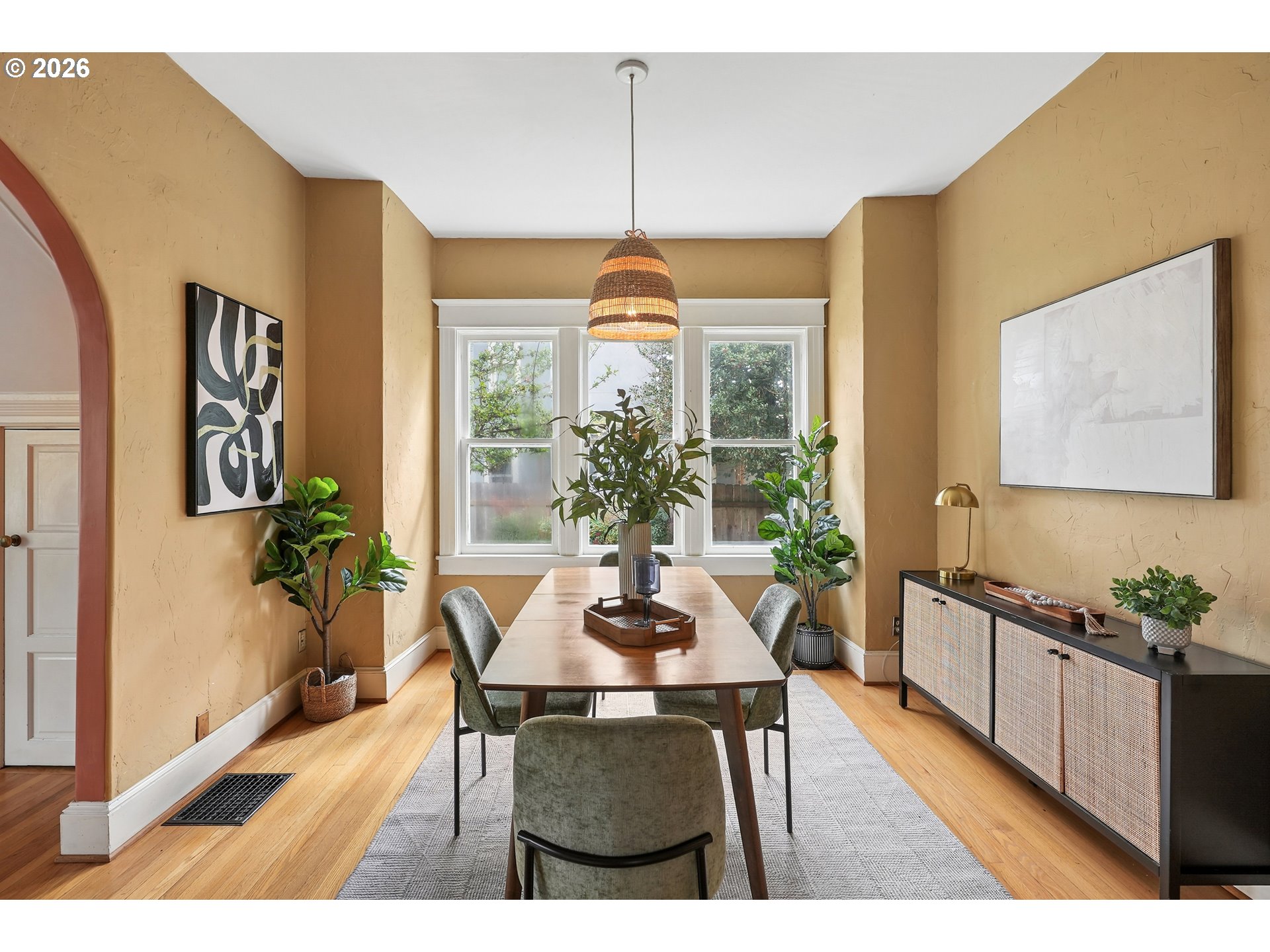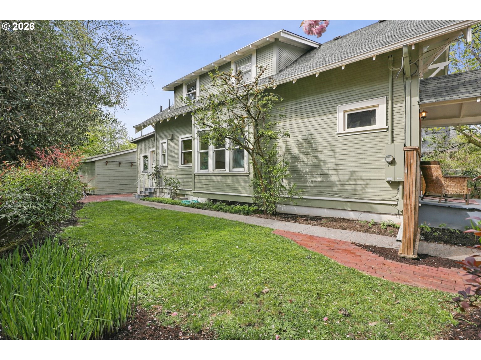 - Incredibly charming farmhouse just moments away from hot and happening downtown Montavilla. Enter through the quaint covered front porch and be greeted with an abundance of 1912 details. From the hardwood floors, built-ins, nooks and coved archways, this home has all the character to boot. Dining room is accompanied by soaring ceilings and main level bedroom, den or office. Enjoy the large kitchen with wood cabinets, modern light fixtures and attached nook ready for your ideas. Host dinner parties or sip your morning coffee from the back sun porch with a surround view of the backyard and darling brick patio. Upstairs, you'll find the primary bedroom with walk-in closet and vaulted ceilings along with 2 additional bedrooms and full bath. Rare alley-fed oversized 2-car detached garage is ready for all your toys and hobbies plus you'll be able to capitalize on the unlimited potential of this already blossoming fenced backyard space. Conveniently located and just moments from a plethora of some of Portland's favorite restaurants, cafes and shops not to mention the beautiful 176-acre Mt. Tabor park.